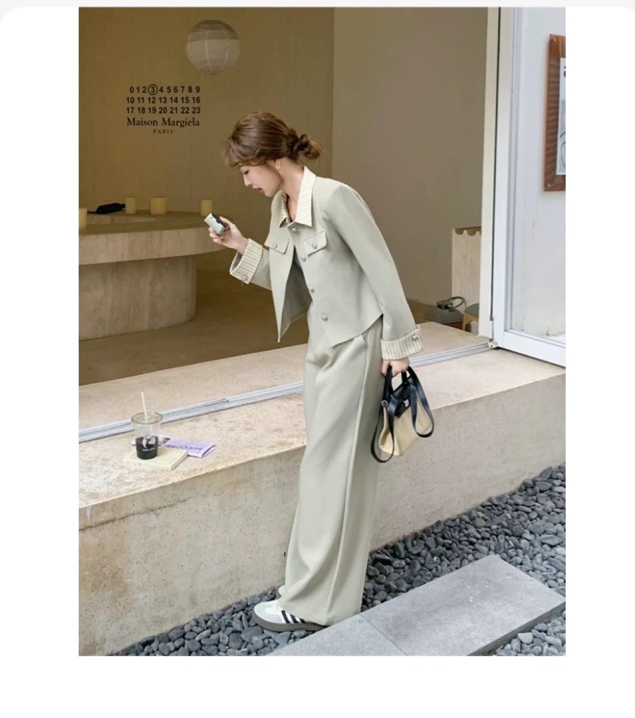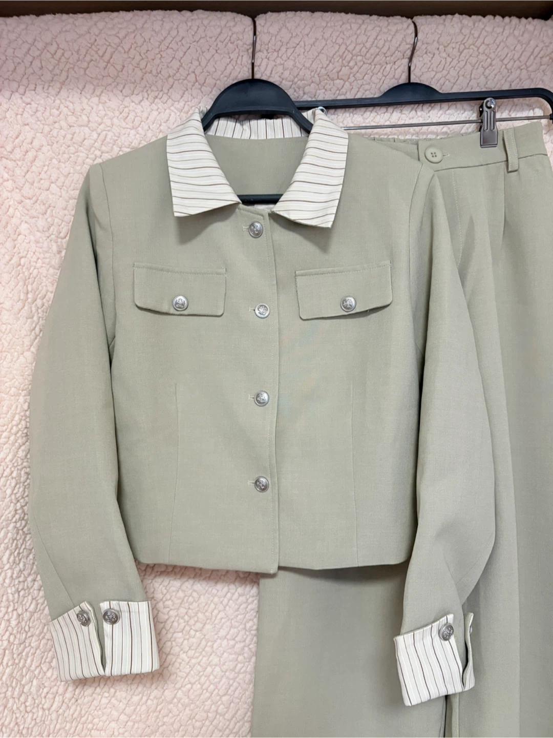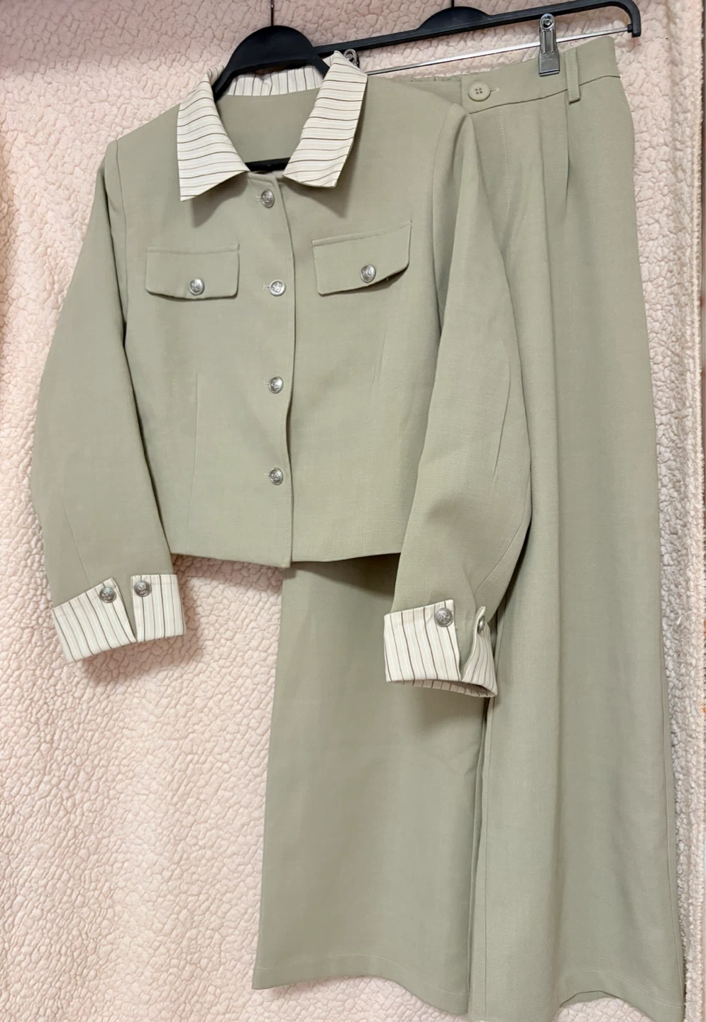 🤍 大人フェミニンなセットアップ(新品) 上品カラーで着るだけでこなれ感✨ 肩パッド入りでシルエットがとても綺麗です🤍 サイズ感 ・表記:S〜M(体感 M〜L) ・肩幅:43〜44cm(肩パッドあり) ・着丈(コート):88cm (※実物採寸) ・トップス:肩幅 39〜40cm / 着丈 55cm ・パンツ:総丈 99〜100cm / ウエスト 最大70cm 新品・タグなし|🌿 自宅保管のため、細かい点が気になる方はご遠慮ください。 即購入OK/お気軽にメッセージくださ 💌