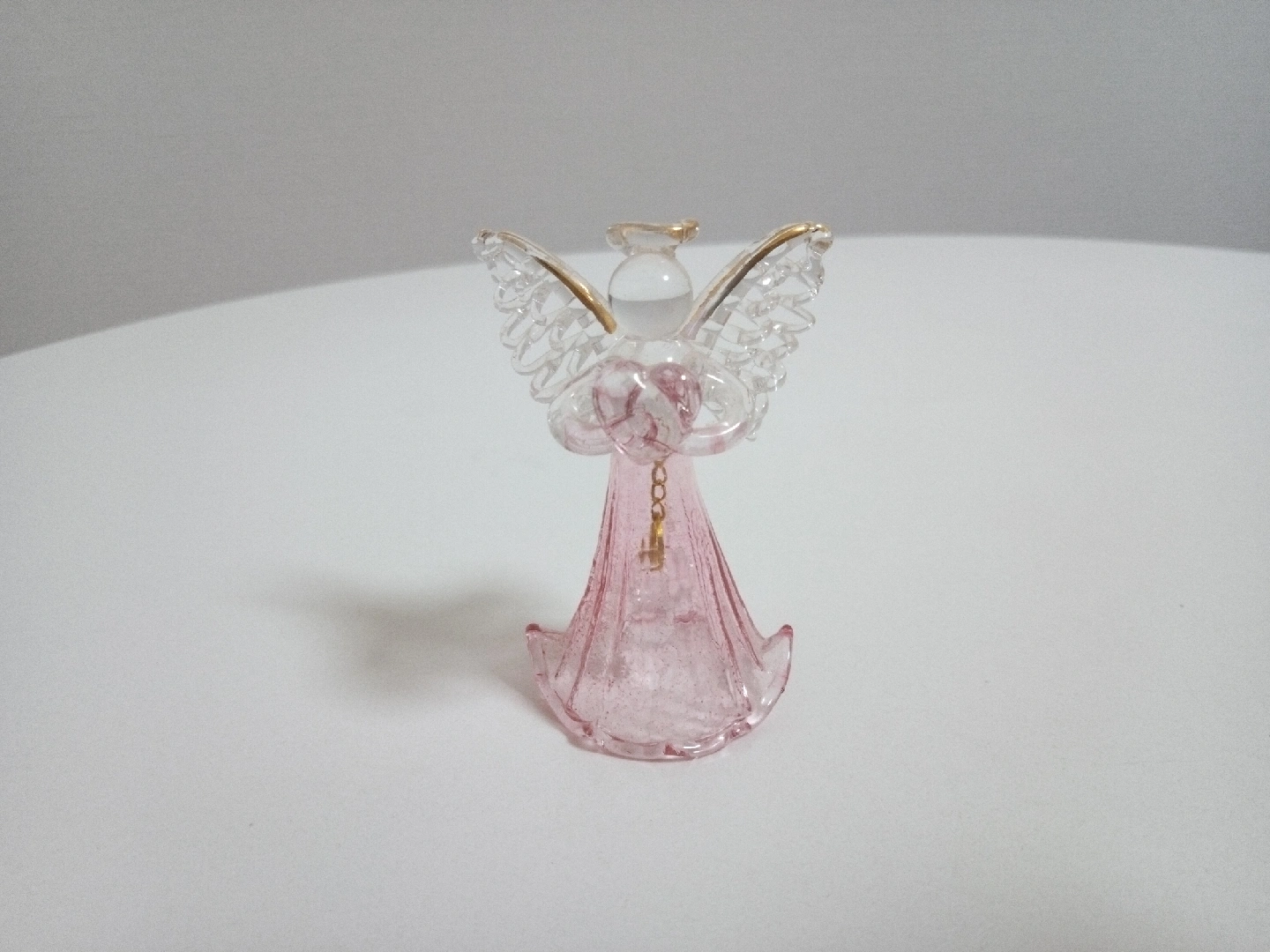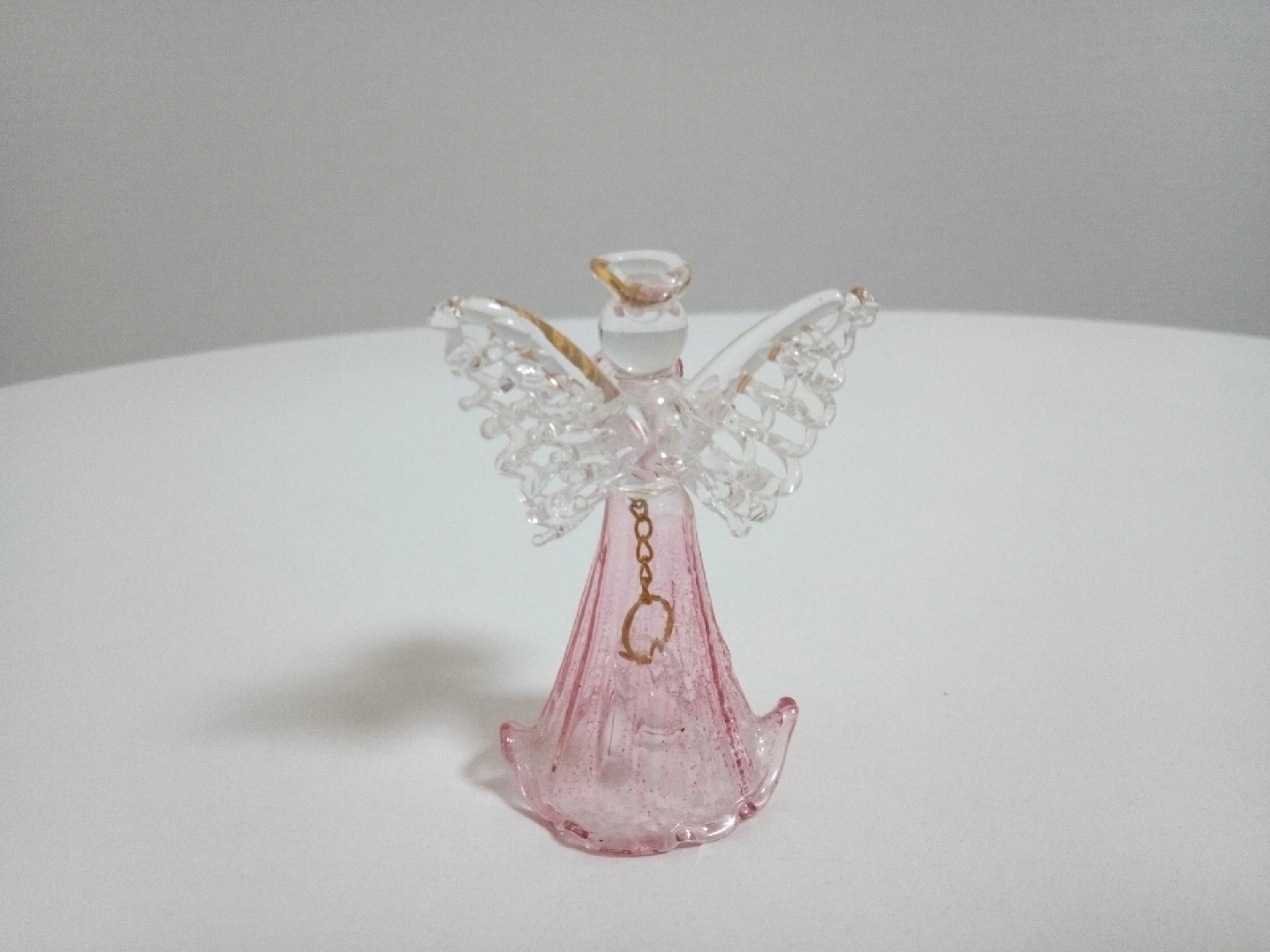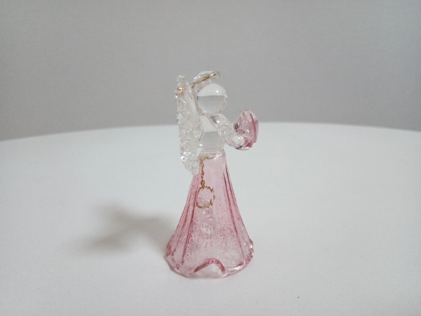 天使のガラス製置物です。 揺らすとベルが鳴ります。 ・色:ピンク、クリア ・状態:目立つ傷なし ・使用感少なめ 6 × 4 ( 一番大きい所の幅 ) × 3 ( 奥行き ) センチ 中古品であることご了承ください。