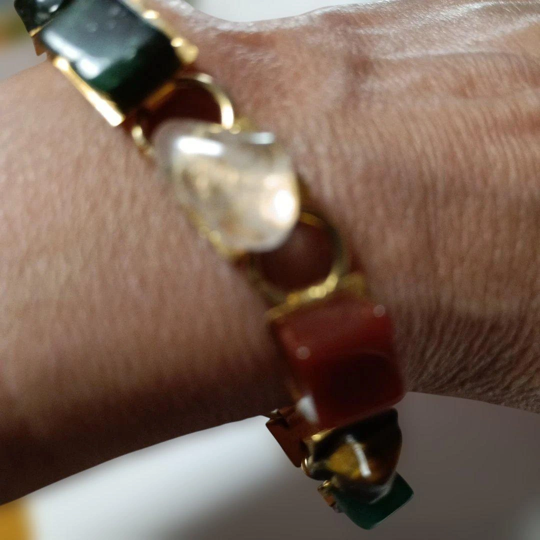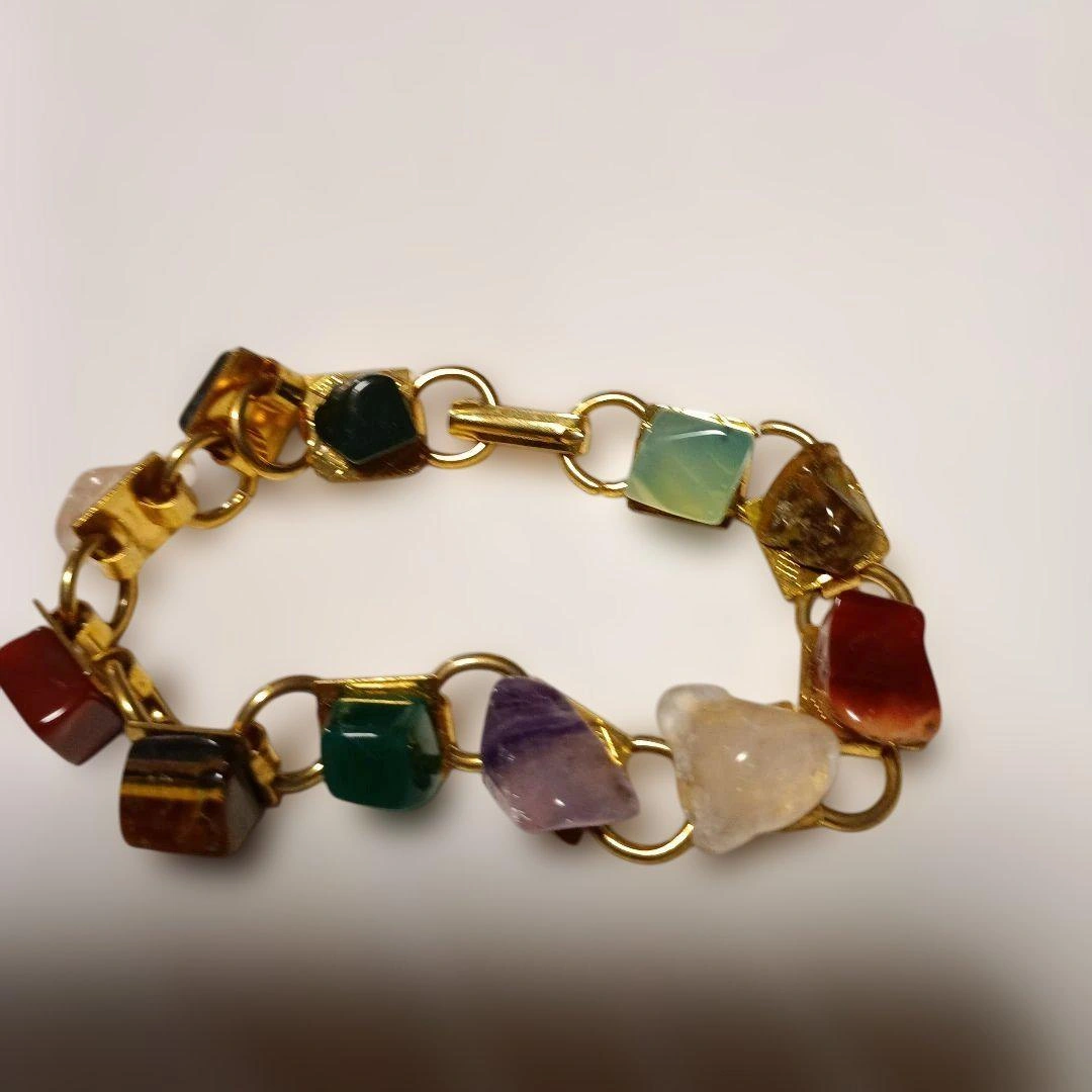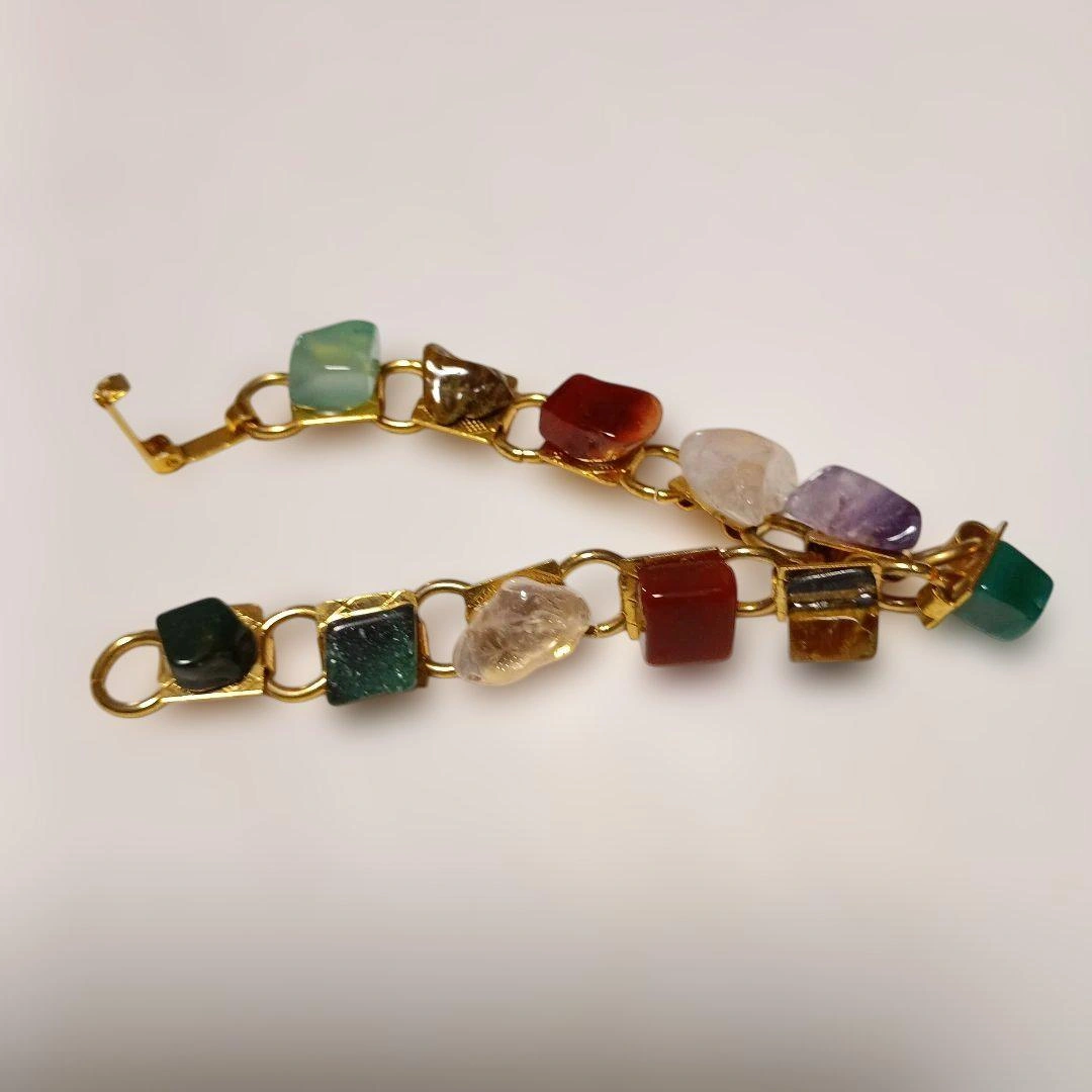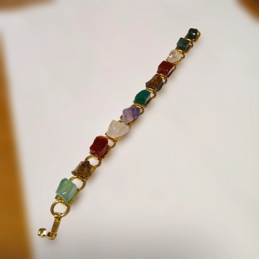 多色の天然石を使用したカジュアルなブレスレットです。フック留め具付き。 素材: 天然石と金属製のチェーン 色: 多色(緑、赤、紫、茶、透明など) スタイル: カジュアル 特徴: 天然石の不規則な形状 ご覧いただきありがとうございます。 ご希望の方はお気軽にご連絡ください。