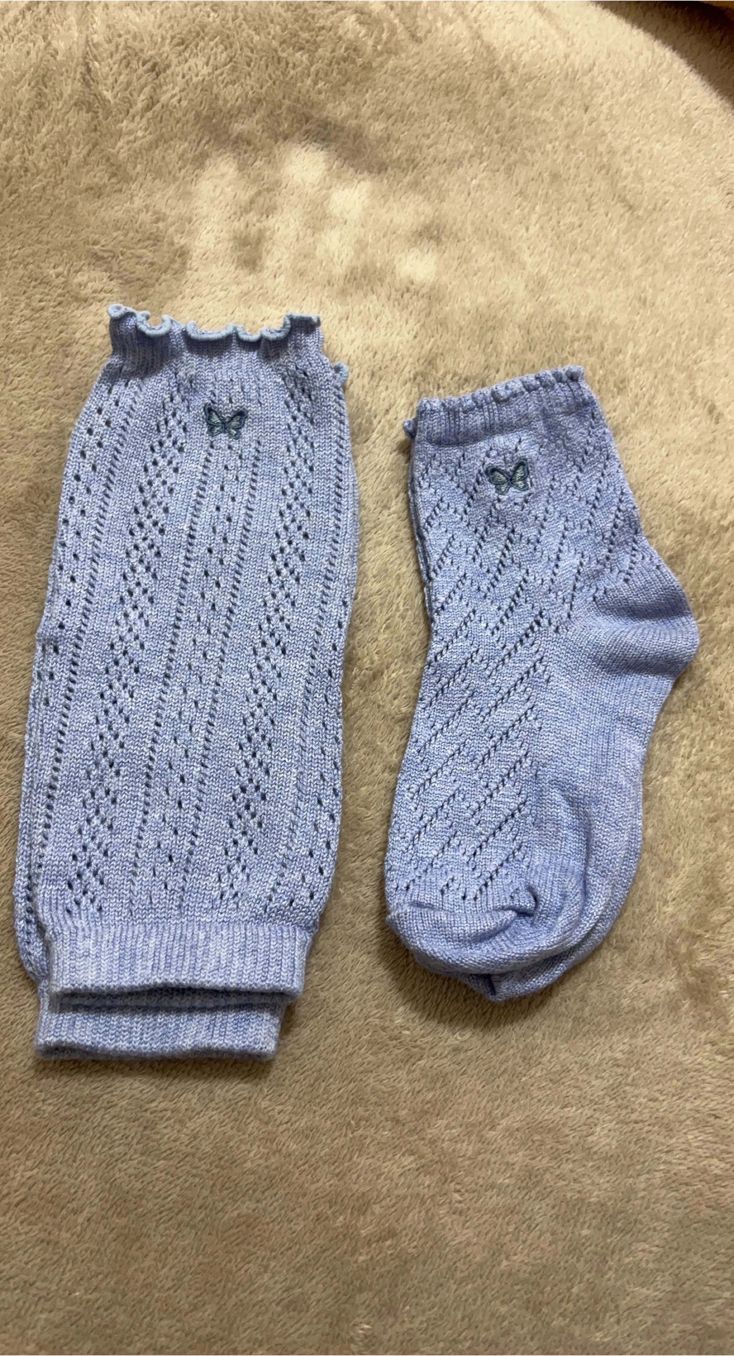 柔らかい手触りのレース網のソックスとレッグウォーマーのセットです。 ・色:濃い水色 ・柄:編み模様、蝶の刺繍 ・状態:使用感少なめ 旅行用に購入しホテルで使用1度のみの 比較的綺麗な状態です(^^) ご不明点があればお気軽にご連絡ください。