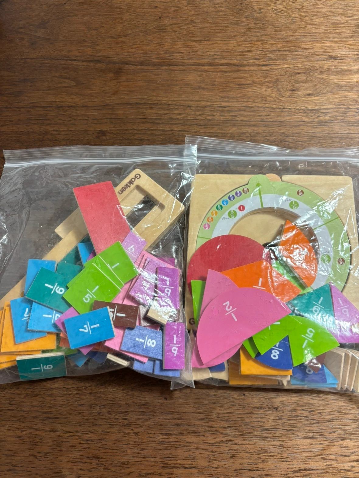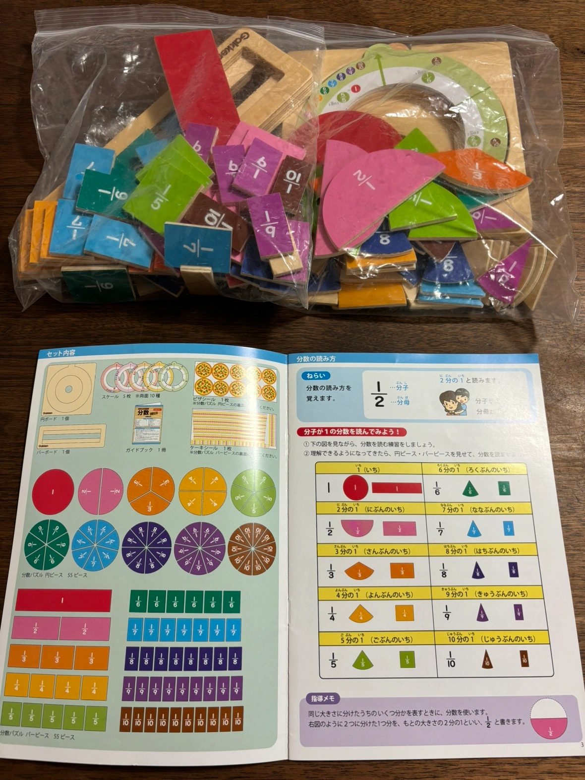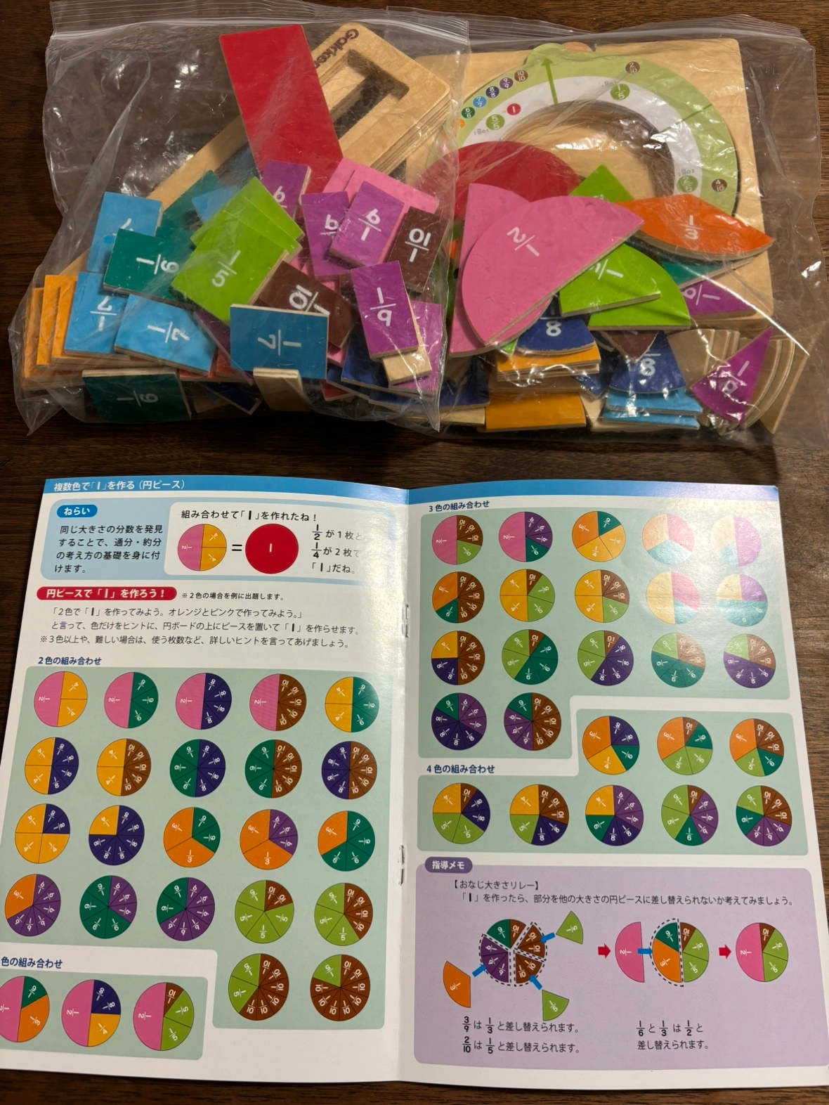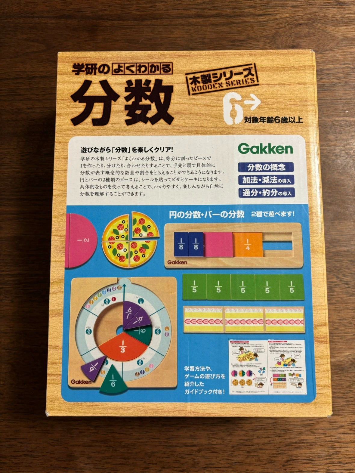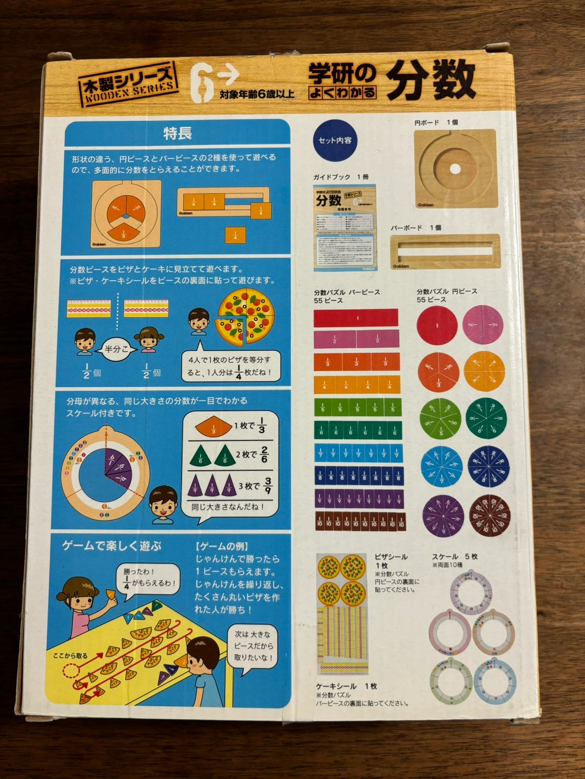 学研のよくわかる「分数」木製シリーズです。 円ピースと棒ピースを使って、分数を楽しみながら学べるシリーズです。 処分するのはもったいないと思えたため、欲しい方に差し上げます。 パーツはすべて揃っていますが、ピザシールとケーキシールは、粘着力が弱く、剥がれてしまうので、あえて全部剥がしてあります。 箱に傷みがあり、使用感がありますが、小さい子に、分数の概念をわかりやすく視覚的に説明できるツールだと思います。 しばらく様子を見て、ご要望がなければ、取り下げて処分しますので、ご希望の方は早めにご連絡ください。