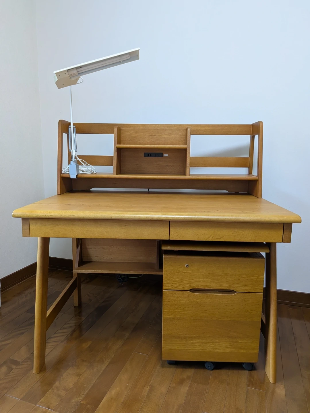 木製の、袖机付き学習机 「大塚家具」で購入した商品です。 机上面はゆったりとした広さで作業がしやすく、飽きのこない長く使用できるデザインです。 二つのコンセットが付いた可動式の棚が備えられ、自由に設置場所を選べます。 また袖机は、二段階の高さ調節付きになっており、収納力も優れています。 こちらの学習机は、同じ商品が二台 あります。 二台同時購入は、二台/40,000円で提供させていただきます。 また、デスクについておりますライトはサ−ビスいたします。