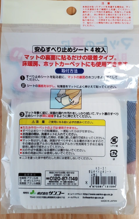 【商品について】  ・安心すべり止めシート 【状態について】  ・1枚使用しているので残り3枚です   【金額】  ・30円 【受渡し】  ・「ウエルシア江戸川西瑞江店」駐車場にてお渡しいたします 何かわからないことがございましたらお気軽にお問い合わせください。