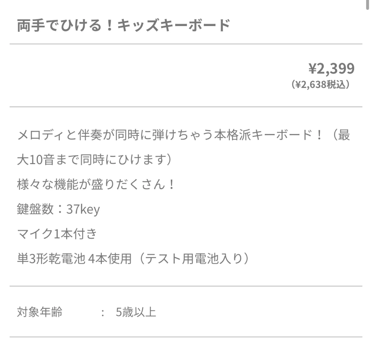 西松屋 キッズキーボード 2025年に新品で購入しました 定価2638円 両手でひける!キッズキーボード ¥2,399 (¥2,638税込) メロディと伴奏が同時に弾けちゃう本格派キーボード!(最大10音まで同時にひけます) 様々な機能が盛りだくさん! 鍵盤数:37key マイク1本付き 単3形乾電池 4本使用(テスト用電池入り) 対象年齢 :5歳以上 アンパンマンが大好きで祖父母からアンパンマンのピアノをいただいてこちら使用しなくなったためお譲りします。 新品で購入してからあまり使用していないので、使った時間の合計でいうと2時間にも満たないくらいかと思いますが 1歳児が使用したものかつ、中古品かつ自宅保管となりますので、若干の保管傷などがあります。神経質な方や完璧を求める方は購入をご遠慮ください 詳しい状態についてはお写真にてご確認をお願いいたします。 中古品にご理解いただける方のみご購入をお願いします。 トラブル防止のため、 電池4本つきで、当日お会いした際に動作確認の上のお渡しをお願いします! おまとめ買いで割引しますのでお気軽にメッセージいただければと思います