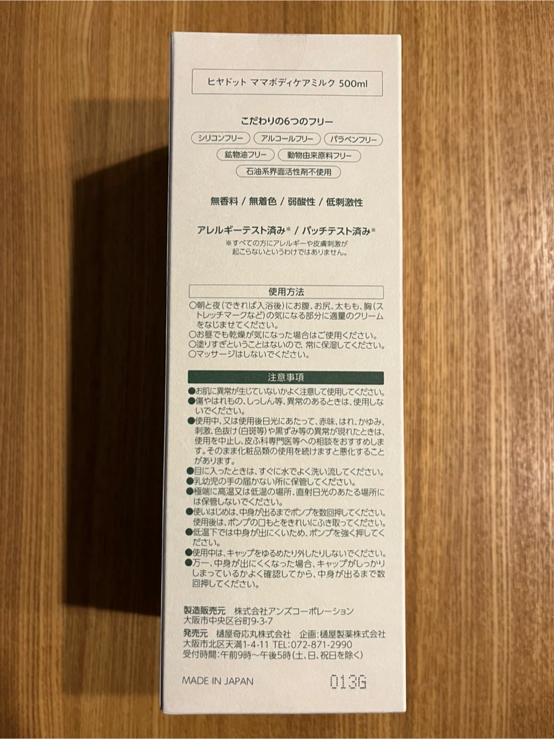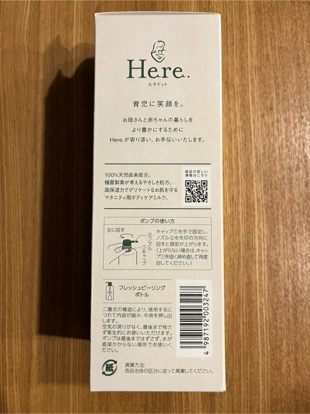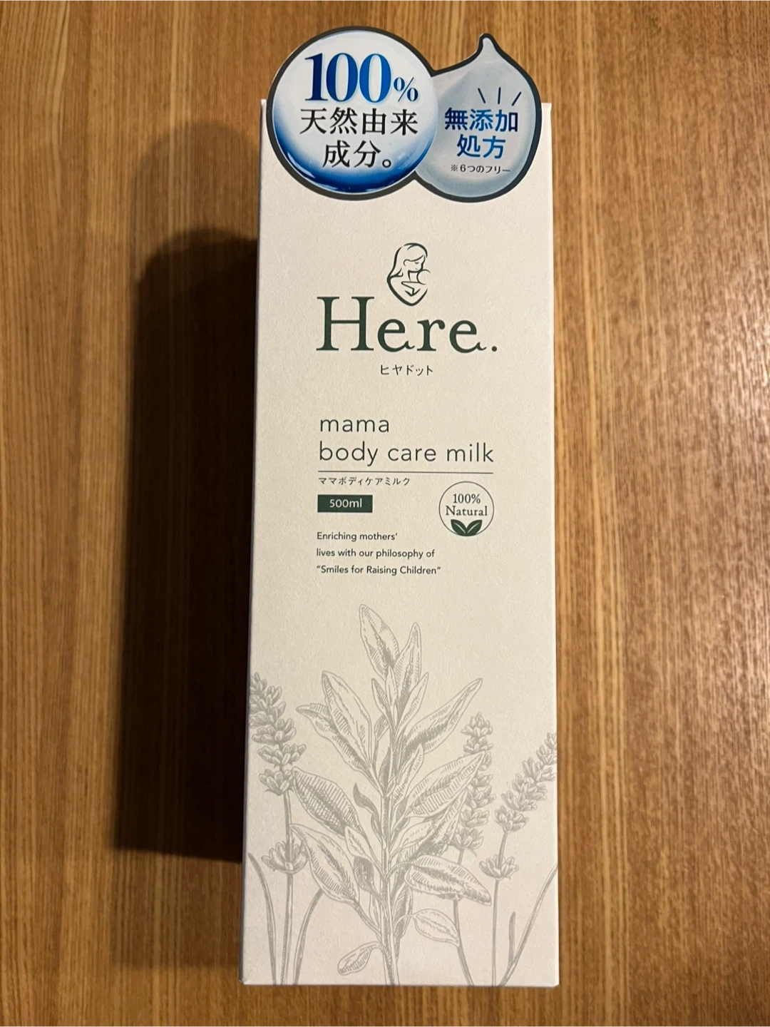 Here. ヒアドット ママボディケアミルク 500ml 新品未使用未開封 1.妊娠初期からデリケートなお肌を守る「100%天然由来成分」+「オーガニック美容成分」配合 2.妊娠中に敏感になりがちなお肌やニオイに配慮した設計。6つのフリー シリコン・アルコール・パラペン・鉱物油・動物由来原料・石油系界面活性剤。+4つのやさしい処方 無香料・無着色・弱酸性・低刺激性 3.浸透保湿能力の高い「液晶乳化製法」を採用 ・乳化粒子径が通常1~15に対し、0.1~1 ・お肌の親和性が高い水性レシチン採用。肌なじみと高い浸透性が特徴