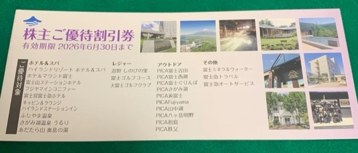 株主ご優待割引券です。 ※レストラン等では精算時に割引券を渡すだけなので簡単です。 ・有効期限:2026年6月30日まで ・ホテル、レストラン、レジャー施設など でお使いいただけます。 富士急行 株主優待 割引券 1冊です。 レストラン等で使用するだけでも元がとれます♪ 写真は ハイランドリゾートホテル&スパのランチビュッフェと富士急ハイランドです。 一部抜粋 •富士急グループホテル飲食割引券 5枚 レストラン・バー10%割引(1枚につき4名様まで有効) •ふじやま温泉割引券 2枚 平日 大人1,000円 小人500円 土日祝日 大人1,300円 小人650円 •富士急トラベル 2枚 パッケージ旅行代金の3%割引(1枚につき4名様まで有効) などなど 詳しくはhttp://www.fujikyu.co.jp/soumu/investors/index.html#inv_info