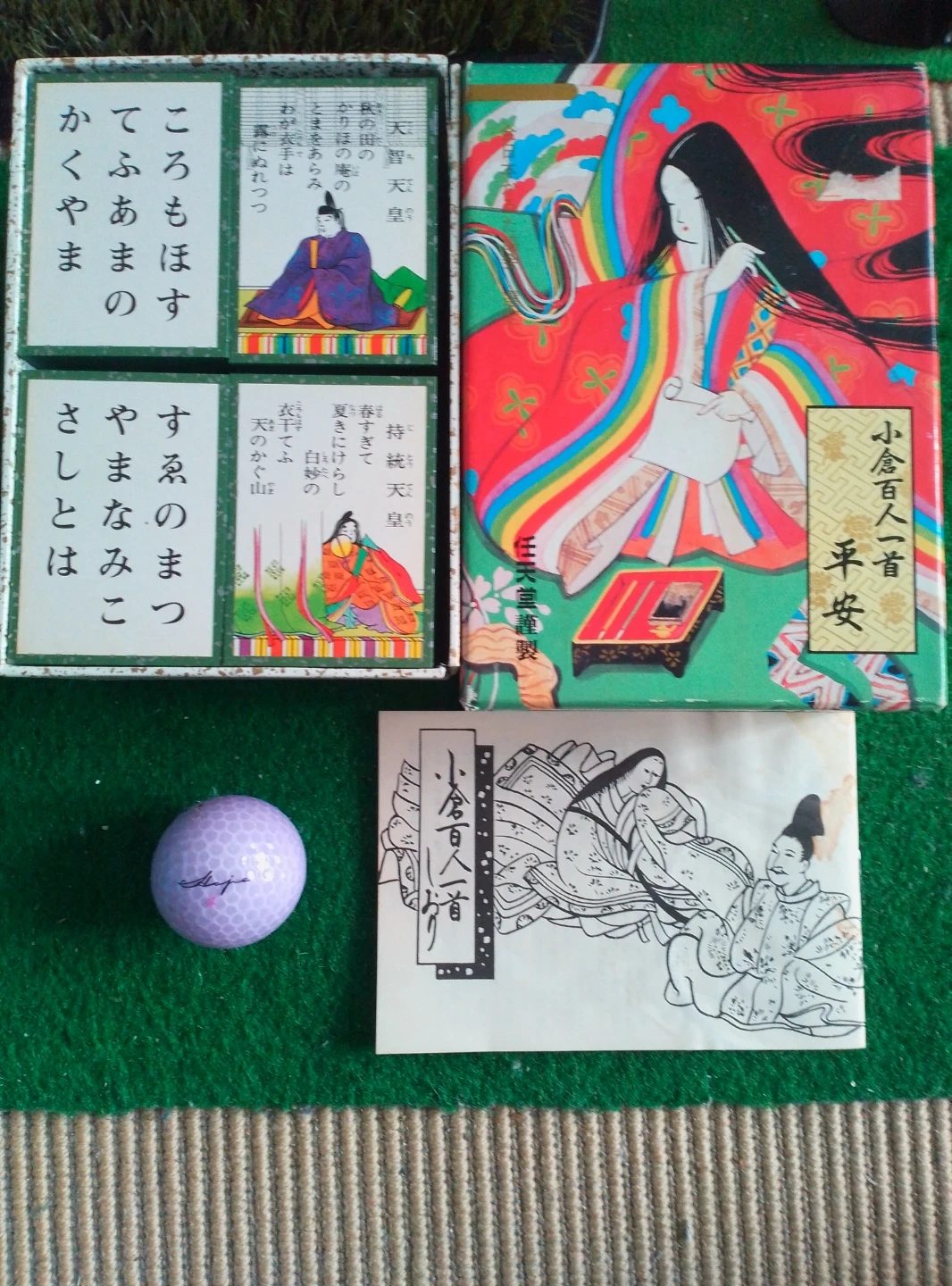 小倉百人一首のようです 【情報】 種類:小倉百人一首 【状態】新品未使用 百人一首のカードとカラフルなイラストの解説書がセットになったボードゲーム。 ※説明書シミ有 - 内容物: 百人一首のカードと解説書 - デザイン: カラフルなイラストが施された表紙 - 付属品: ゴルフボールのような小物が含まれる - 状態: 外装に目立った傷や汚れなし ゴルフボールは付いてません。 ご覧いただきありがとうございます。