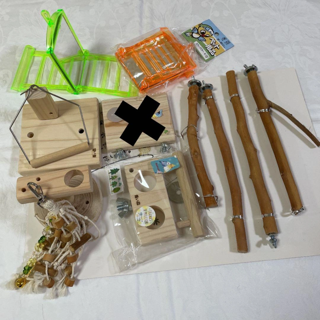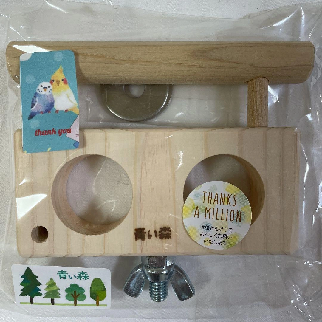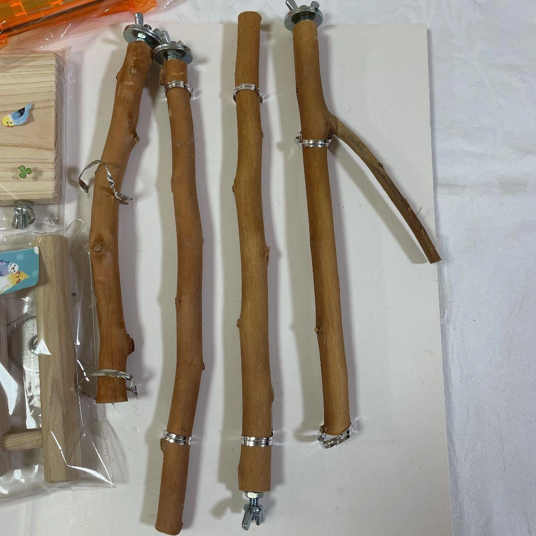 小鳥用品 7種11点です。 ★ヒバ3本、梨木1本の止まり木  1本設置しましたが、止まっていません。  未使用3本 ★スイングミラー2コ  黄緑は一度洗って設置しましたが、拒否されました。  オレンジは未使用です。 ★ケヤキ、栗のおもちゃ  設置しましたが、怖がってお家に入りませんでした。 ★木のブランコ  しばらく設置しましたが一度も乗りませんでした。 ★止まり木(ヒバ)付き餌入れ(檜)2コ付き  止まり木が太すぎたので未使用 ★丸い台【ケヤキ】の粟穂ホルダー【檜】支柱は【ヒバ】  餌入れが小さいので合う容器がないので未使用 ★壁掛けホルダー【檜】  おやつ入れに使用しようと思いましたが丸が小さく合う容器がない為未使用 臆病で色物を受け付けないインコに購入した物です。 お使い頂ける方がおられましたらお願い致します。 ※バラ売り不可 ご希望の方はお気軽にご連絡ください。