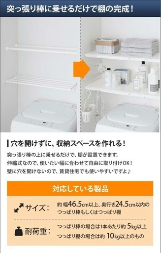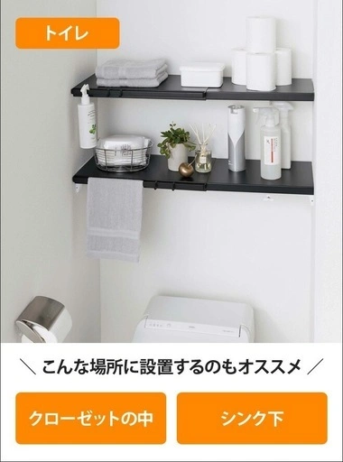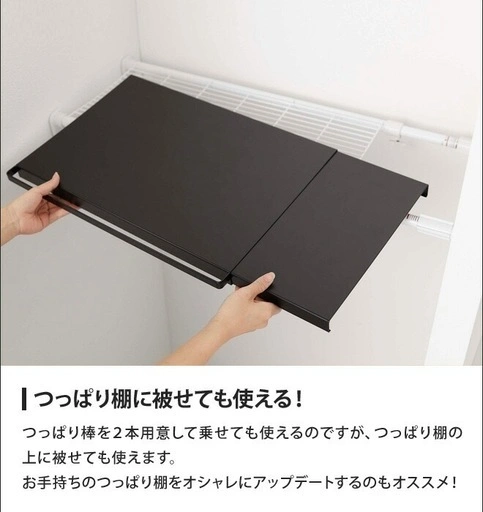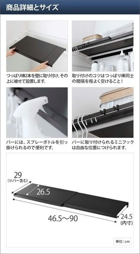 画像と説明文の一部は購入先からお借りしています。 突っ張り棒だけでは生活感や安っぽさを感じる方に。 突っ張り棒だけだと間から小さな物が落下して困っている方に。 3ヶ月くらいしか使ってませんが汚れ有ります。高い所に設置したり、物を置いたりしたら気にならないかと思いますが、使用感や汚れや嫌な方はご遠慮ください。 現物は5枚目の写真となります。 スチール製で重さはあります。 ■仕様 ブランド tower(タワー) サイズ [外寸]約幅46.5〜90×高さ3×奥行き26.5(cm) [バーを含めた奥行き]約29(cm) [奥行き内寸]約24.5cm 重量 約2kg 素材 スチール(粉体塗装) 耐荷重 ご使用のつっぱり棒・つっぱり棚の耐荷重から本製品の重さ(約2.4kg)を引いた重さ 対応製品 約幅46.5cm以上、奥行き24.5cm以内、耐荷重10kg以上のつっぱり棒・つっぱり棚 ※つっぱり棒の場合は、1本あたりの耐荷重が5kg以上であること。 注意 ・つっぱり棒やつっぱり棚は付属いたしません。お客様ご自身でご用意ください。 ・お使いのつっぱり棒やつっぱり棚の耐荷重をご確認の上ご使用ください。また、耐荷重制限は必ずお守りください。 ・つっぱり棒・つっぱり棚のサイズや形状によっては収納できないものもあります。 ご希望の方はお気軽にご連絡ください。