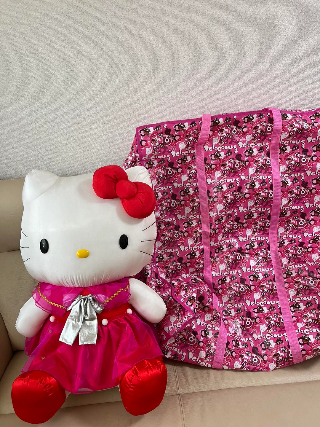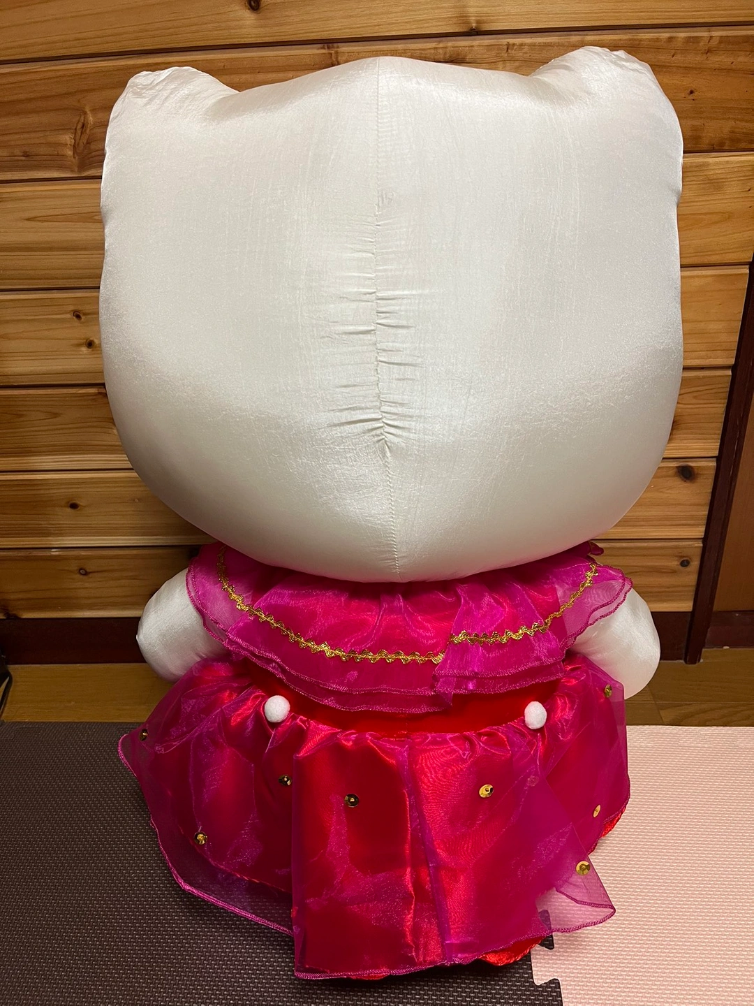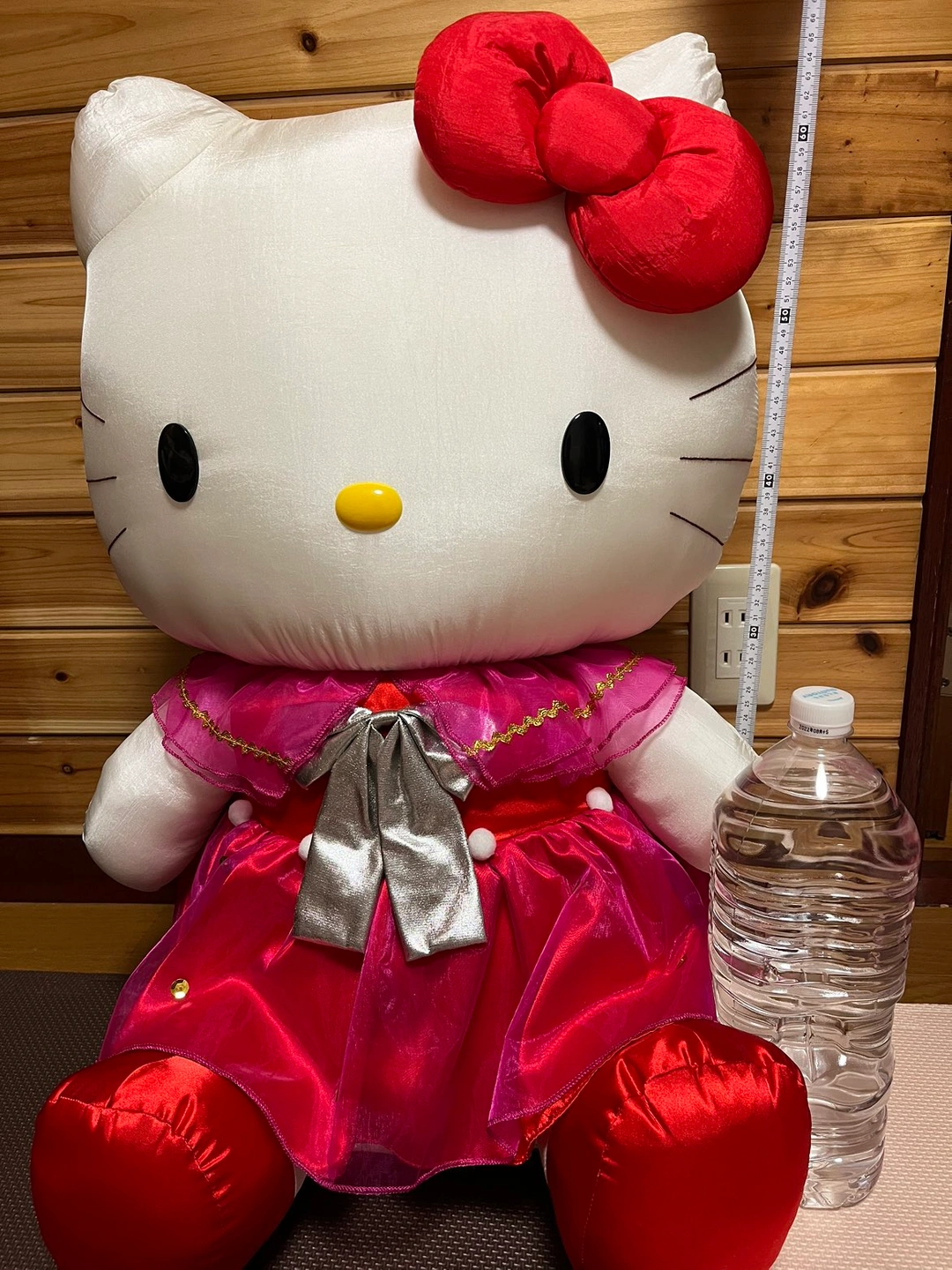 こちらは、何かご購入していただいた方に お譲りしたいと思います。 キティちゃんのぬいぐるみです。 3枚目の写真に大きさの比較として2リットルのペットボトルとメジャーの長さの写真を撮りましたので 大きさは、そちらでご確認ください。 こちらは、自宅保管でビニールにいれて保存しておりましたが 少しのヤケとお尻の部分に少しシミあります。(下なので、置いているとわかりません) 4.5枚目の写真でご確認下さい。 ピンクのバッグに1箇所、切れてる部分あります。 写真6枚目にてご確認下さい。 袋として使用す る分には問題ありませんので こちらに入れてキティちゃんのぬいぐるみをお渡し致します。 6枚の写真でご確認いただき こちらが気にならない方、よろしくお願いします。