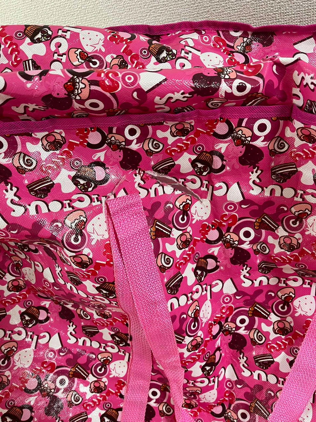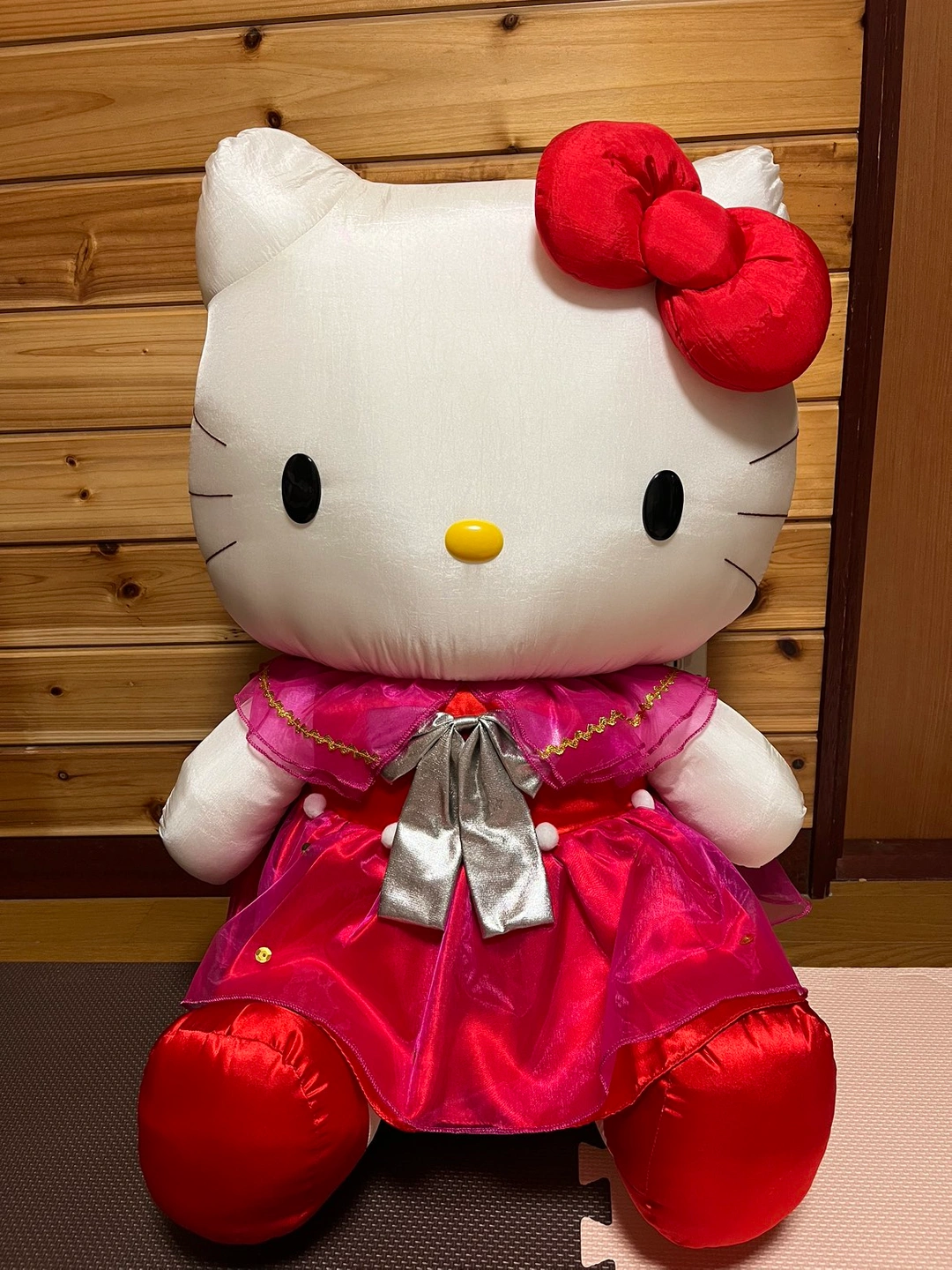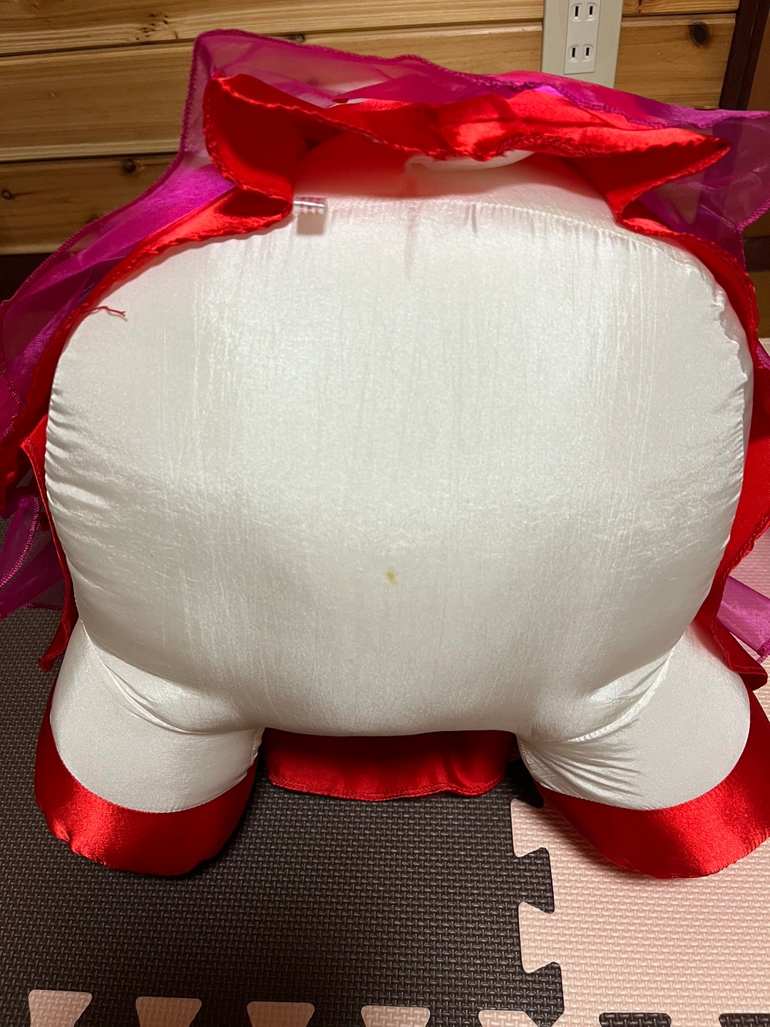 こちらは、何かご購入していただいた方に お譲りしたいと思います。 キティちゃんのぬいぐるみです。 3枚目の写真に大きさの比較として2リットルのペットボトルとメジャーの長さの写真を撮りましたので 大きさは、そちらでご確認ください。 こちらは、自宅保管でビニールにいれて保存しておりましたが 少しのヤケとお尻の部分に少しシミあります。(下なので、置いているとわかりません) 4.5枚目の写真でご確認下さい。 ピンクのバッグに1箇所、切れてる部分あります。 写真6枚目にてご確認下さい。 袋として使用す る分には問題ありませんので こちらに入れてキティちゃんのぬいぐるみをお渡し致します。 6枚の写真でご確認いただき こちらが気にならない方、よろしくお願いします。