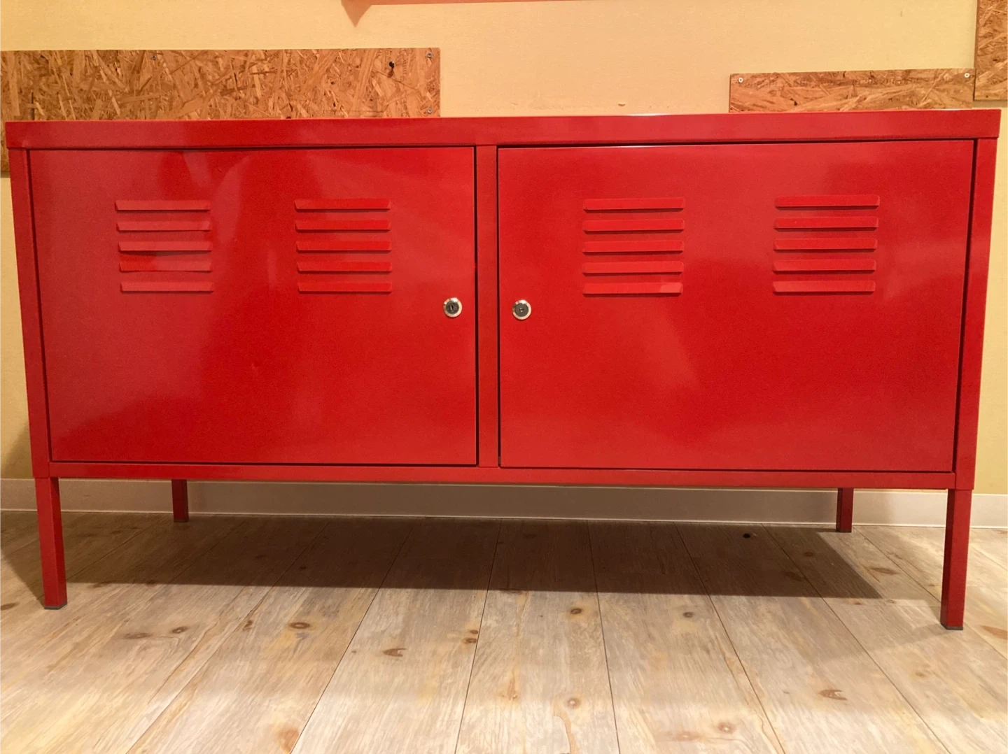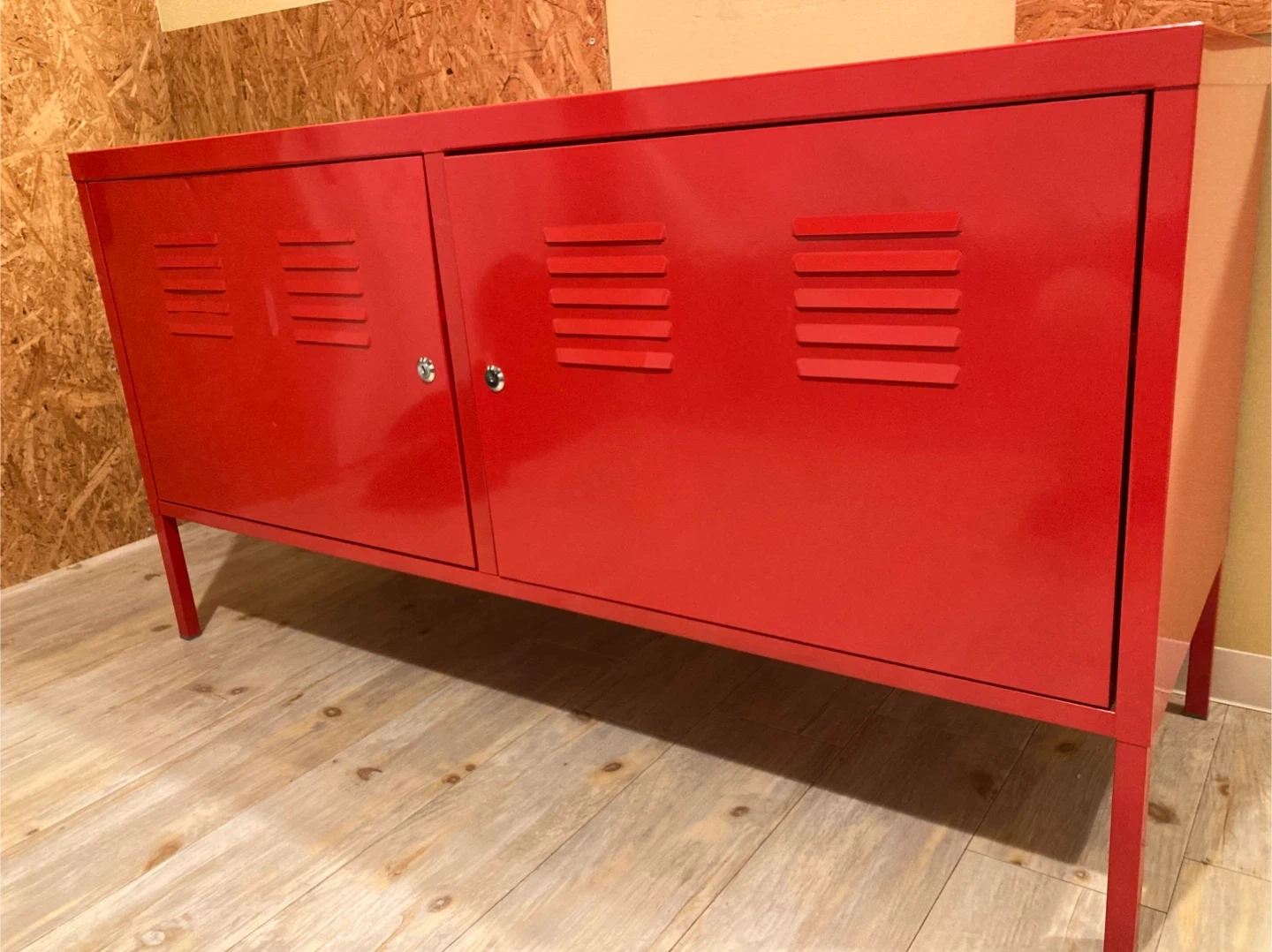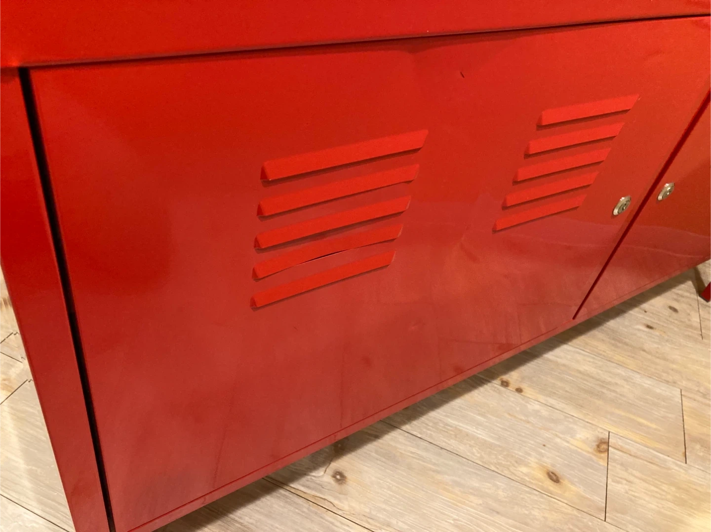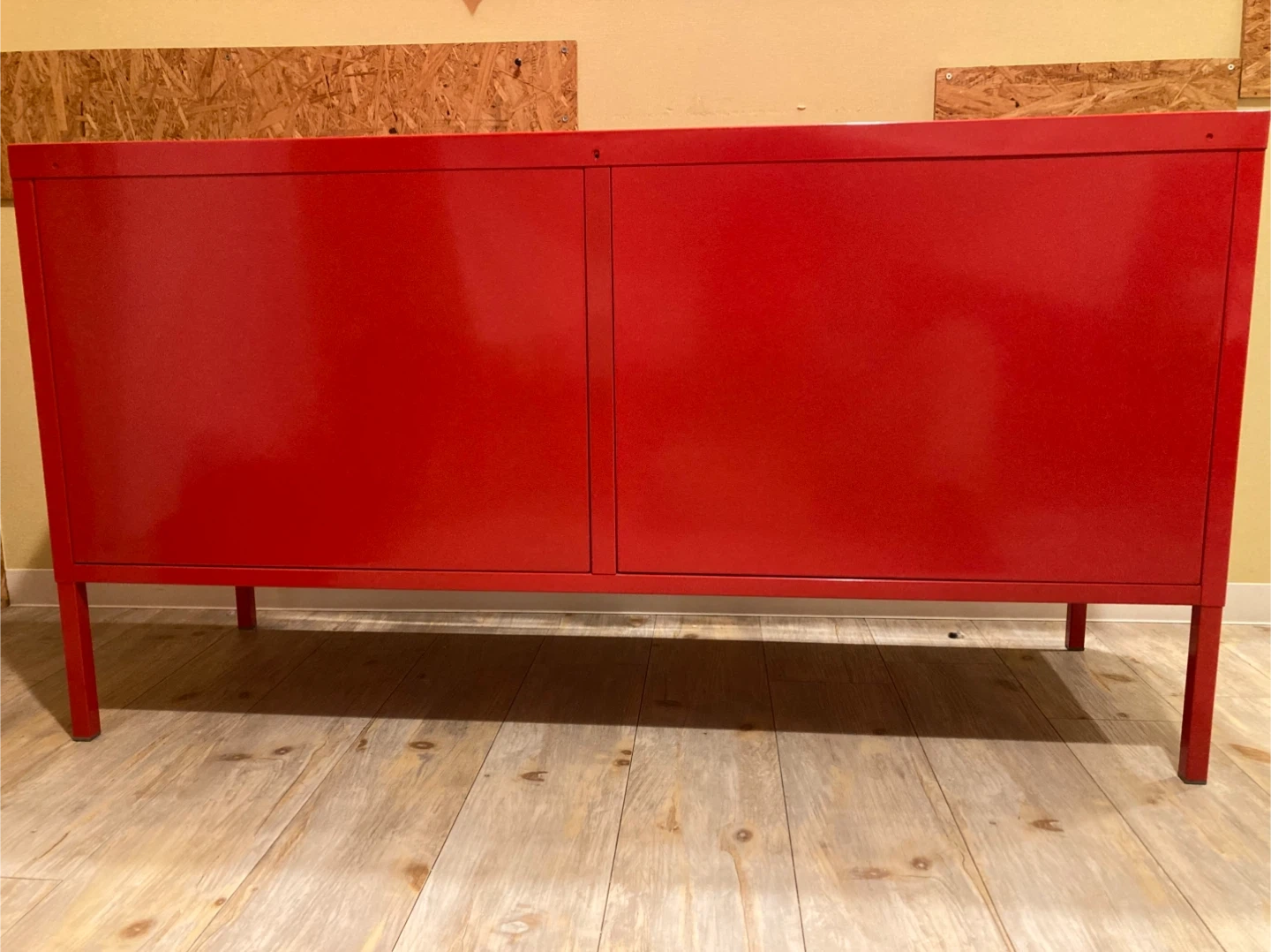 IKEA(イケア)のキャビネット「PS」 レッドカラーです 左右底面に2箇所5センチほどの穴があるので中にコードが通せます。 しっかり収納できるオシャレなテレビ台としてとても重宝していました♪ レッドカラーが映える収納キャビネットです 既に廃盤カラーとなっており貴重なお品のようです サイズ  約W 1200 D 400 H 630 【商品詳細】 IKEA イケア PS スチール キャビネット テレビ台 サイドボード 【付属品】 ・キャビネット本体のみ ・鍵 付属なし 【状態】 中古品のため日常使用に伴う使用感、キズはありますが全体の印象は比較的綺麗かとは思います。 ただ、左扉側に傷や凹み、鍵部に折れなどあるため以下に傷あり部をお伝えです ⚪︎左扉に凹みや歪みあり ⚪︎左中段棚板フラット部に凹みや歪みありベコっと浮きあり、鍵部扉に掛けるパーツ無 ⚪︎右鍵が中折れ  ⚪︎鍵紛失や中折れで付属なし 扉を鍵で止める方式なので上記の理由で外からマグネット止めで使用していました ※素人検品の中古品ですので見落としなどご容赦ください。画像にて状態ご確認、ご了承の上ご購入お願いいたします。 ご不明点があればお気軽にご連絡ください。 大きく重量があるため、駅前などに持っていくことができません。 バラさずこのままでのお渡しです。 指定の場所までいらしていただける様お願いいたします。 収納 ラック テレビ台 インテリア IKEA ニトリ 東京インテリア キャビネット 棚 サイドボード チェスト シェルフ