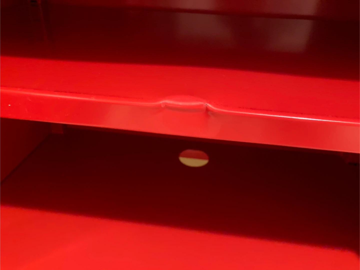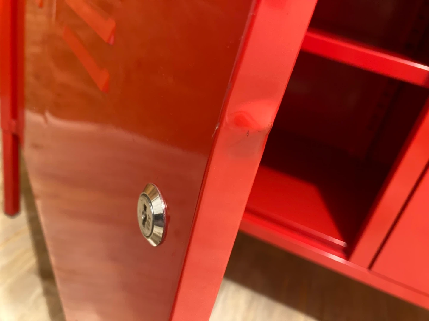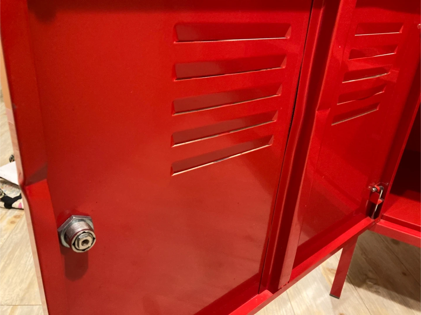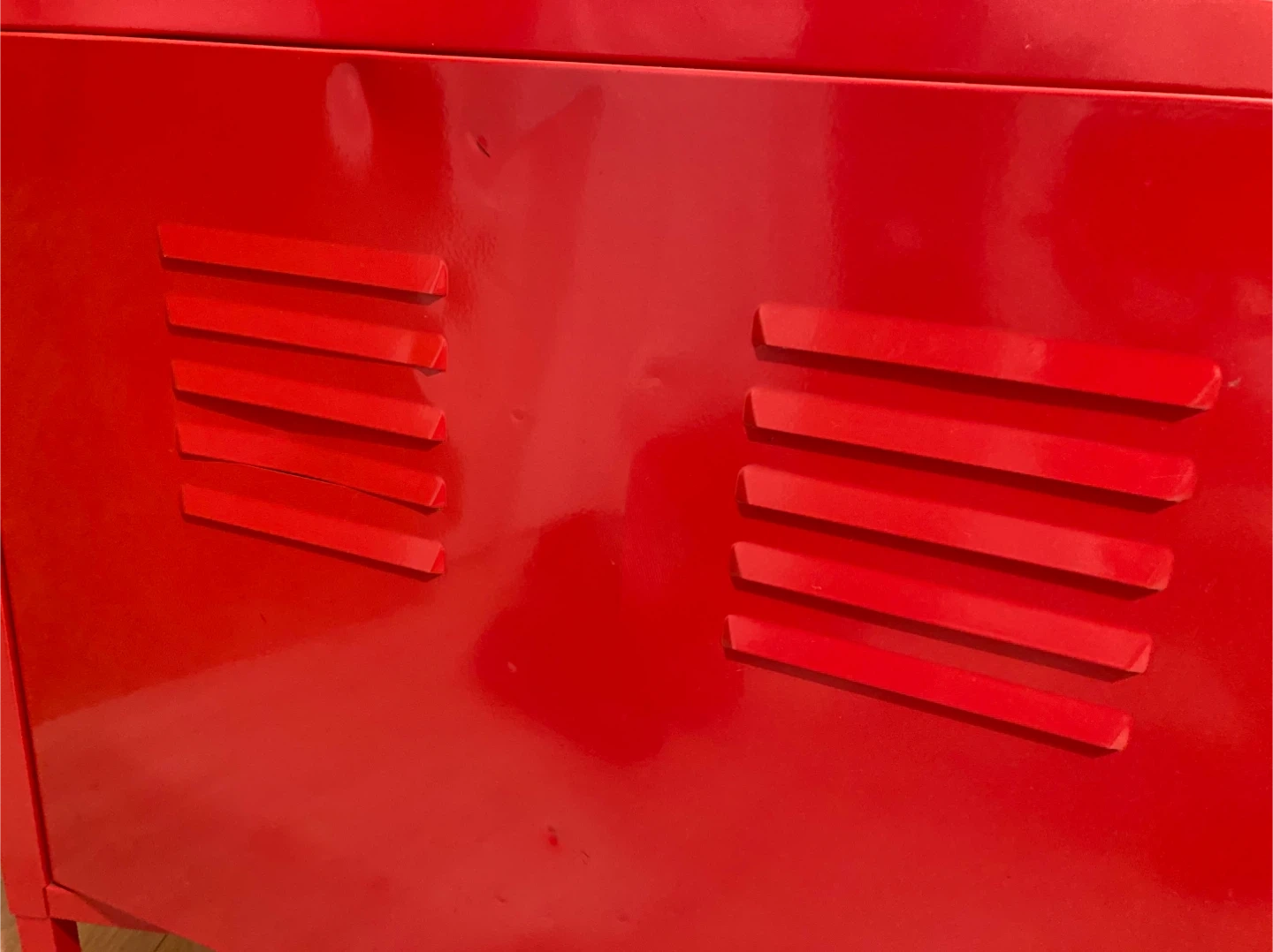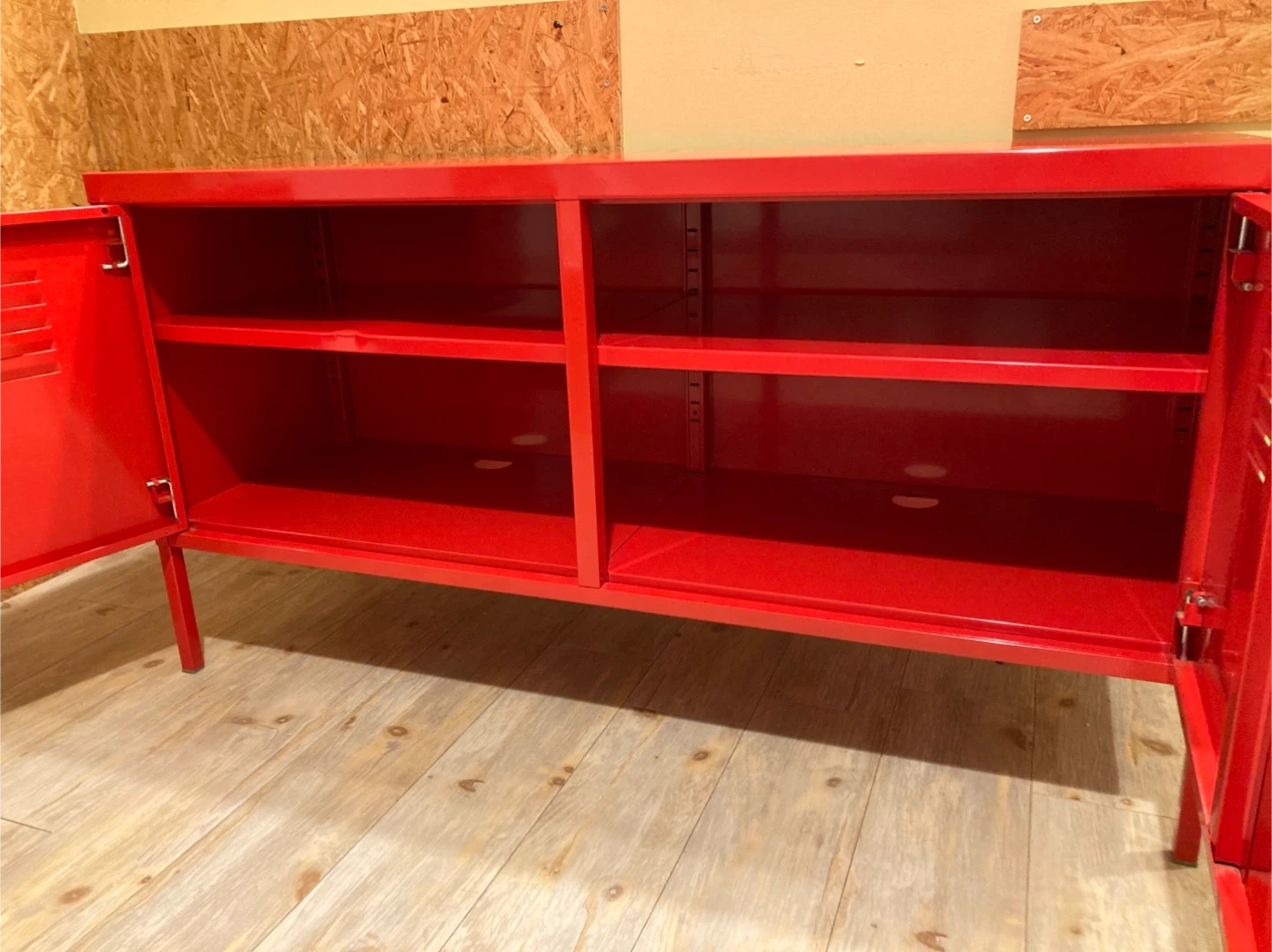 IKEA(イケア)のキャビネット「PS」 レッドカラーです 左右底面に2箇所5センチほどの穴があるので中にコードが通せます。 しっかり収納できるオシャレなテレビ台としてとても重宝していました♪ レッドカラーが映える収納キャビネットです 既に廃盤カラーとなっており貴重なお品のようです サイズ  約W 1200 D 400 H 630 【商品詳細】 IKEA イケア PS スチール キャビネット テレビ台 サイドボード 【付属品】 ・キャビネット本体のみ ・鍵 付属なし 【状態】 中古品のため日常使用に伴う使用感、キズはありますが全体の印象は比較的綺麗かとは思います。 ただ、左扉側に傷や凹み、鍵部に折れなどあるため以下に傷あり部をお伝えです ⚪︎左扉に凹みや歪みあり ⚪︎左中段棚板フラット部に凹みや歪みありベコっと浮きあり、鍵部扉に掛けるパーツ無 ⚪︎右鍵が中折れ  ⚪︎鍵紛失や中折れで付属なし 扉を鍵で止める方式なので上記の理由で外からマグネット止めで使用していました ※素人検品の中古品ですので見落としなどご容赦ください。画像にて状態ご確認、ご了承の上ご購入お願いいたします。 ご不明点があればお気軽にご連絡ください。 大きく重量があるため、駅前などに持っていくことができません。 バラさずこのままでのお渡しです。 指定の場所までいらしていただける様お願いいたします。 収納 ラック テレビ台 インテリア IKEA ニトリ 東京インテリア キャビネット 棚 サイドボード チェスト シェルフ