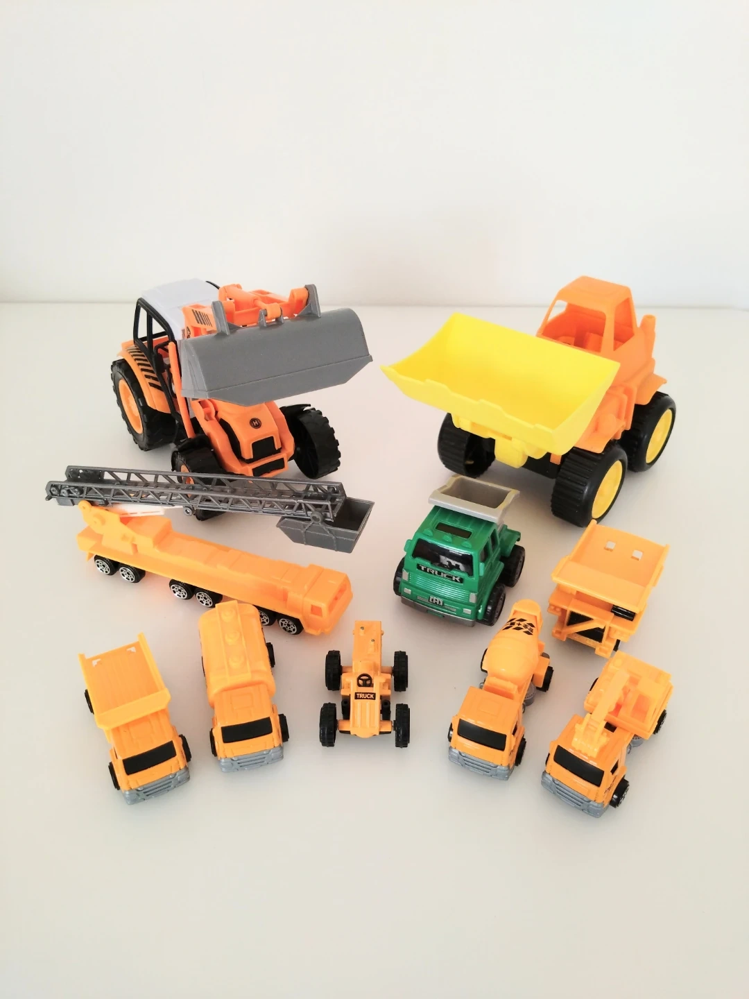 大きめのショベルカー2台はどちらも全長20cm前後の大きさです。 左側のショベルカーのショベルが若干曲がっています。 写真6枚目を参照ください。 はしご車のはしご(伸縮部分)が紛失しております。 写真の長さからは伸びません。 緑色の車両はフリクション走行します。 その隣のオレンジの車両はプルバック走行します。 こちらの2台以外の車両は特別な走行はしません。 前方の5台はトミカではありません。 中古品である事、御理解頂ける方宜しくお願い致します。