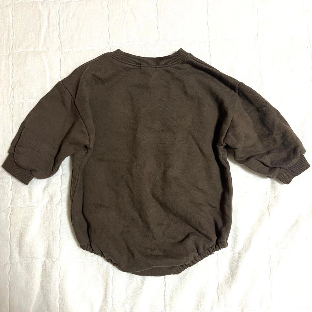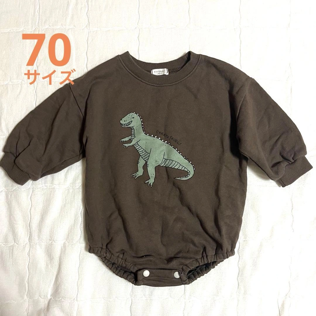 恐竜プリントのブラウンロンパースです。 韓国風子供服。 上半身と袖はゆったり感のあるつくりです。 サイズは60〜70ぐらいかと思います。 着丈43 身幅38 袖丈18.5 首元から袖先(リブ)まで33 中古品・自宅保管にご理解頂ける方のみよろしくお願い致します。 ご希望の方はお気軽にご連絡ください。