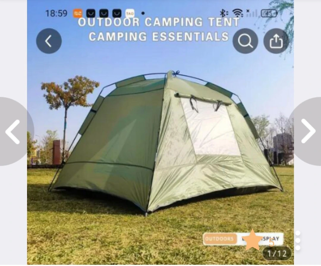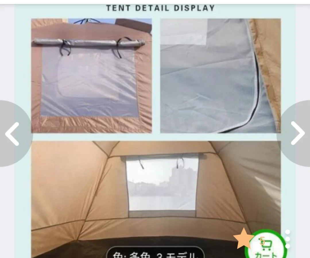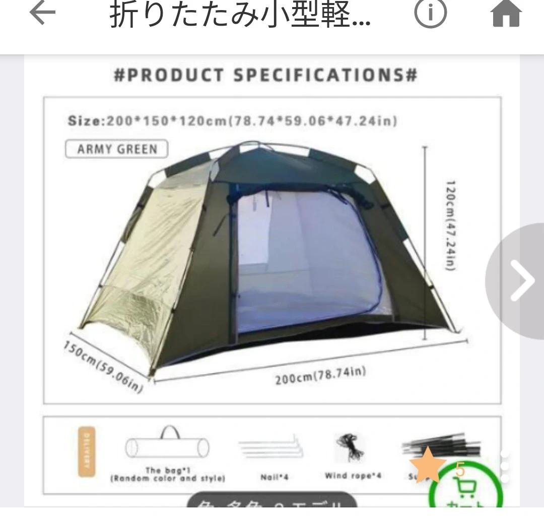 キャンプ用テントです。 ・カラー:アーミーグリーン ・サイズ:200×150×120cm ・付属品:収納袋、釘、風ロープ 2本のポールで簡単設営 本体 ペグ4 ロープ4 ポール2本 収納袋 収納時 50cm 重量1.3kgと小型軽量 ゆったり2-3人用 ポリエステル生地 軽く、雨に強いですが、火や熱に弱いと言われています。 海外製品です。細かな点気にされる方は、 ご遠慮ください。 海、山、公園等で大活躍します。 受渡しは横浜市緑区中山駅北口 徒歩3分のセブンイレブン中山北 口店前でお願いします。 駐車場はありませんが、 全面道路広く、停められます。 日にちにもよりますが、 am8-pm8対応できます。