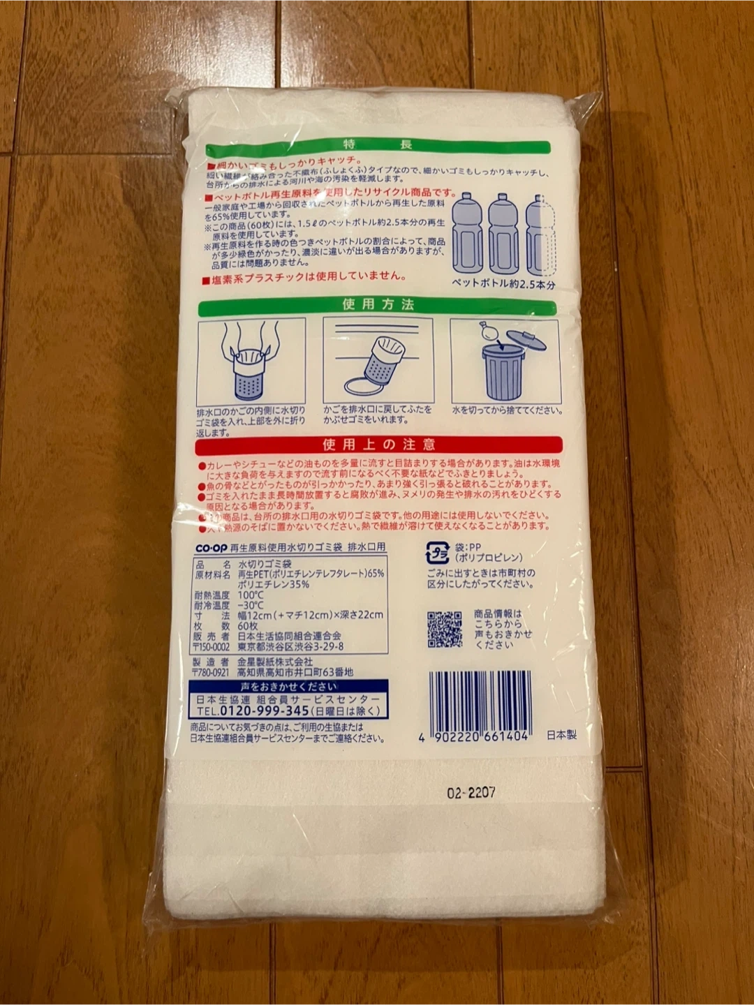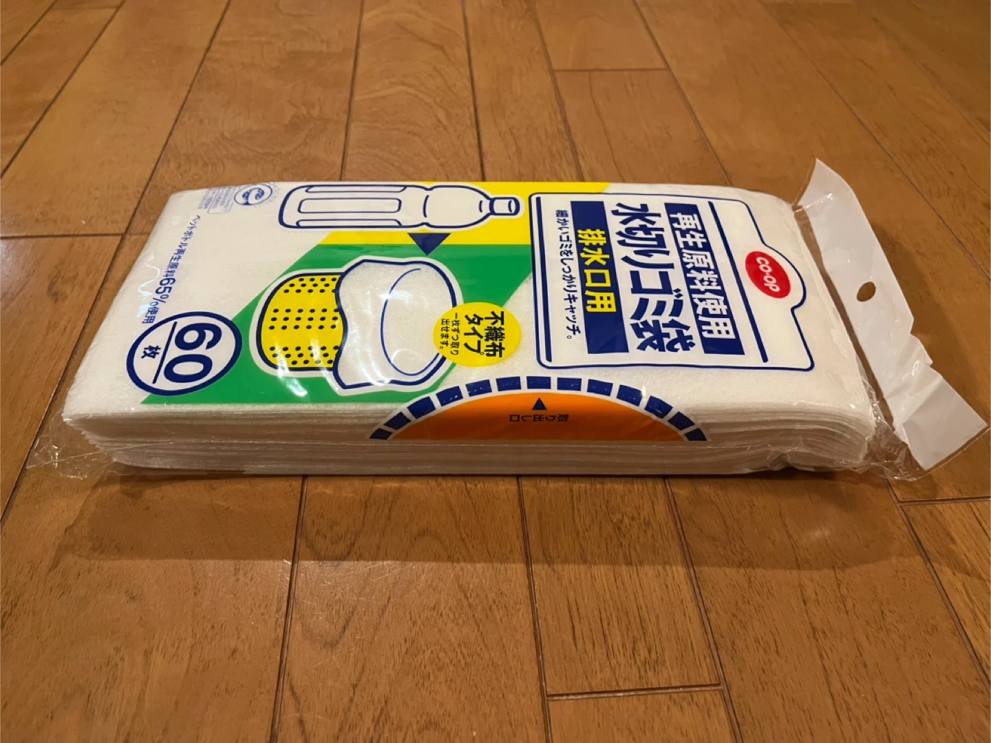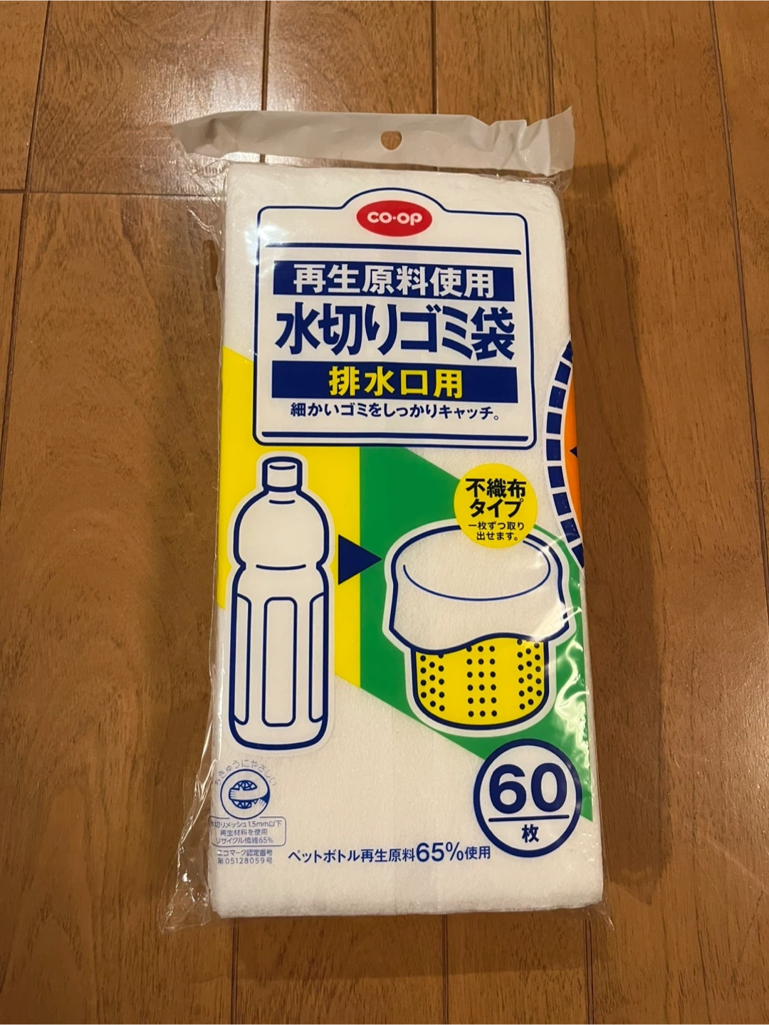 コープの排水口用水切りゴミ袋(不織布タイプ)です。 ペットボトル再生原料を使用した環境に優しいリサイクル商品です。 サイズは幅12cm(+マチ12cm)×深さ22cmです。 たっぷり60枚入りなので、毎日交換しても2ヶ月もちます。 数年前に買って(家の排水口のサイズを間違えて購入)、自宅保管していました。 よろしくお願いします。