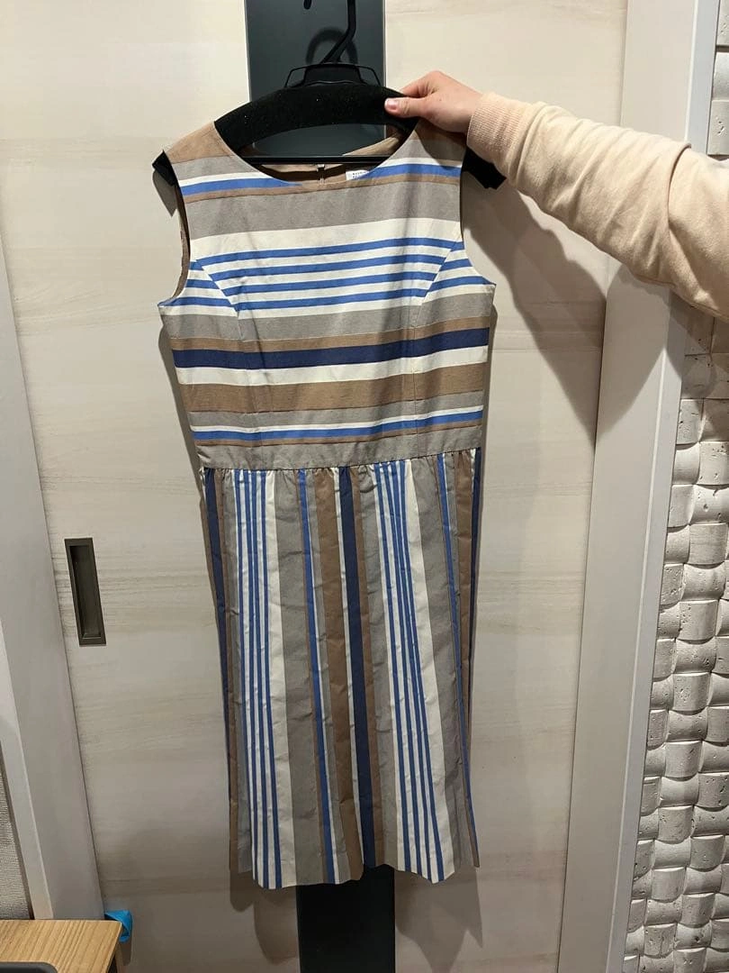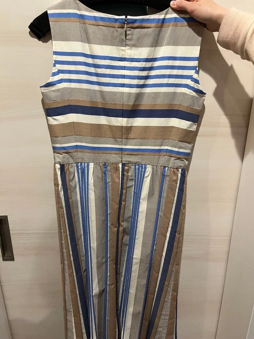 未使用保管品、試着のみです。 ストライプ柄のノースリーブ膝丈ワンピースです。フレアシルエットで快適な着心地かと思います。 - デザイン: ストライプ柄 - カラー: ベージュ、青、白 - スタイル: ノースリーブ - バックスタイル: ジッパー付き - シルエット: フレア - 素材: コットン混合 肩幅35身幅45着丈97.5 ご希望の方はお気軽にご連絡ください。