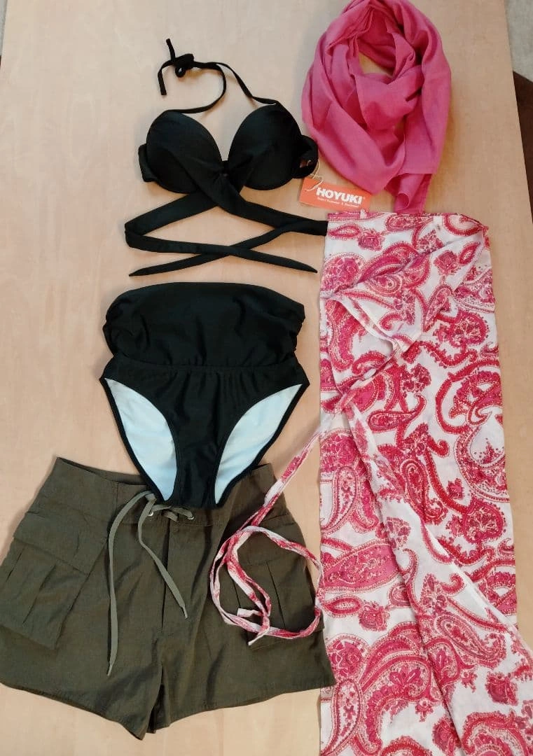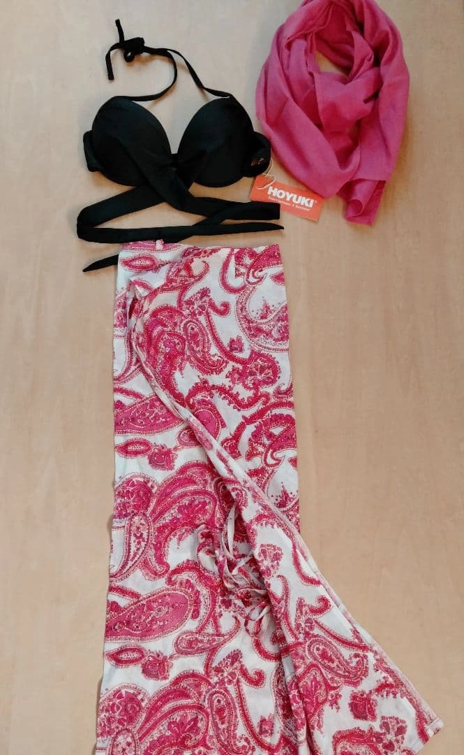 ブラックのビキニ水着とオーストラリア ブリスベンで購入したペイズリー柄のパレオスカーフの5点セットです。別売りは考えておりません。 - ブランド: HOYUKI - カラー: ブラック - スタイル: セパレート水着 - 付属品: スカーフ - デザイン: ペイズリー柄 - 素材: 水着用素材 ご覧いただきありがとうございます。