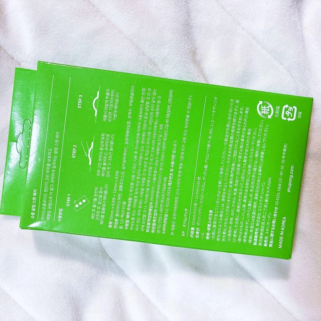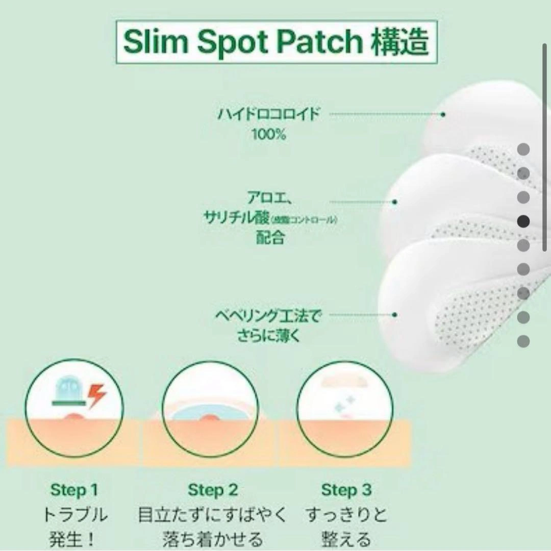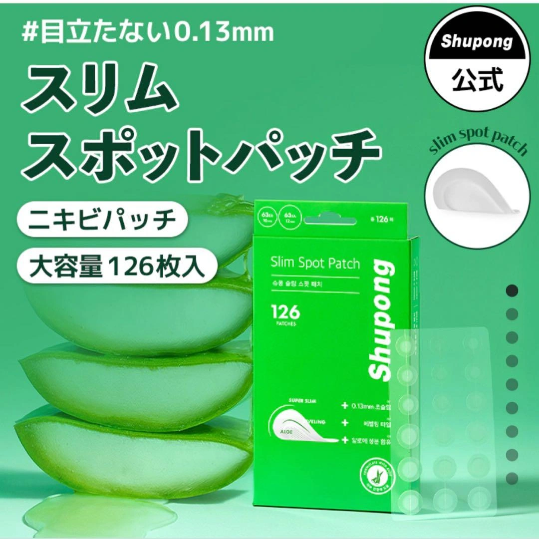 ハイドロコロイド100%使用のスリムスポットパッチです。126枚入り。薄さ0.13mmで目立たず、アロエ成分配合。 - ブランド: Shupong - 商品名: Slim Spot Patch - 枚数: 126枚入 - 素材: ハイドロコロイド100% - 成分: アロエ、サリチル酸配合 - 特徴: 薄さ0.13mm - パッケージデザイン: グリーン ご覧いただきありがとうございます。 ご希望の方はお気軽にご連絡ください。