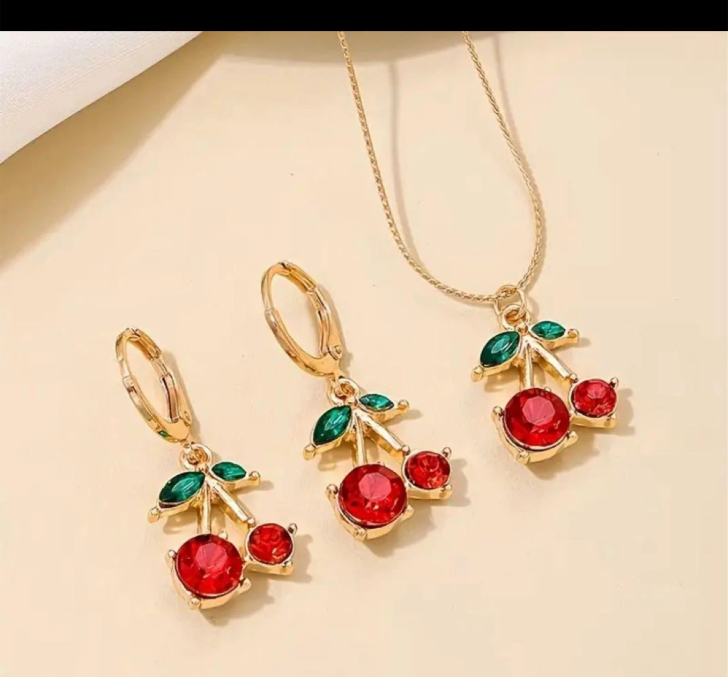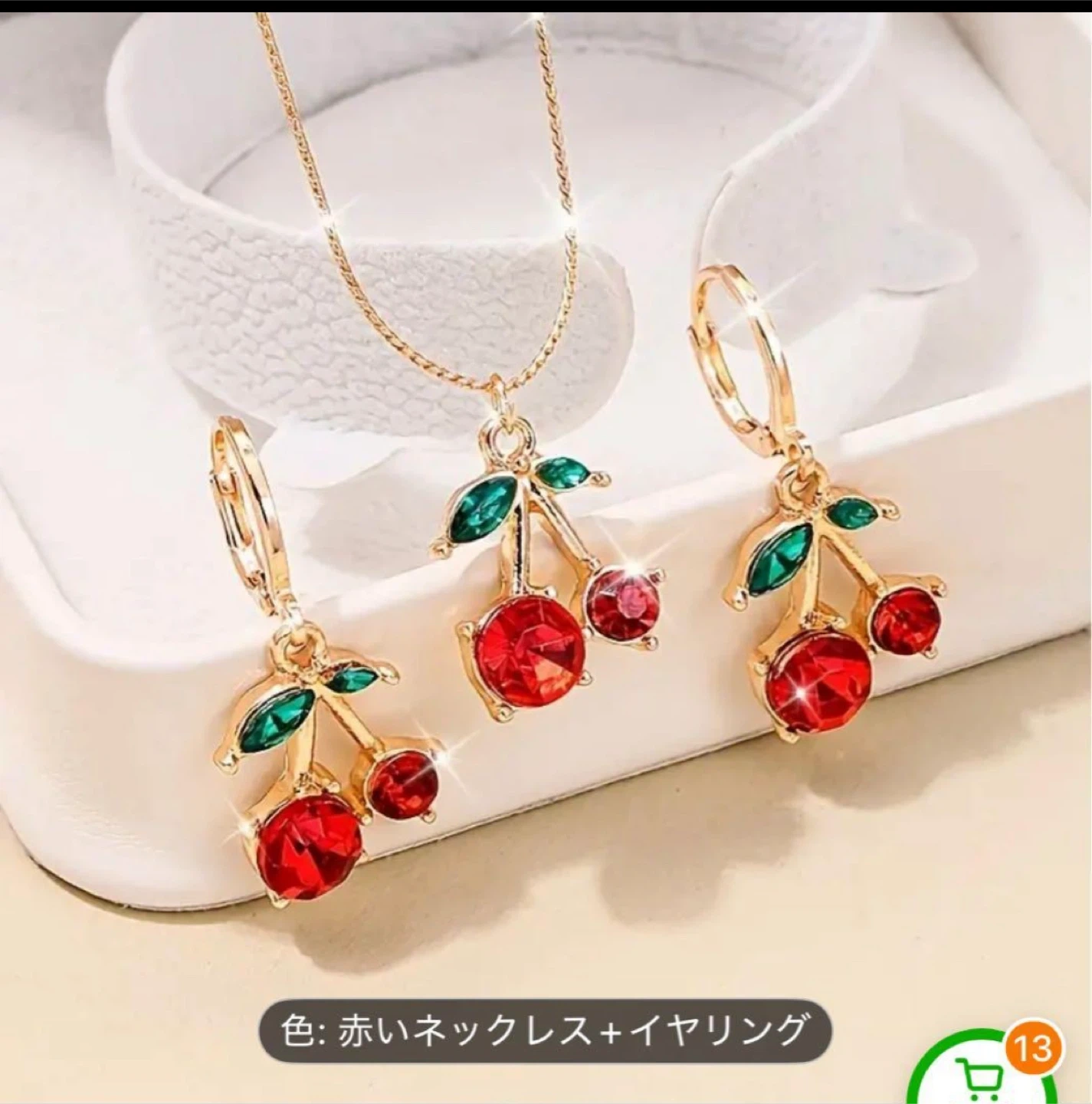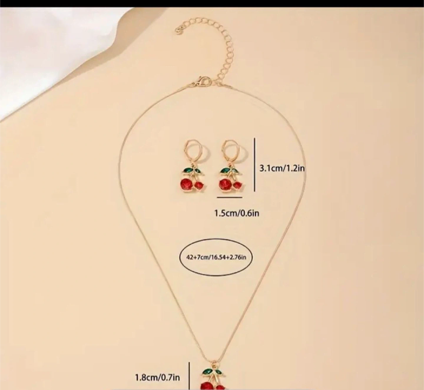 チェリーモチーフのネックレスとピアスです。 ・色:レッド、グリーン、ゴールド ・ネックレスの長さ:約42cm + アジャスター約7cm ・ピアスのサイズ:約3.1cm x 1.5cm 新品であることをご了承ください。