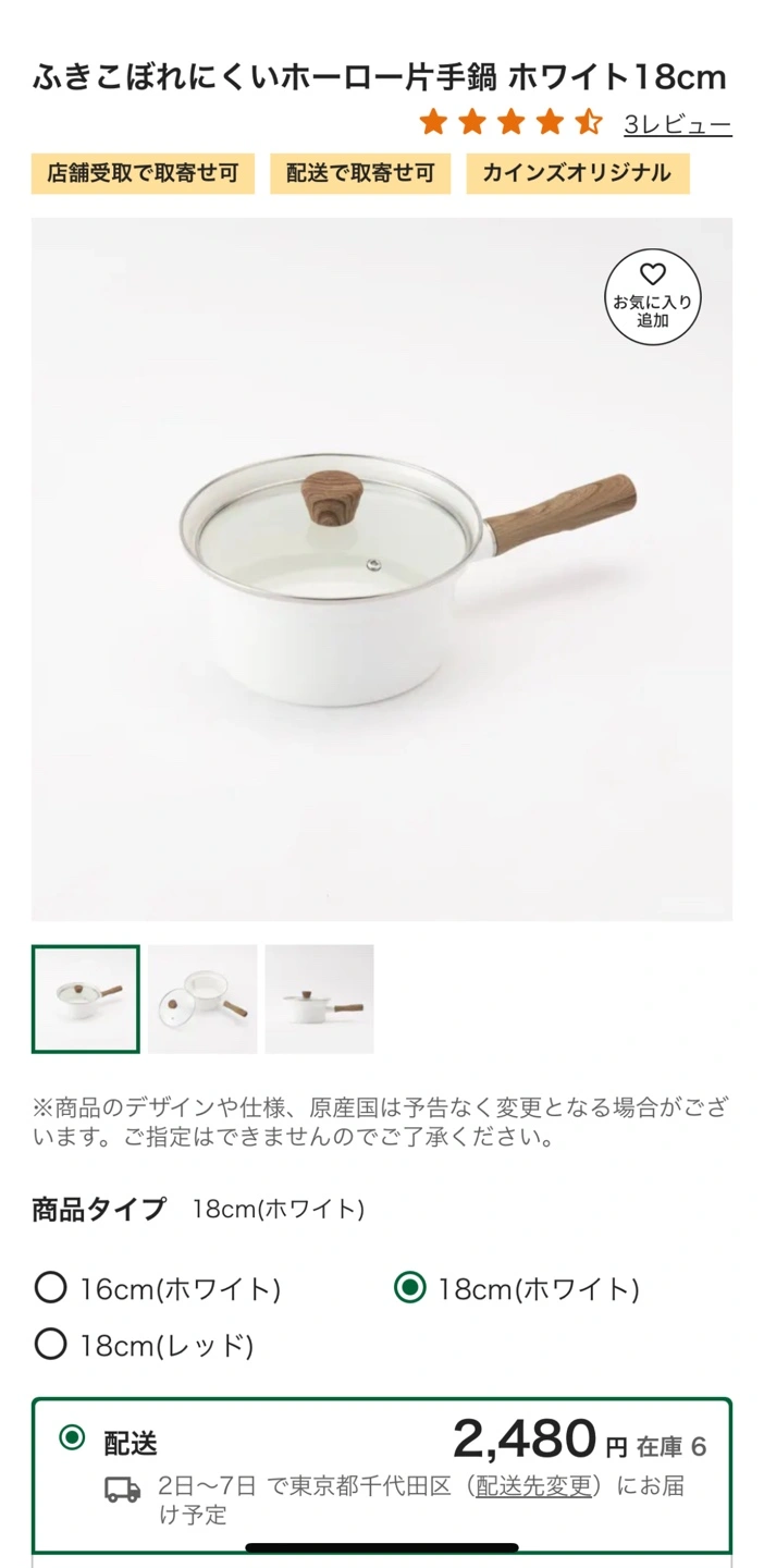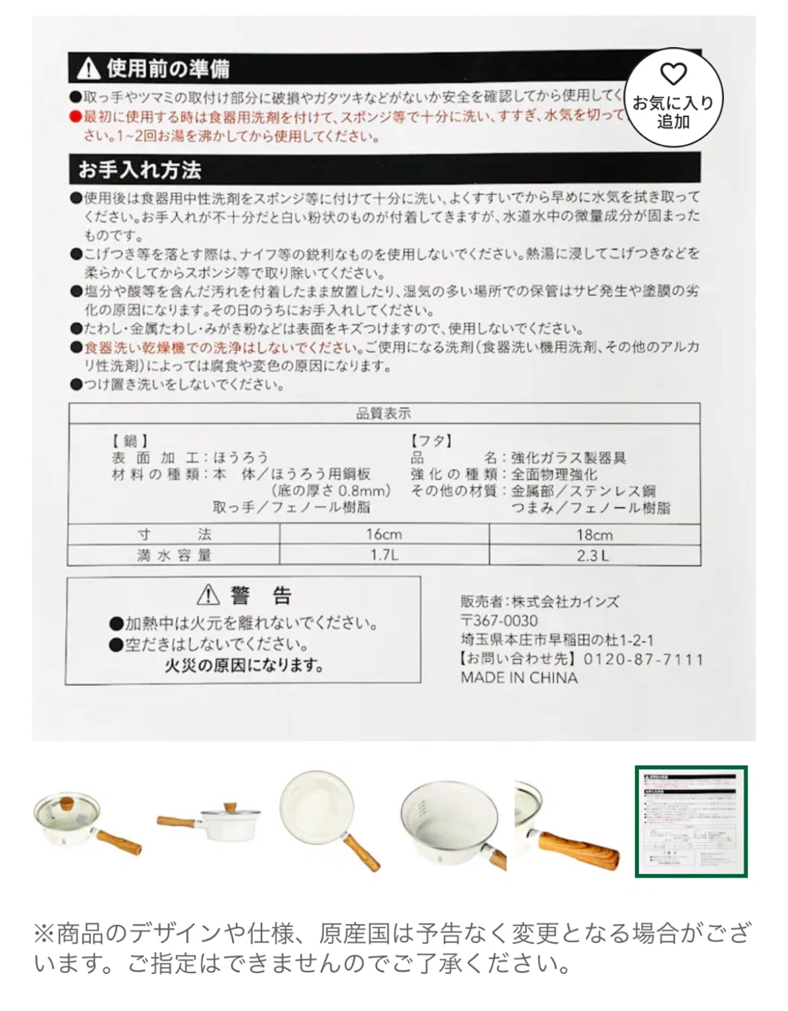 カインズオリジナルのホーロー片手鍋。フタの周りまで鍋の淵が立ち上がっていて吹きこぼれにくくなっています。鍋の内側には目盛りがあってとても便利です。 取扱説明書に「使用前に水を沸かしてからご使用ください」書いてあったため水を沸かしただけで料理には未使用。ほぼ新品のような状態です。 ご近所の方の引き取り推奨。発送は送料1,000円かかってしまうので、おすすめしません。お近く(2〜3km)ならお届けることも可能です。 ★以下、カインズのホームページより抜粋 幅35cm 奥行20.5cm 高さ13.2cm 直径18cm 底厚0.8mm 満水容量(L)1.7 中国製 【特徴】 ●料理や素材のニオイがつきにくく衛生的です。●なめらかなガラス質の表面は酸・アルカリに強いため、腐食しにくく細菌などの発生を抑制します。 【材質】 ●鍋本体/ほうろう用鋼板(底の厚さ0.8mm) ●取っ手/フェノール樹脂 ●フタ金属部/ステンレス鋼 ●フタつまみ/フェノール 樹脂 【お手入れ方法】食器洗い乾燥機での洗浄はしないでください。