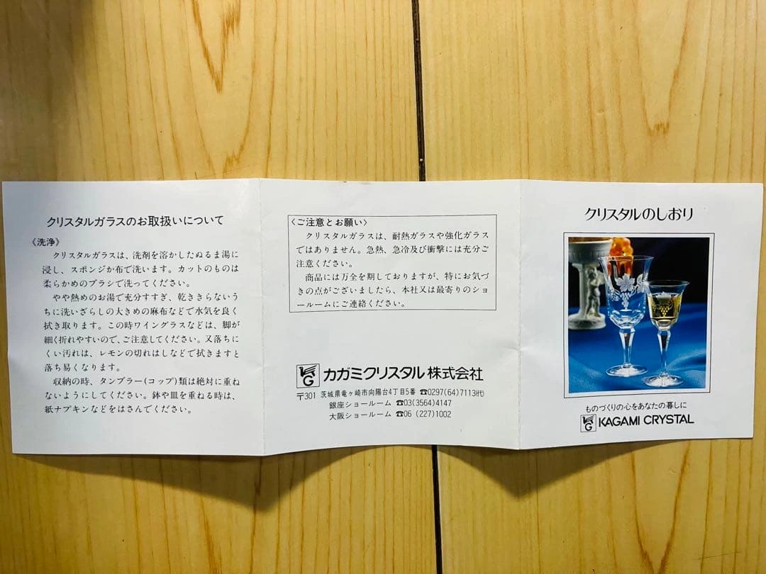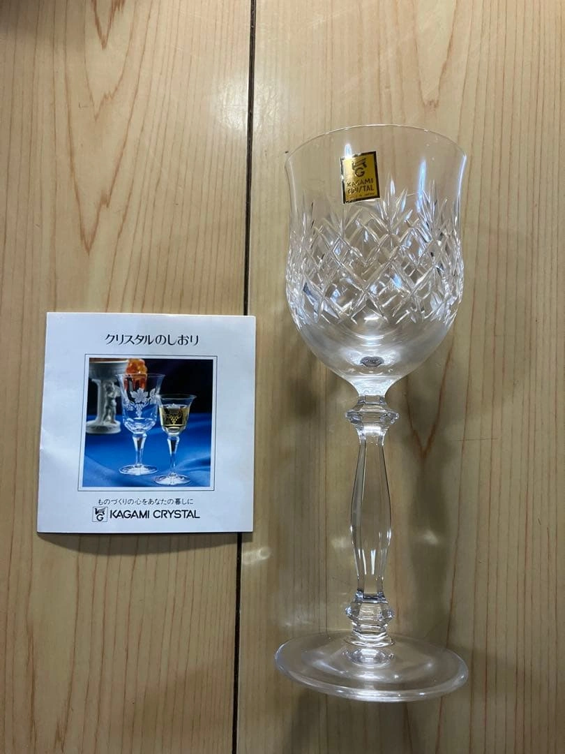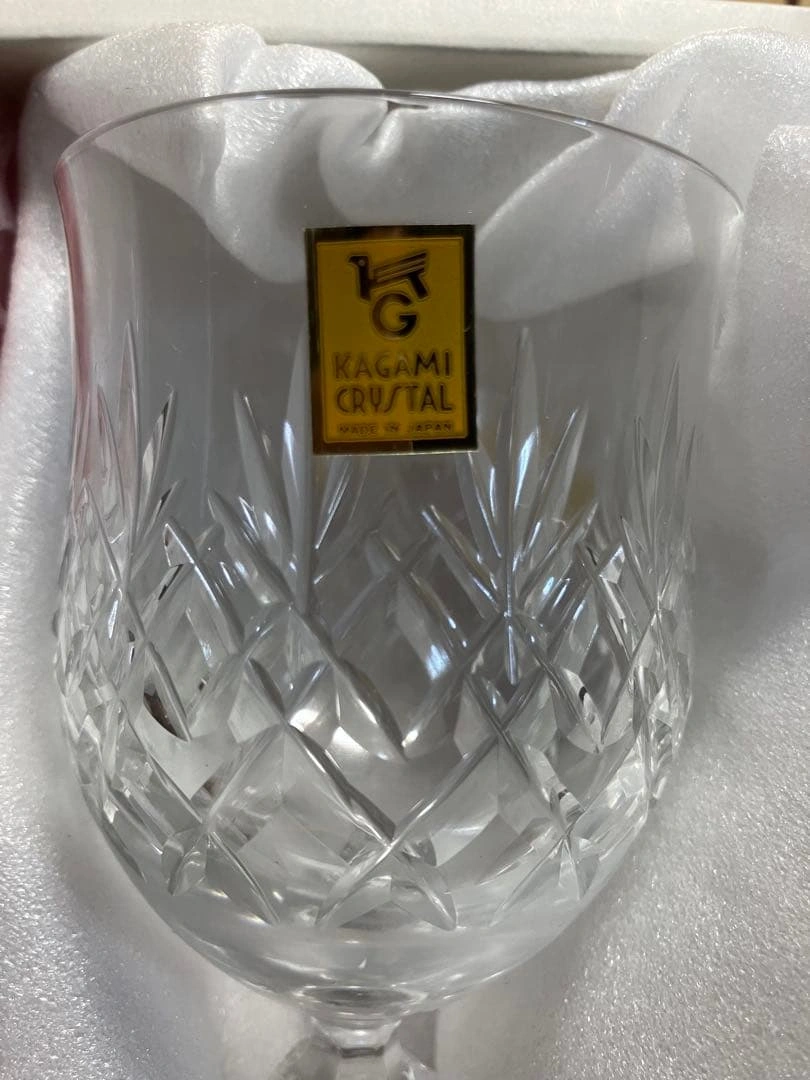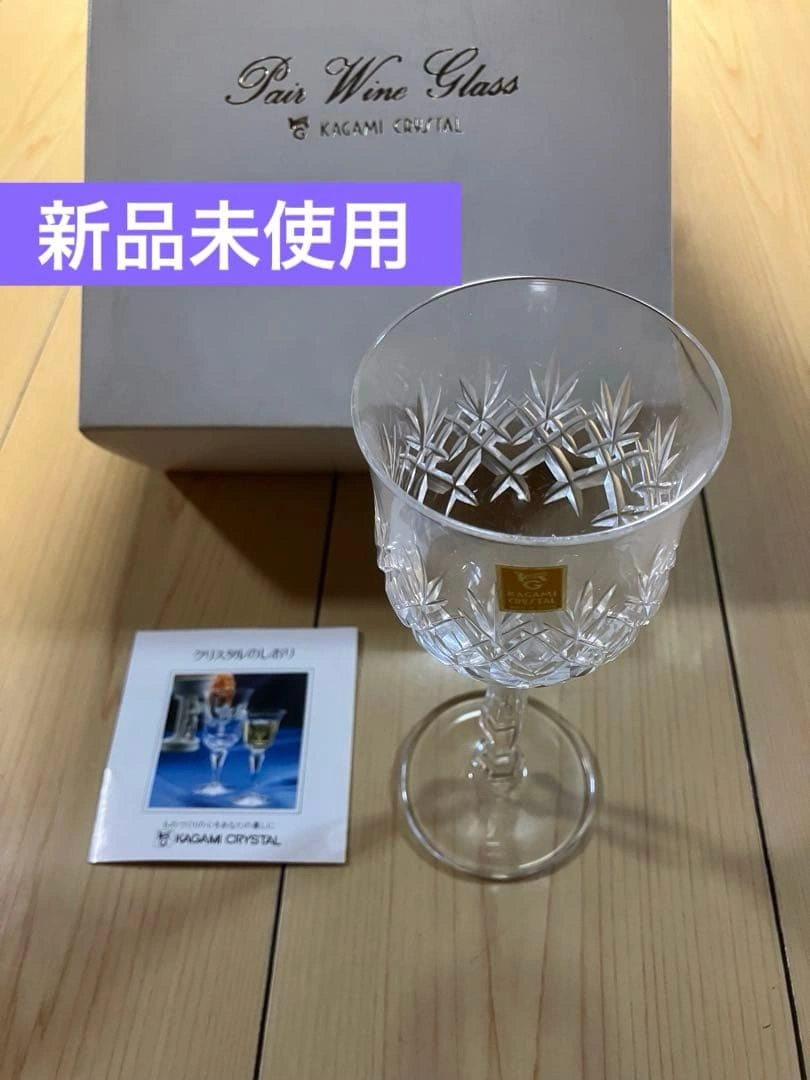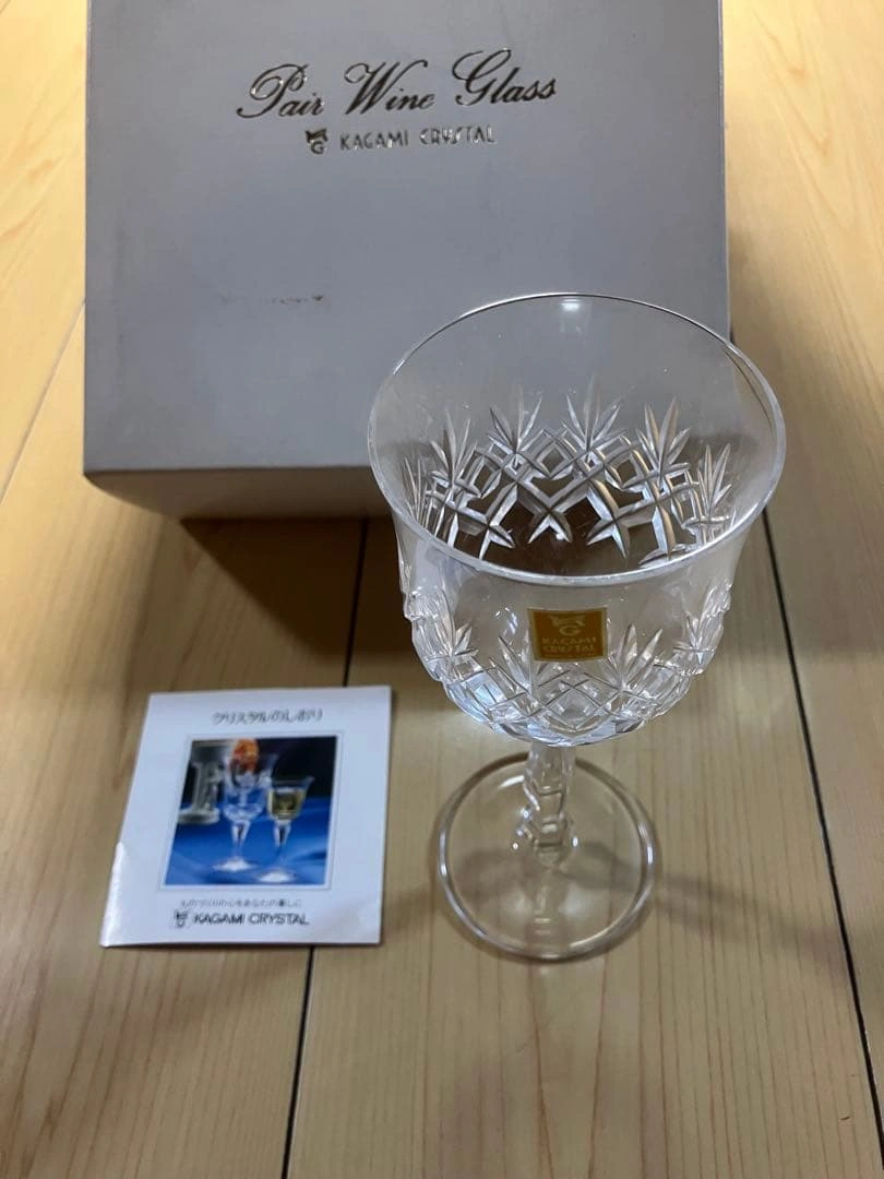 高級クリスタル製のペアワイングラス、葉模様の美しいカットが特徴です。 - ブランド: KAGAMI CRYSTAL - 商品名: ペアワイングラス - デザイン: 葉模様のカット - 素材: クリスタル - 数量: 2個セット ※銀座和光で購入したもののそのまま倉庫に保管して存在を忘れていた品です。本日出品撮影のため中身を開けてみました。 外箱に保管に伴う経年劣化(写真11.12.13.14.15.16参照)がありますが中身は新品未使用です! ご覧いただきありがとうございます。 ご希望の方はお気軽にご連絡ください。