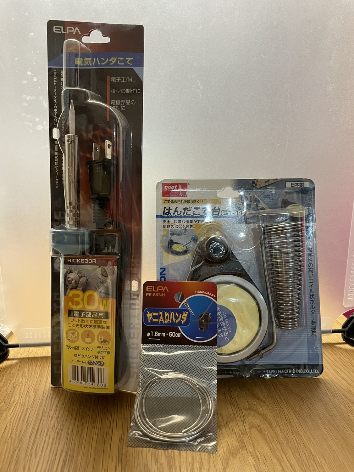 新品未開封のはんだこて台、ハンダこて、ハンダのセットです。 2年以上前に購入し、保存してあったものになります。 そのため包装は少し折れたりしていますが、中身には影響ないと思います。 他のフリマアプリでも出品しておりますので早い者勝ちです。 受け渡し場所は、大森、蒲田、京急蒲田、梅屋敷、大森町、平和島あたりまでなら出向きます!