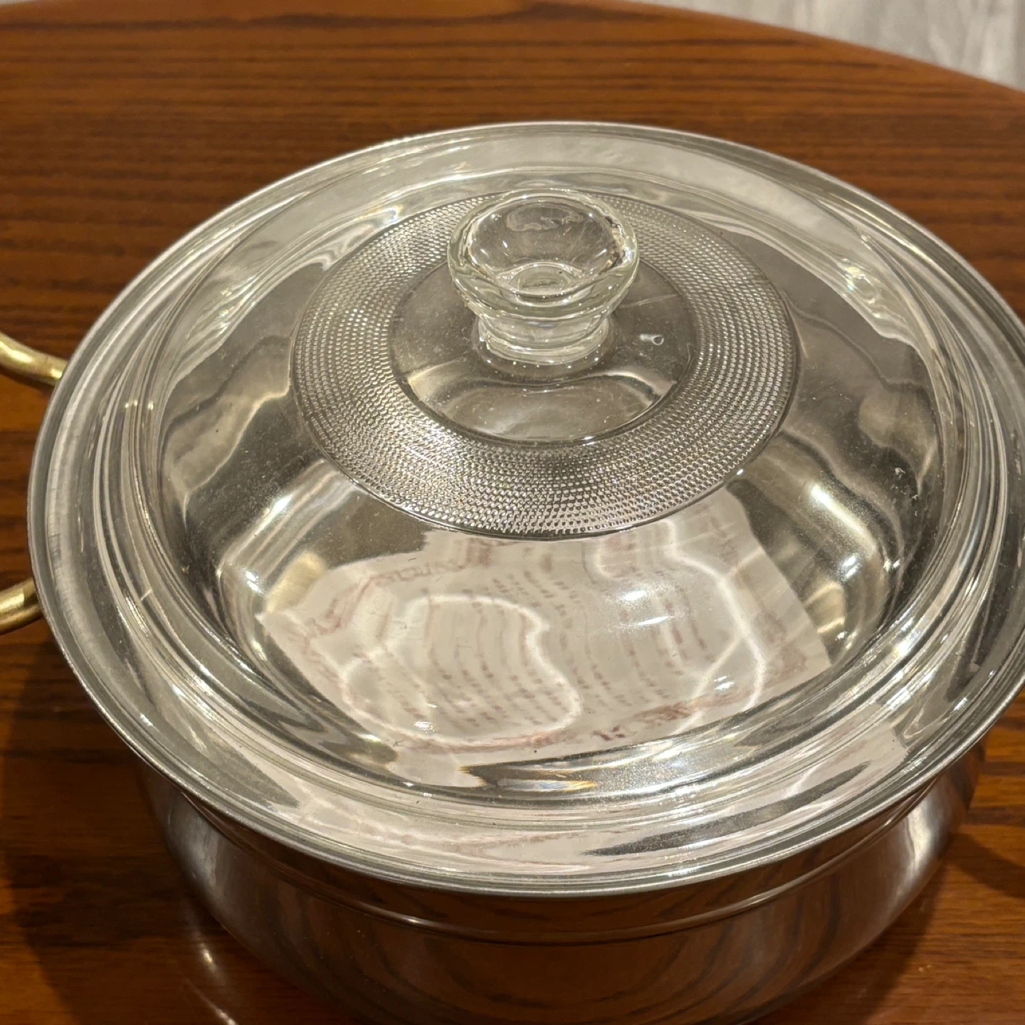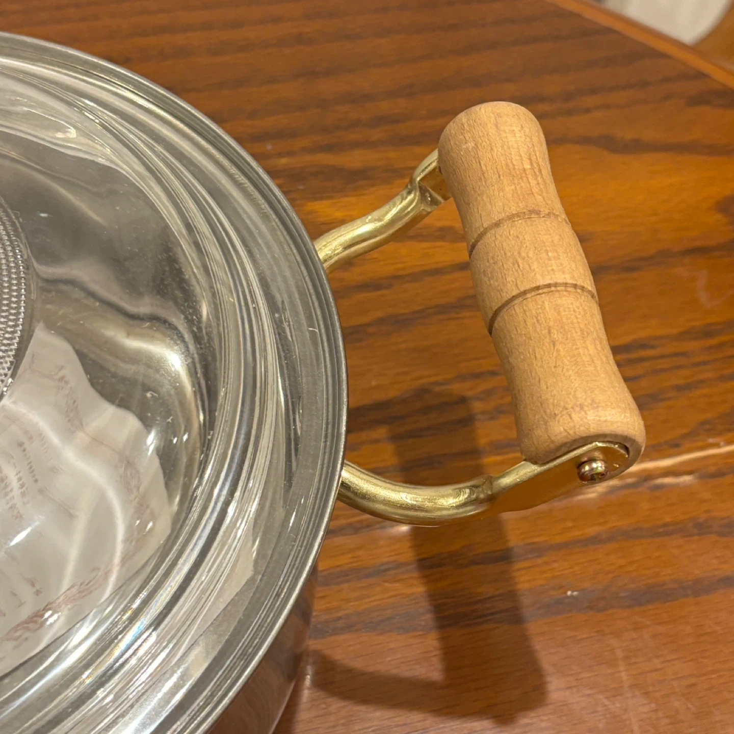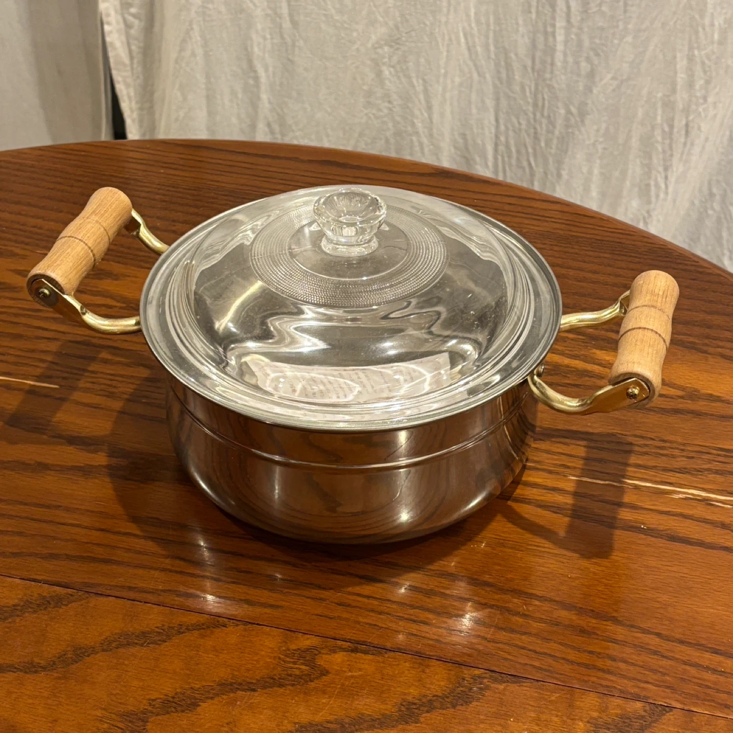 叔母にもらった昭和の鍋で、保存状態はいいです。 蓋はガラス、取っ手はゴールドと木でとてもおしゃれです。 アルミなので軽くて使いやすいです。 サイズ 直径約20cm 取っ手含む幅30cm 高さ蓋あり 約15cm 蓋なし 約9cm ガス火のみ