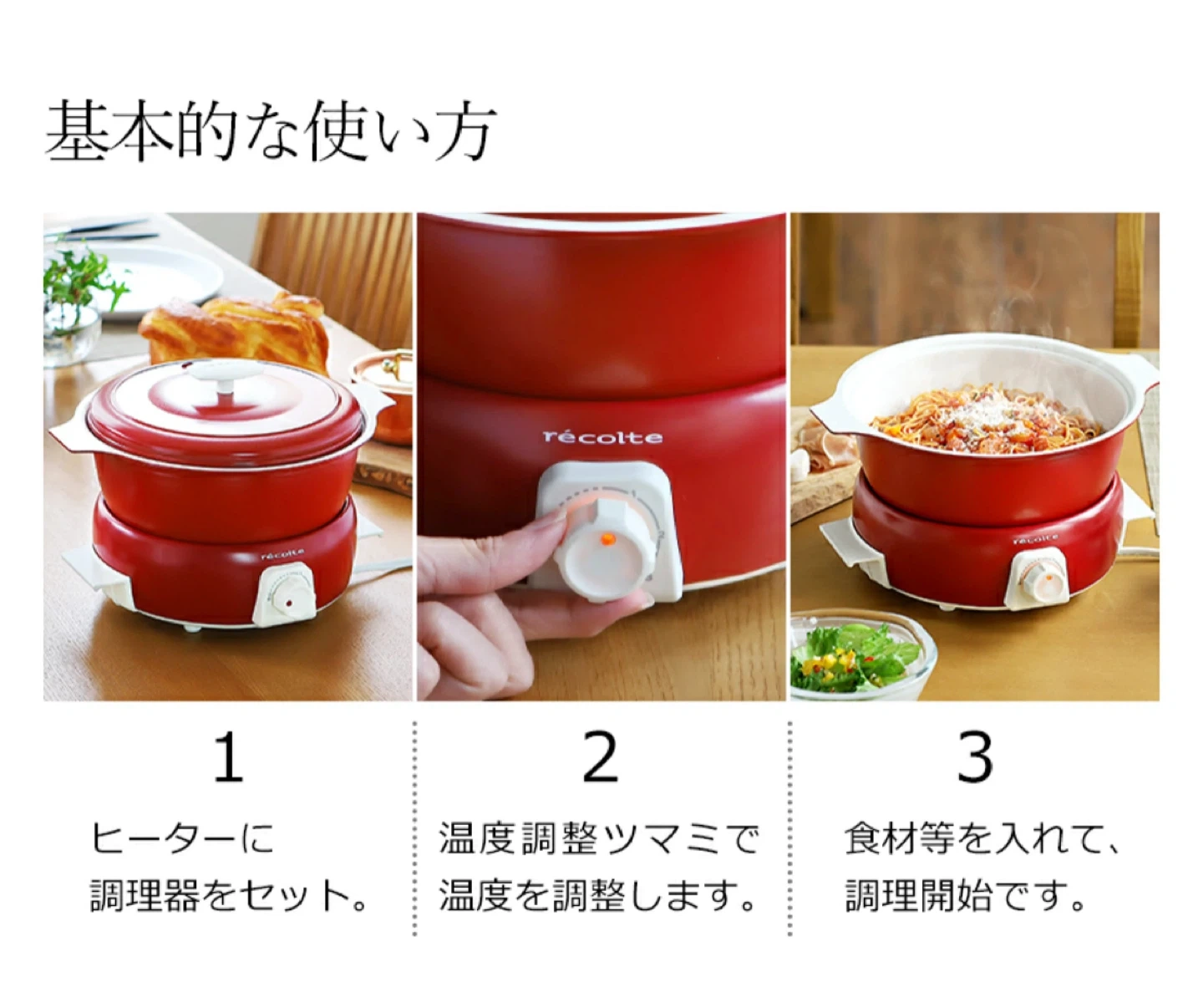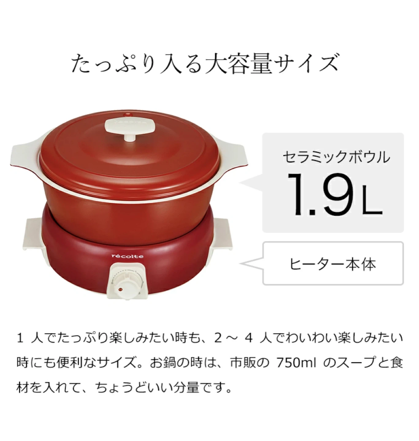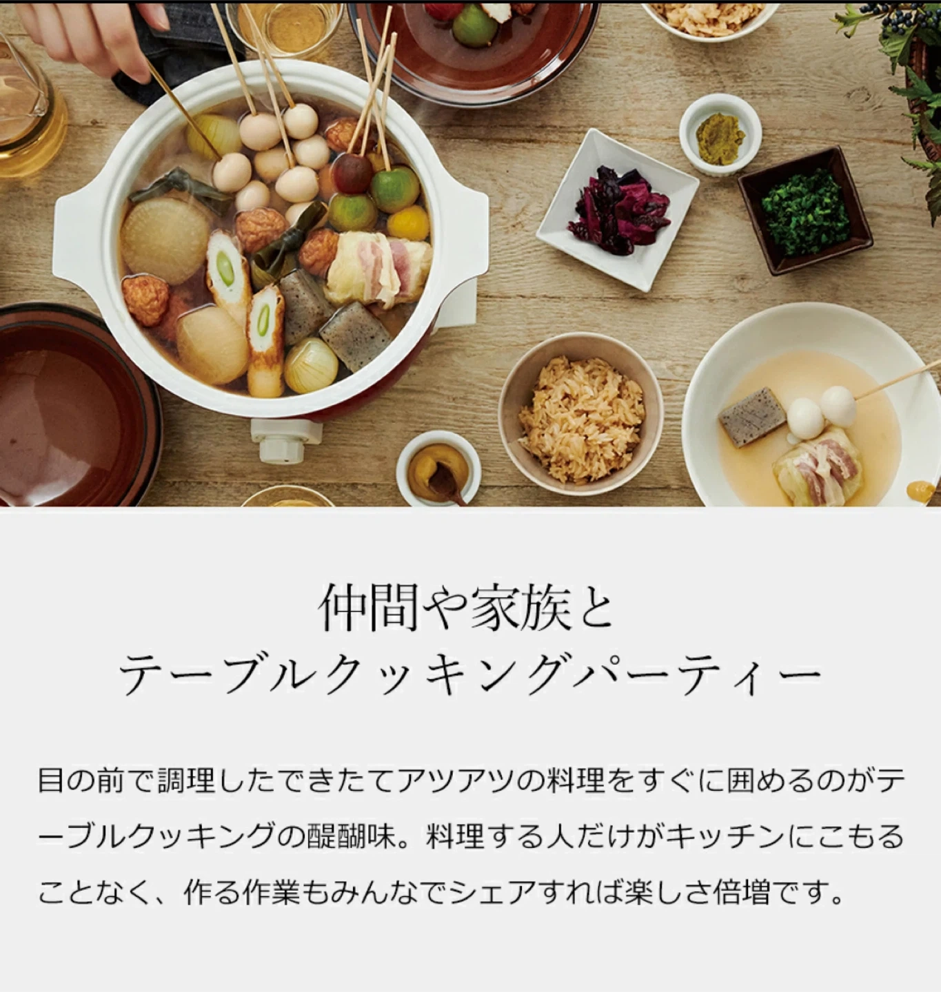 食卓を華やかにするレコルトの多機能電気鍋、ポットデュオ タントの新品未使用品です。本商品は外箱の封も開けておらず、一度も出していません。1台で煮る、蒸す、焼く、揚げる、炊くの5役をこなす大容量サイズで、2〜4人のテーブルクッキングに最適です。目の前で調理するできたてアツアツの料理をすぐに囲め、パーティーも盛り上がります。無段階の温度調整機能で調理内容に合わせて火力を自在に調節可能。たこ焼きプレートや蒸し料理用アミも付属した豪華なセットが、あなたの料理の幅を大きく広げます。 商品の説明 本商品はレコルトのPOT DUO Tanto (RPF-2/カラー:レッド) の完全な新品未使用品です。セラミックボウル(容量1.9L)で本格的な煮込み料理やお鍋、炊き込みご飯、たこ焼きプレートでたこ焼きやアヒージョ、蒸し料理用アミで温野菜など、多様な調理法に対応します。すべてのパーツが本体に重ねて収納できるため、キッチンでの置き場所にも困りません。 商品仕様 • 商品名:POT DUO Tanto • 品番:RPF-2 (R) • カラー:レッド • セット内容:本体、セラミックボウル、蒸し料理用アミ、たこ焼きプレート、フタ、専用レシピブック、取扱説明書 • サイズ:本体(収納時):約27.5(W) × 24.5(D) × 21.0(H)cm • セラミックボウル容量:最大約1.9L • 定格電圧:AC100V 50/60Hz • 消費電力:900W • 重量:約2.1kg その他 • 新品未使用品、箱から一度も出しておりません。 • お渡しは商品の箱のままになります。持ち運び用の手提げ袋はありませんのでご了承ください。 おすすめの人 • 家族や友人と一緒に料理をシェアするテーブルクッキングを楽しみたい方。 • コンパクトながら大容量で多機能な電気調理器をお探しの方。 • 調理家電をすっきり収納したい方。 • ペット、喫煙者はおりません • 検品は素人によるものです。自宅保管品であることをご理解ください。