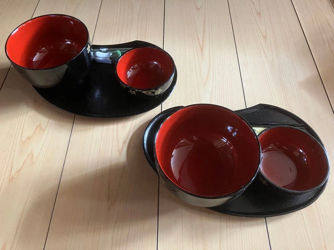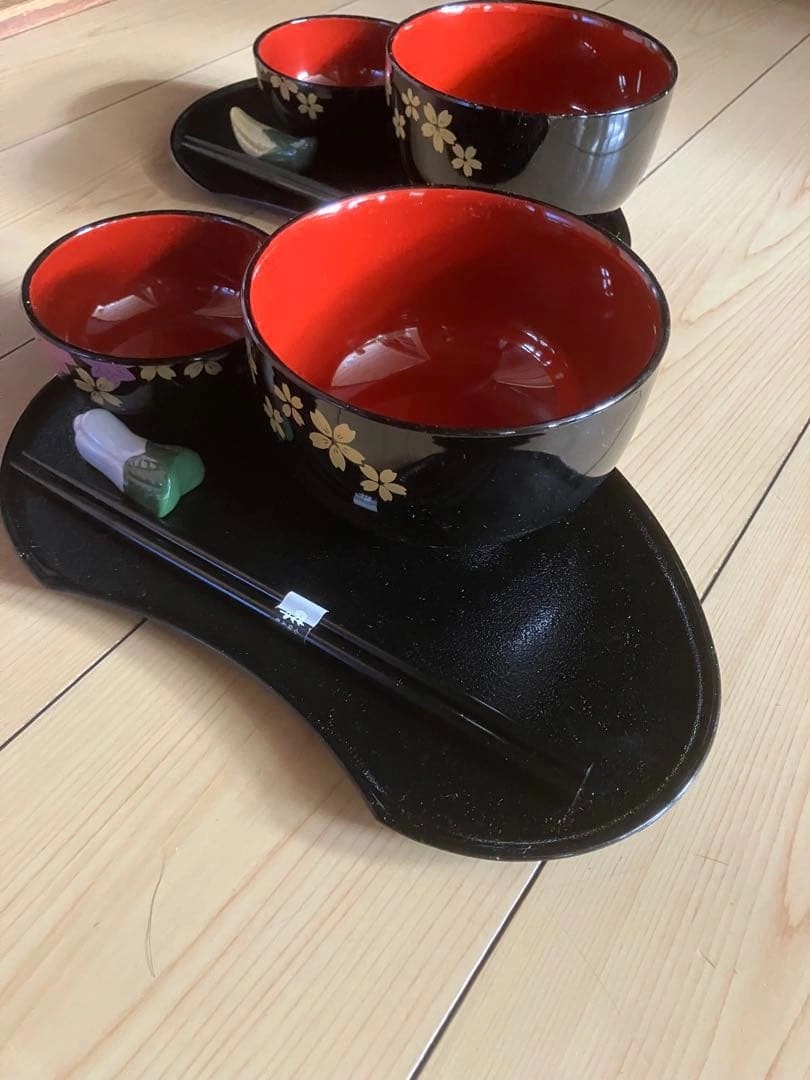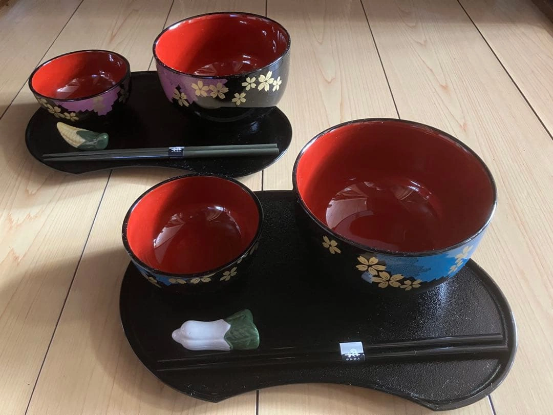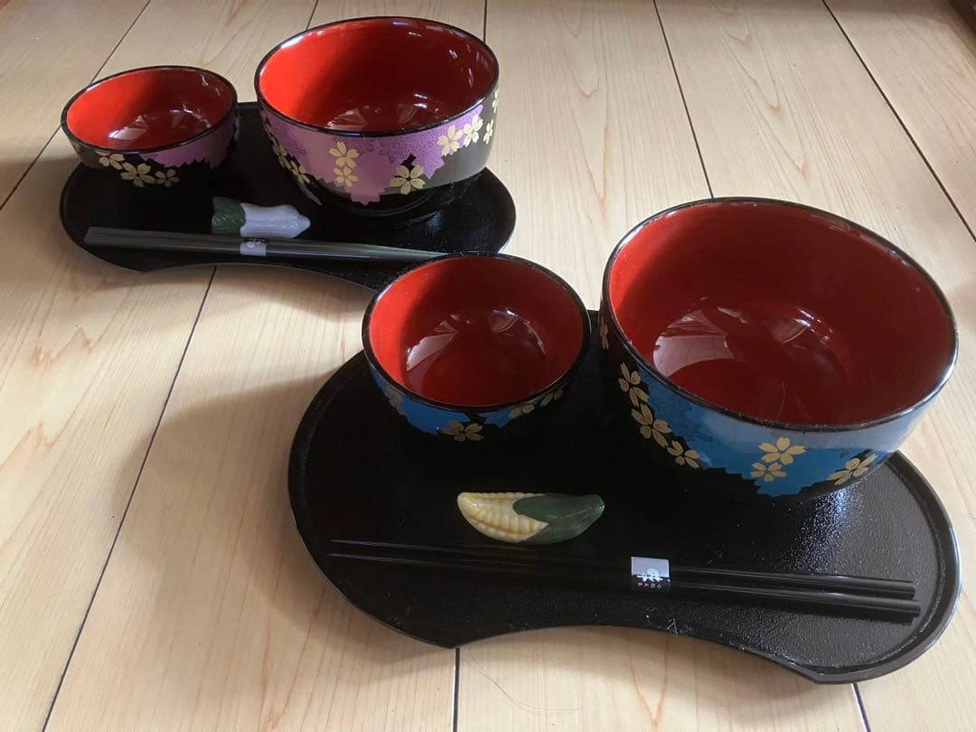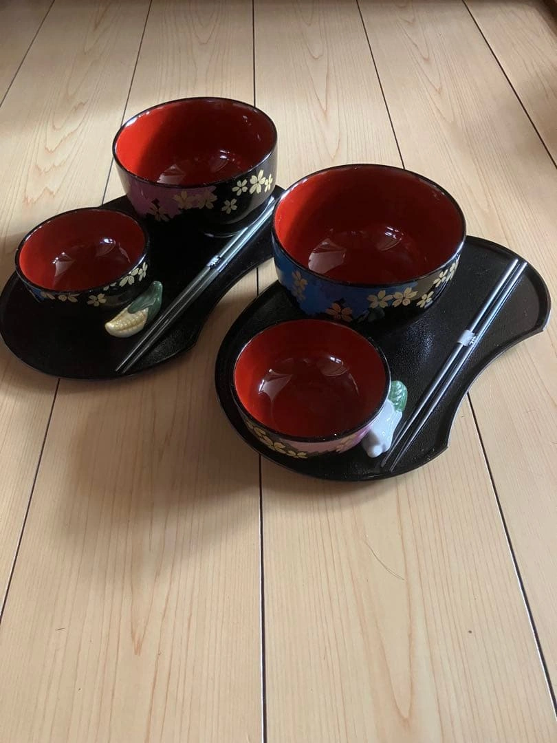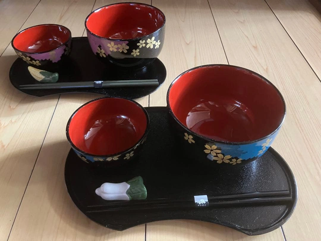 新品未使用 京雅 花友禅会席揃 ピンクとブルーの花柄デザインの和食器セットです。 - セット内容: 4つのボウルと2つのトレー 箸 箸置き 箱 - ボウルの色: ピンクとブルーに金色の花柄 - トレーの色: 黒 - 箸の色: 黒 グレー - デザイン: 花柄の装飾 - 用途: 和食用食器セット ※実家食器戸棚の中に保管されていた品です。 長期保管品につき外箱に経年劣化がありますが中身は新品未使用でした。 ご覧いただきありがとうございます。