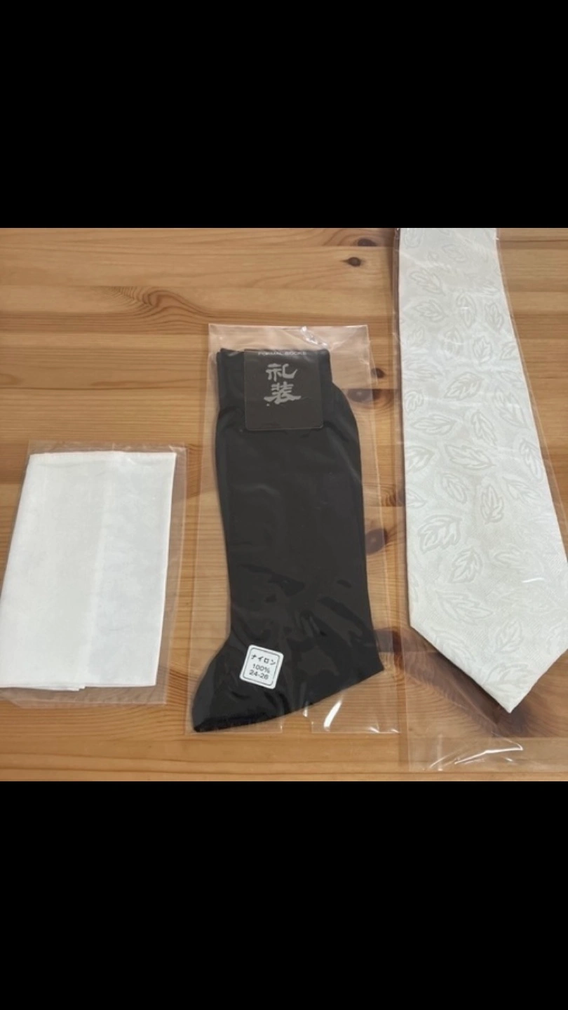 専用ケース入りの、冠婚葬祭セットです。 卒業式・入学式等々でご入用の方にも、良いかと思います。 ・ネクタイ白(織模様) ・ソックス黒24〜26cm ・チーフ白 お渡し場所:田園都市線沿線や世田谷区内であれば融通利きます。 新品未使用ですが、個人保管のため神経質な方はご遠慮ください。その他、詳細は画像の通りです。ノークレームノーリターンでお願いします。 極力スムーズな取引を心掛けます。 どうぞよろしくお願いいたします。
