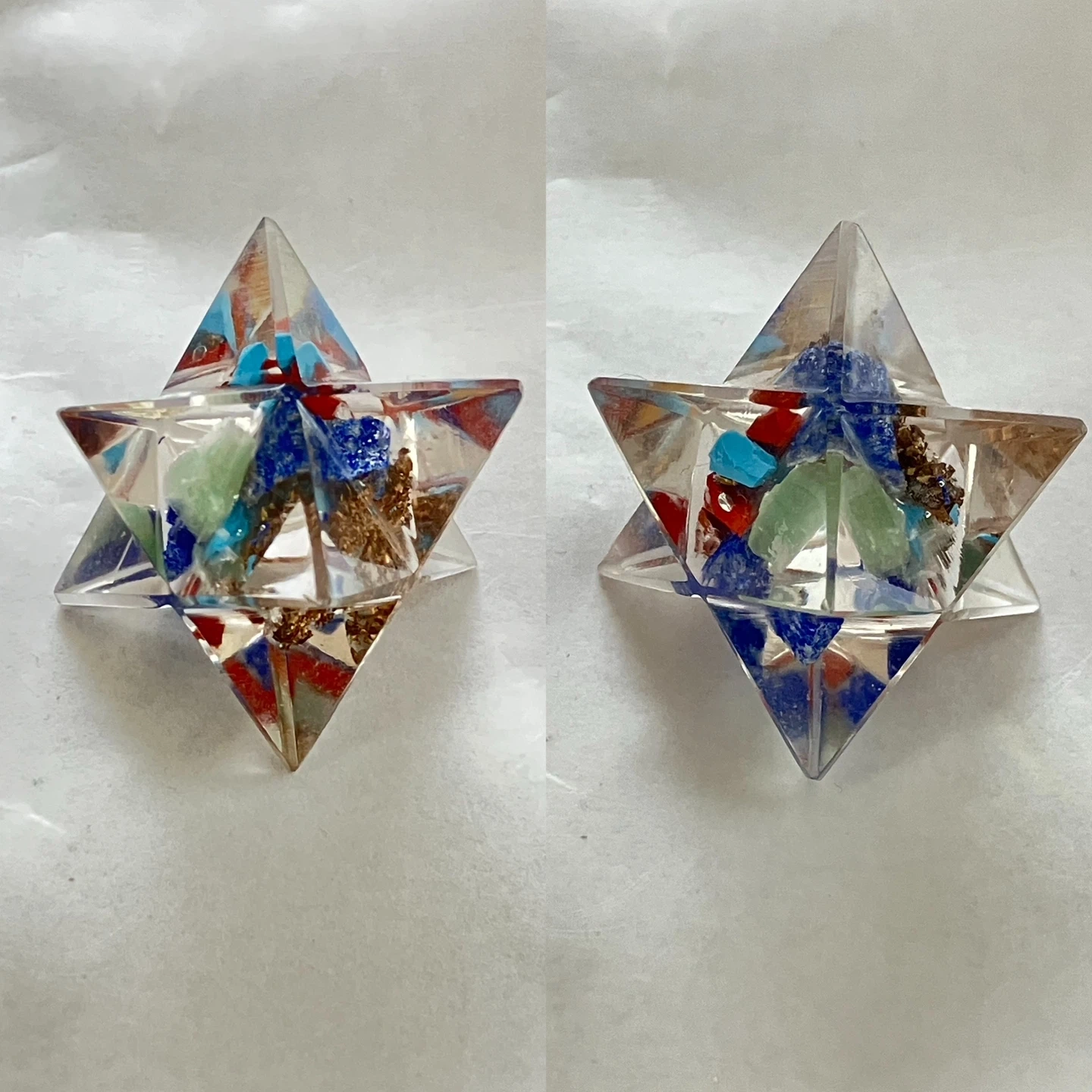 水晶 小振りです。 左から 高さ約3.8cm×幅約2cm 高さ約5.3cm×幅約2.3cm 高さ約4.5cm×幅約1.8cm ピラミッド型オブジェ ハンドメイド品なので購入した時から一箇所歪んでいました。 黒い石はテラヘルツです。 幅・奥行き約4.8cm×4.8cm 高さ約5.3cm アセンションディッシュ(同じもの2皿) アクセサリーなど作ったり購入したものを一度乗せると浄化効果があるそうです。 さざれ石を乗せるのも綺麗です。 折り目がついてますが、取扱紙あります。 直径約13.7cm さざれ石 123g 分かりづらいですが、クリアの色合いになります。 マカバスター 直径約2.3cm〜4cm 天然石(形の違うもの2個) ❶約6.5cm×5.5cm×2.8cm ❷約6.1cm×4.5cm×2.7cm ダークグレーのような色合いです。 アセンションディッシュ以外は天然石やハンドメイド品になるので世界に一つの品物です。 全て飾っていたのみですが、完全な新品をお求めの方・神経質な方はご遠慮ください。 バラ売り不可 他のサイトでも出しているのでそちらで売れた場合はこちらの投稿は削除します。 必ずプロフを読んでください。 プロフに該当する方は即ブロックしますので、読後に検討・購入してください。 購入意思のないお気に入りはご遠慮下さい。