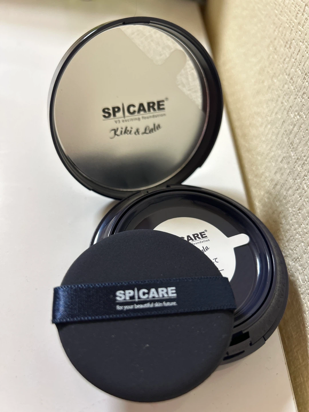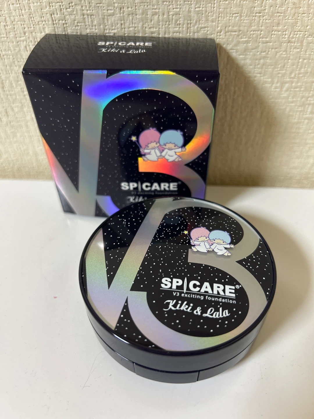 韓国🇰🇷コスメ スピケア V3 エキサイティングファンデーションのキキララ限定コラボです ・ブランド:スピケア ・商品:V3 エキサイティングファンデーション ・キャラクター:Kiki&Lala ・サイズ:15g ・韓国製 以下公式より引用 SPF37・PA++ 独自の天然微細針”イノスピキュール(※1)”配合で美肌を叶える、累計販売数633万個(※2)突破の大人気V3ファンデーション第一弾!「ヒト臍帯血細胞順化培養液(※3)」をコーティングしたイノスピキュールが、有用成分をしっかりと長時間にわたり肌に届け(※4)、ハリとうるおいに満ちたすこやかな肌をもたらします。 一人ひとりの持つ、本来の肌色を引き立てる原料配合と発酵技術によりカラー展開は1色のみ。使う人それぞれの肌に自然となじみ、美しいツヤ感のある肌へ。毎日のメイク時間をエステケアタイムに昇華させる「エステファンデーション」です。 ※1 加水分解カイメン(整肌) ※2 2025年11月末時点 ※3 整肌 ※4 角層まで ゆめ星雲の思いやり星で生まれた双子のきょうだい星「リトルツインスターズ」にぴったりの、星がまたたく冬の夜空をイメージしたスペシャルなケース。美しい夜空に浮かぶ「V3」のロゴに、ちょこんと腰をかけたキキ&ララが印象的な可愛らしいデザインです。ネイビーを基調にした大人可愛いケースで、メイク直しのたびにハッピーな気分に。 高保湿下地入らずのクッションファンデです 定価 9350円 現在ネット取引価格は2700〜3900円 神経質な方はご遠慮ください✨