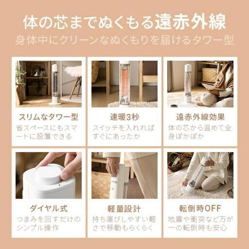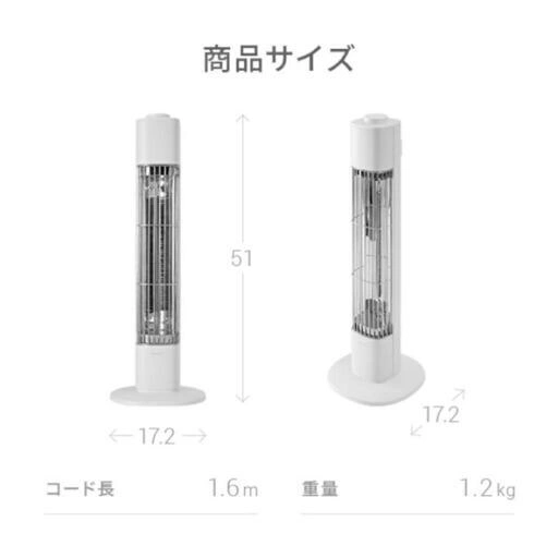 新品・未開封です。 色はホワイト。 購入したものの他の暖房器具しか使用していないため、未使用のうちに出品します。 ※当方の自宅付近でのお渡しとなります。 ※未開封品ですが、神経質な方はご遠慮ください。 ※単品での値下げは考えていませんが、まとめ買いで値下げ可能です。 サイズ(約) 本体:幅17.2×奥行き17.2×高さ51cm コード長:1.6m 重量(約) 1.2kg 仕様 電源:AC100V 50/60Hz 消費電力:400W 安全装置:転倒OFFスイッチ/サーモスタット 130℃
