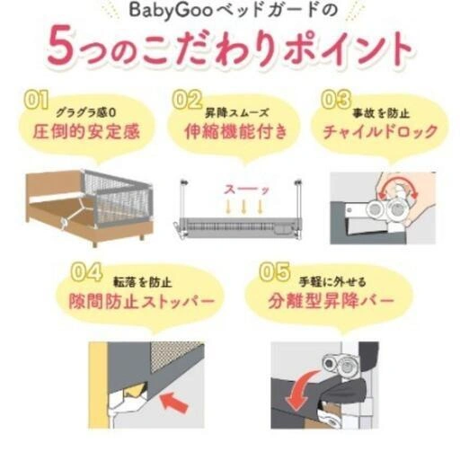 BabyGooのベッドガードです。 新品未使用。 150センチが1辺のみです。 カラーはグレーです。 商品の詳細は下記をご覧ください。 https://item.rakuten.co.jp/valueprice/bedguard2/?scid=wi_ich_androidapp_item_share 17時頃まで自宅近くまで取りに来ていただける方お願いします。 それ以外の時間は要相談です。 ベビーグー Baby Goo ベッドガード ベッドサークル ベッドフェンス ベビーベッド ご希望の方はお気軽にご連絡ください。