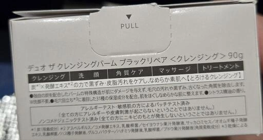 定価3960円 バラ売り可能です! 新品未開封、暗所にて保管していました。 自宅保管品ということをご理解の上お買い求めください。 外箱は細かい傷がございます。 毛穴の黒ずみ*1や皮脂・ザラつき悩みに特化したとろけるクレンジング。 DUO独自開発「ブラックパウダー*2」と活性炭が、メイクはもちろん皮脂や角栓などをやさしく除去し、毛穴の奥までスッキリ洗い上げます。また発酵成分*3が美肌へトリートメント。テカリを防いでなめらかな肌へ導きます。 *タンパク汚れ、角栓汚れを落とすこと *1 タンパク汚れ、角栓汚れなどによる *2 炭(吸着成分) *3 アスペルギルス/コメ発酵エキス(角質柔軟成分) 【使用方法】 手肌が乾いた状態で、適量(専用スパチュラにさくらんぼ大)を手に取り、顔の中心から外、下から上へマッサージするように全体になじませます。 小鼻、目元、口元などの汚れが溜まりやすい部分は指の腹を使って優しくクルクルと円を描くように。 その後、ぬるま湯で20~30回程度ていねいに洗い流してください。 W洗顔は不要です。マツエクOK! 外箱サイズ 約9×9×4.5cm #DUO ご希望の方はお気軽にご連絡ください。