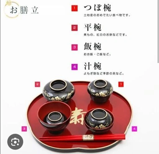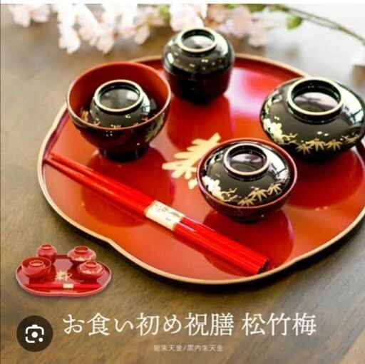 生後100日目か120日目に赤ちゃんの成長を祝い、一生食べ物に困らないよ うにとの願いを込めて祝う儀式がお食い初めと呼ばれます。 (セット詳細) 飯椀、汁椀、つぼ椀、平椀、お盆、お箸 新品未使用で撮影と確認のため1個だけ開封しました。可愛くて購入したものの、子供のお食い初めの時期が終わっているのでお譲りできたらと思います。ご希望の方はお気軽にご連絡ください。