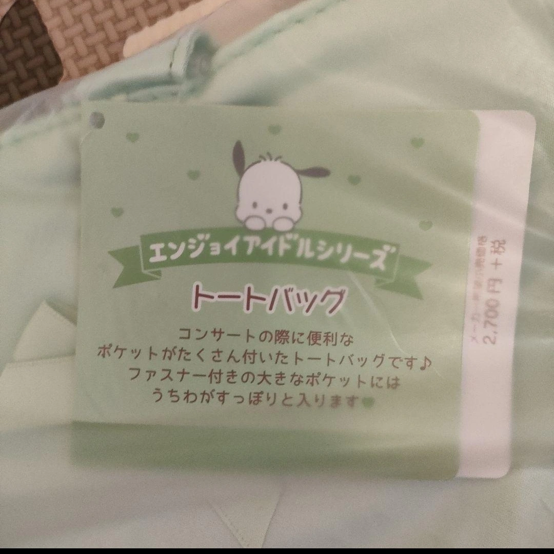 サンリオの人気キャラクター、ポチャッコのトートバッグです。日常使いだけでなく、コンサートなど特別なイベントにもぴったりです。 未使用・未開封です。 【機能性】 コンサートなどの際に便利なポケットが多数付いており、ファッション性と実用性を兼ね備えています。ファスナー付きの大きなポケットにはうちわがすっぽりと入ります。 【デザイン】 ミントグリーンの生地にリボンが施されており、可愛らしさを引き立てます。Pochaccoの刺繍も施されており、ファンにはたまらないアイテムです。 - ブランド: Pochacco - 色: ミントグリーン - デザイン: リボン付き - タイプ: トートバッグ 特徴...縦長, マチなし 他にもサンリオグッズ取り扱っております。 まとめ買いの場合はお値段ご相談ください。