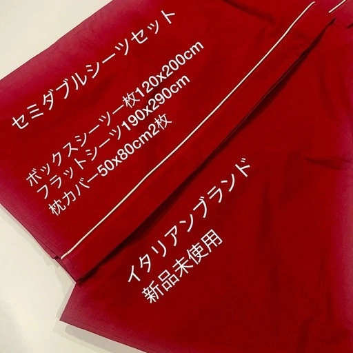イタリアンブランドの新品未使用シーツセットです。セット内容はボックスシーツ、フラットシーツ、枕カバー2枚となります。 1セットの価格で提示していますが、2セット在庫があります。 - セット内容: ボックスシーツ120×200cm、フラットシーツ190×290cm、枕カバー50×80cm×2枚 - ブランド名: Blanc MariClo - 色: ワインレッド お取り引き場所は、ノット東京(新宿)、大江戸線・西新宿五丁目駅、都営新宿線・初台駅東口のいずれかでお願いしたいです。 日時のご希望2択ほどと共にご連絡をお願いします。
