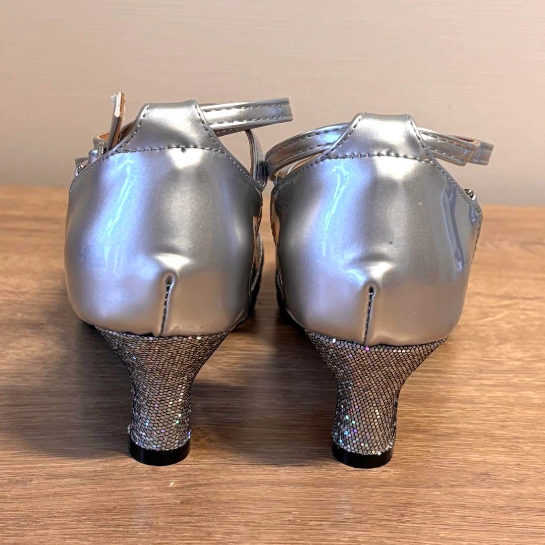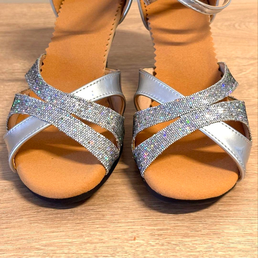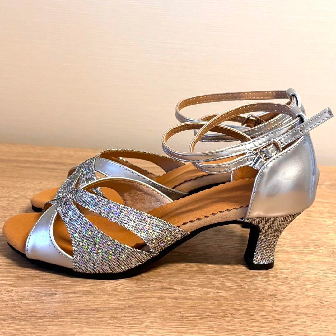 シルバーが煌めくラテンシューズ 足指をしっかりホールドし、 ローヒールで踊りやすいです! ソールはゴム製となっております。 回転の多いサルサ、ラテンよりは、 ジャズやポールダンスなどが向いております。 ステップの練習や、バチャータ等には お使いいただけるかと思います。 その他、室内パーティー用にも最適です。 サイズ37 (ヨーロッパサイズ) 日本サイズは、23.5cmです。 ヒール高さ5.5cm 状態 新品未使用品ですが、保管による 傷など、多少ある場合がございますが、 見た目やお使いいただく分には問題ございません。 ヨーロッパやその他海外にて、 自分用に購入した物で使わなくなったものや、 仕入れしたものを販売しておりす。 当方、ダンスをするので、ダンス関連の 発表会やクラブ、パーティー、練習等で未使用品や 数回着用のみの衣類も出品しております。 宜しければ、ご覧下さい ご希望の方はお気軽にご連絡ください。