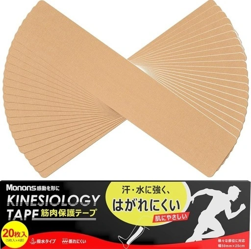 あらかじめカットされたプレカットテーピングテープなので、ハサミ不要でサッと使えます。初心者でも簡単に扱えるかと思います。 伸縮バランス設計により、関節や筋肉の動きにしなやかにフィットします。締め付けすぎず、自然な動きを妨げないため、サッカー、バスケットボール、バレーボール、テニス、ゴルフ、マラソンなど幅広いスポーツで使用できます。 撥水加工により、汗や水に濡れてもはがれにくく長時間の粘着力をキープします。 柔らかな綿素材とウェーブ加工により、通気性を確保し肌へのこもりや蒸れ感を軽減します。 ジョギングやランニングなどの日常運動から、サッカーやバスケなどの激しいスポーツまで幅広く対応します。 ご希望の方はお気軽にご連絡ください。