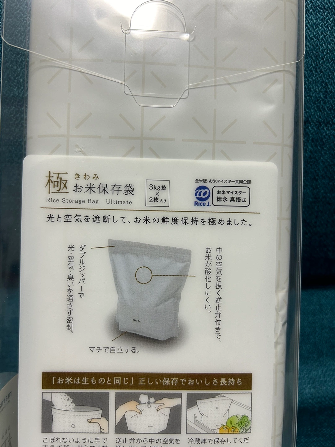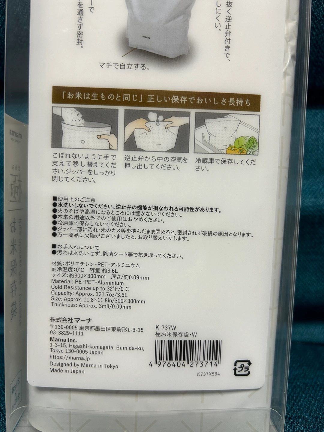 お米高騰につき きちんと保存致しませんか?大切なお米です マーナ (marna) 極 お米保存袋 (アルミ袋/ジッパー付き袋/ホワイト) 米 保存袋 米袋 (冷蔵庫保存) お米 保存容器 米びつ K737W 色:ホワイト_パターン名:単品 【3層構造でお米の鮮度を保つ】お米のプロと共同開発したお米の専用保存袋です。光・空気・臭いを遮断するアルミを挟んだ三層構造で、お米の鮮度を保ちながらお米を美味しく保存できる袋です。 【ダブルジッパー、逆止弁付きでしっかり密封できる】空気をしっかり抜いて、二重になったジッパーを指先でつまんで閉じるだけです。さらにふくろを閉めて手でおさえこむと、中の空気をぬくこ とできるので、空気が逆戻りするのを防げて酸化しにくくなります。 【袋タイプで場所取らずに収納】お米の量に合わせて省スペースで保存できます。そこがマチ付きデザインのため、自立することができて、冷蔵庫の中でも収納しやすくお米を取り出す時にも簡単です。 【ご家族や一人暮らしにもおすすめ】約3.6Lの容量でご家族や一人暮らしにもおすすめ。汚れは水洗いせず、除菌シート等で拭き取ってください。 【材質】ポリエチレン PET アルミニウム【容量】約3.6L【耐冷温度】約0℃【生産国】日本製