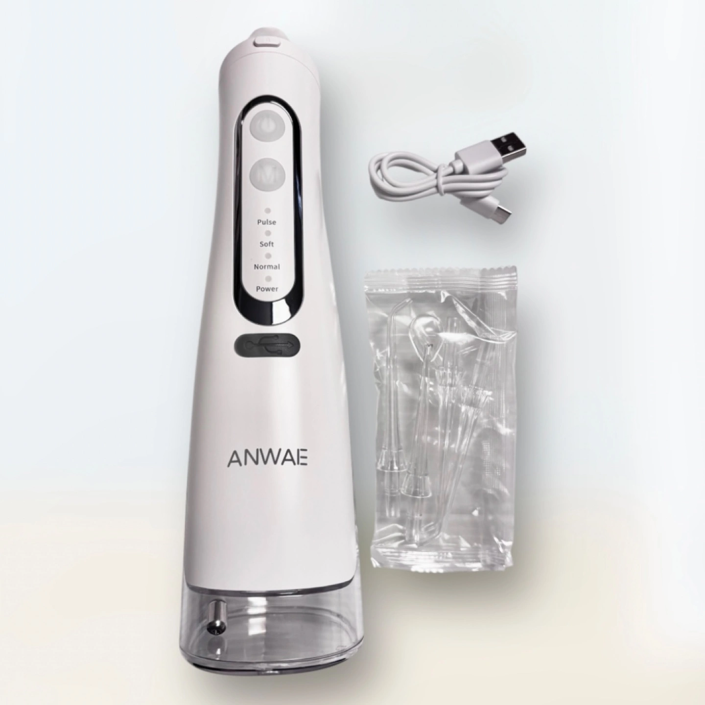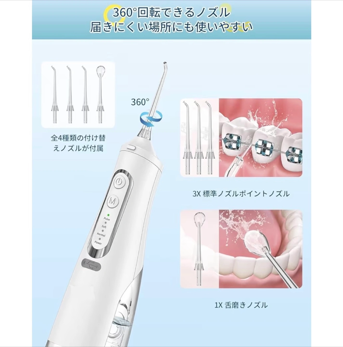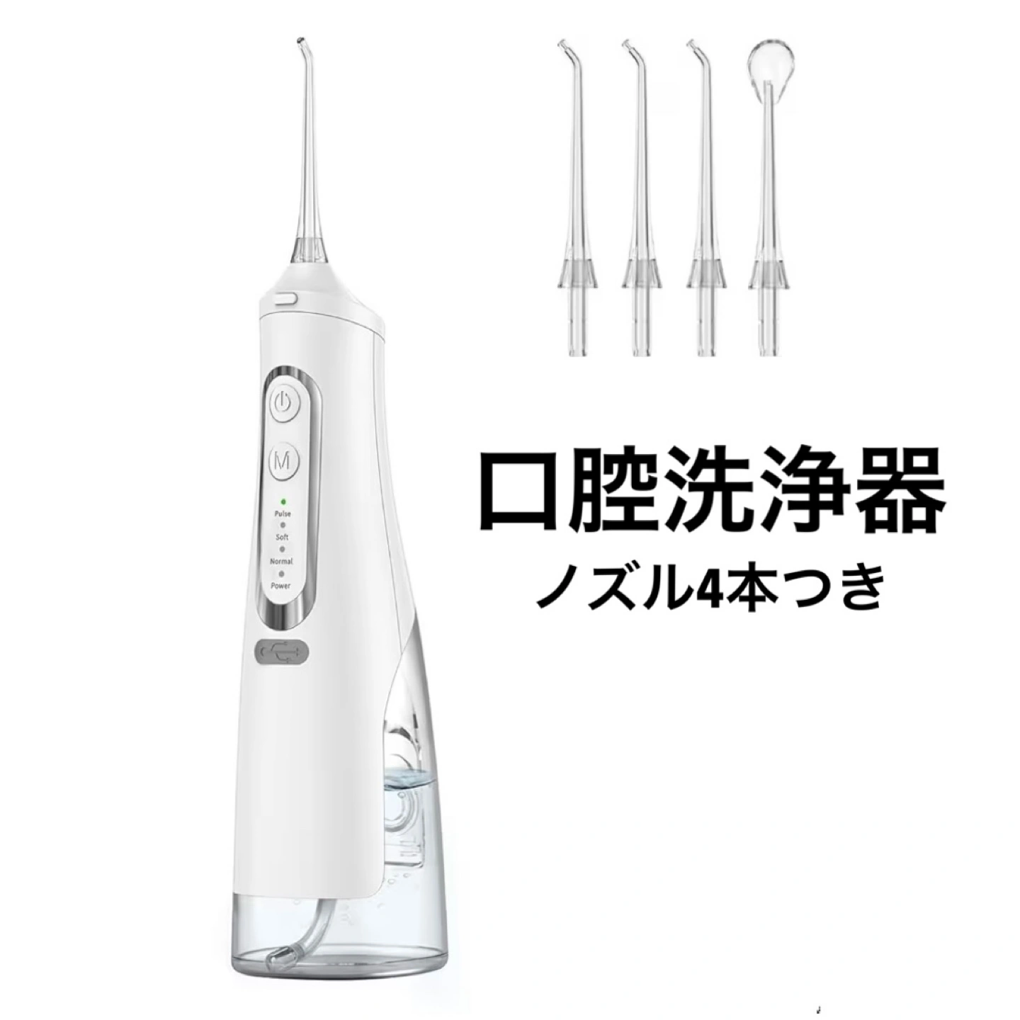 【情報】 ブランド:ANWAE 商品名:口腔洗浄器 型番:M209 サイズ:241×84×70mm 充電方式:Type-C 【付属品】 USBケーブル、ノズル4本 口腔洗浄器 ジェットウォッシャー 替えノズル4本つき 新品未使用 ●多様な水流モード : パルス、ソフト、標準、強力の4つの水圧モード。 ●全方位(360度)回転ノズル ● 交換用ノズルつき(標準ノズル3本、舌クリーナーノズル1本) ●IPX7の防水基準 ●1500mAhの高容量バッテリーを搭載(Type-Cで2時間の急速充電により約40回使用可能) ● タンクは310ml。一度満タンにすれば約2分間の連続洗浄が可能。 ●持ち運び可能なワイヤレスタイプ ●水切れ保護機能: タンクの水がなくなると、短時間で機器は自動的に動作を停止。