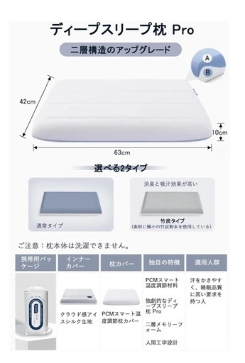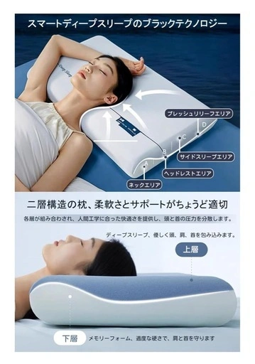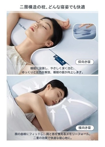 【理想的な寝心地を追求した2層構造】この枕は、2層構造により、柔軟さとサポート力を兼ね備え、個々の体型にぴったりフィットします。体圧を分散し、首や肩への負担を軽減。理想的な寝心地を実現します。 【一年中快適な睡眠を実現】枕本体には竹炭が練り込まれており、気になるニオイを抑え、余分な湿気を吸収。清潔で衛生的な睡眠環境を保ちます。さらに、枕カバーには最新の宇宙技術を応用したPCM相変化材料を使用。体温に合わせて熱を吸収・放出し、季節を問わず快適な眠りを実現します。 【選べる快適な触感の枕カバー】枕カバーは両面仕様。片面は100%綿素材で肌に優しく柔らか、もう片面はブルーの滑らかな素材で、心地よい触感を提供します。お好みに合わせて使い分けが可能です。 【どんな寝姿勢にも対応】大きめの枕は仰向け寝だけでなく、横向き寝やうつ伏せ寝にも最適。首や肩を優しく支え、自然なカーブをサポートします。 ご希望の方はお気軽にご連絡ください。