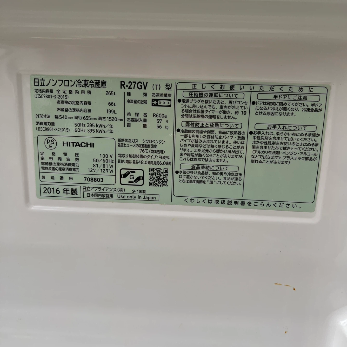横浜市内であればプラス1,000円で配達可能です! 予定が合えば多少離れたエリアでも配達可能です。 ※その他地域はコメントにてご相談くださいませ! 2016年式 265L 日立 冷蔵庫 R-27GV ◆製品情報 ・まんなか野菜室のコンパクトな3ドアタイプ ・脱臭機能あり ・使いやすい3ドア冷蔵庫 年式:2016年製 容量:265L メーカー:日立 型式:R-27GV サイズ:540×625×1495mm (幅×奥行×高さ) 3方合計:266cm 質量:約56kg 使用に伴う傷や汚れ、ヘコミ等はありますがまだまだ使用可能です! 中古品をご理解の上ご検討下さいませ!