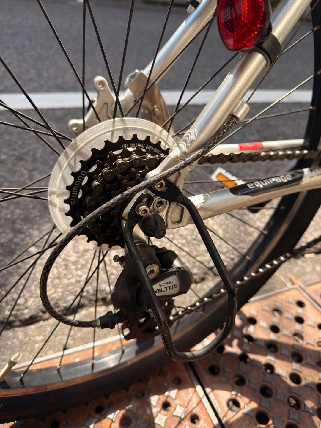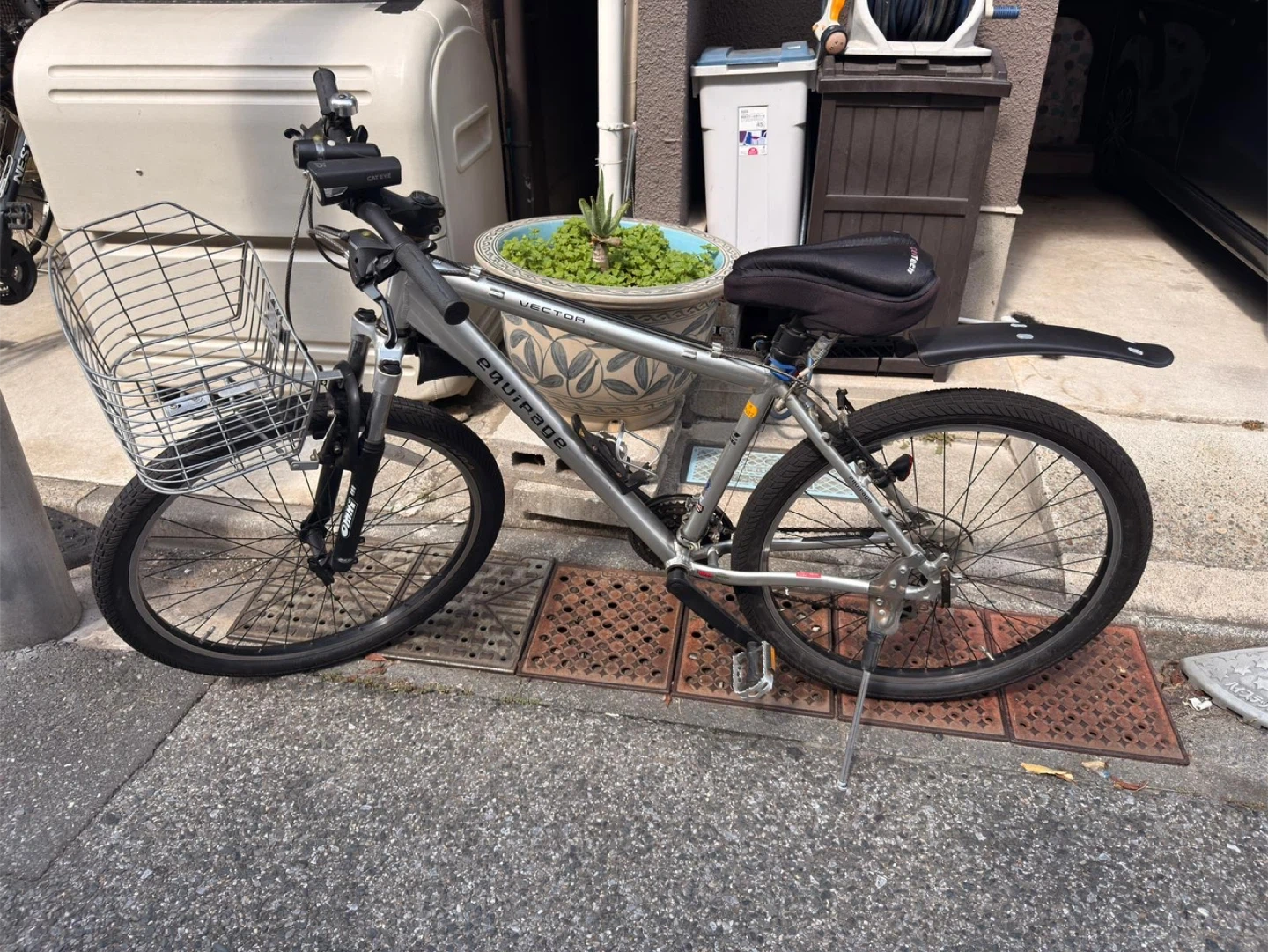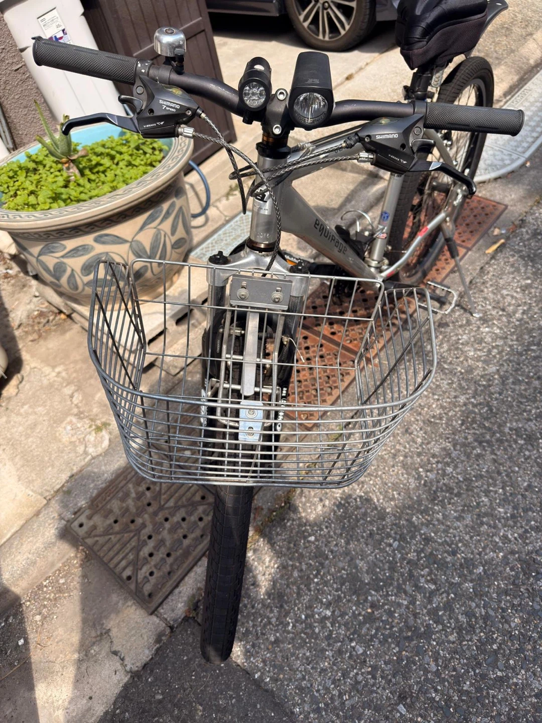 サイクルベースあさひのプライベートブランド「equipage (エキパージュ)」のマウンテンバイク(MTB)、「VECTOR (ベクトル)」です。 街乗り仕様にカスタムしてあるため、日常使いに最適です。 【商品の状態】 • 2年ほど前に新車で購入し、近所への買い物などで使用していました。 • 保管環境: 屋根付き駐輪場にて保管。 • 汚れ: 使用に伴う小傷やサビはありますが、走行には問題ありませ   ん。全体的には比較的きれいな状態かと思います。 【カスタム内容・装備】 • フロントバスケット(カゴ): 大きめのカゴを装備しており、買い物に便利です。 • 泥除け(前後): 雨天時も安心です。 サイドスタンド: 駐輪が楽です。 • フロントサスペンション: 街中の段差も衝撃を吸収し快適です。 • ギア: シマノ製 21段変速(3x7速) 要望があれば、ワイヤー錠お付けします。