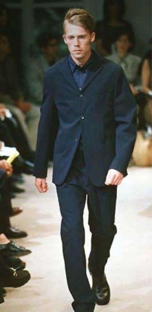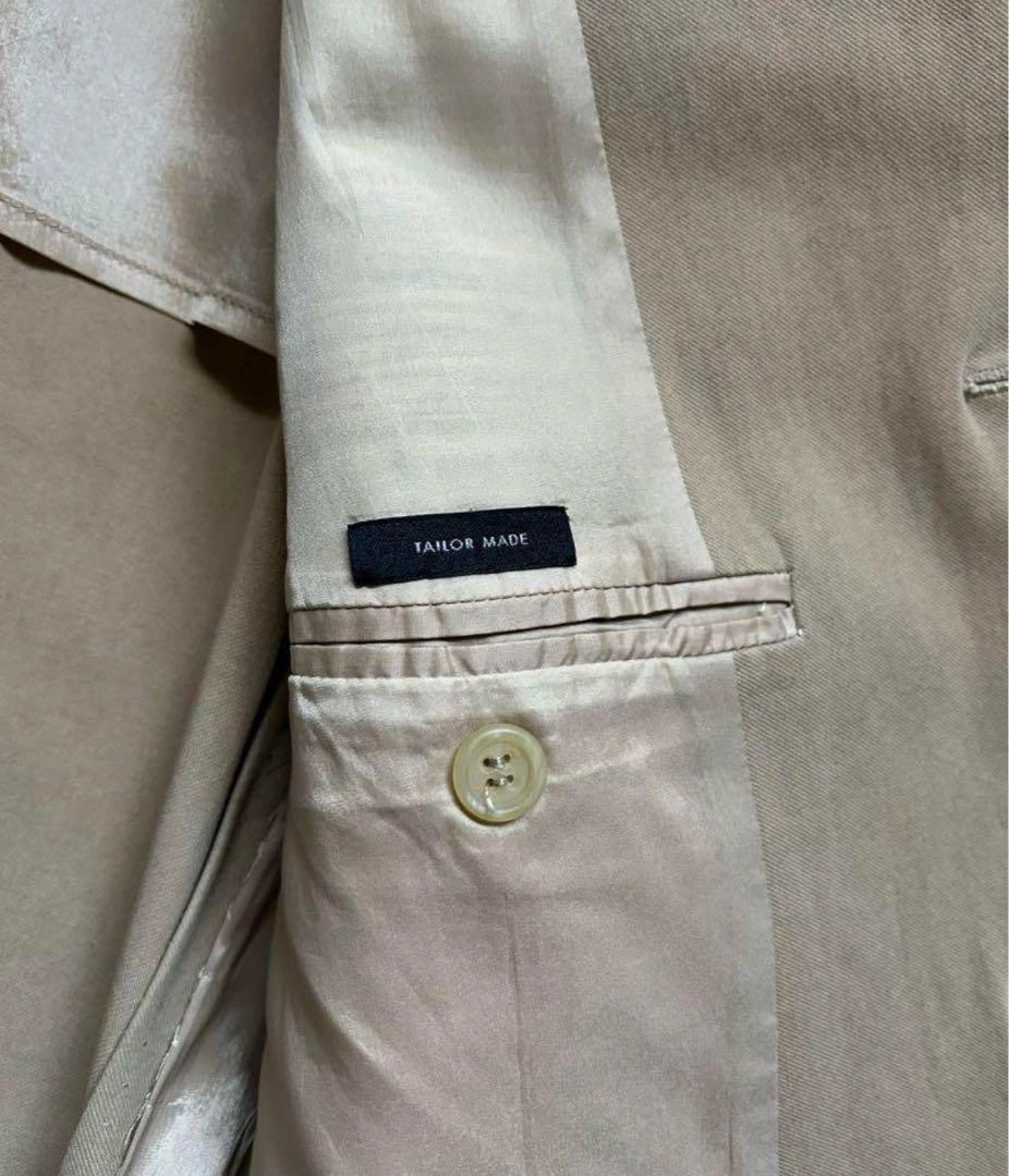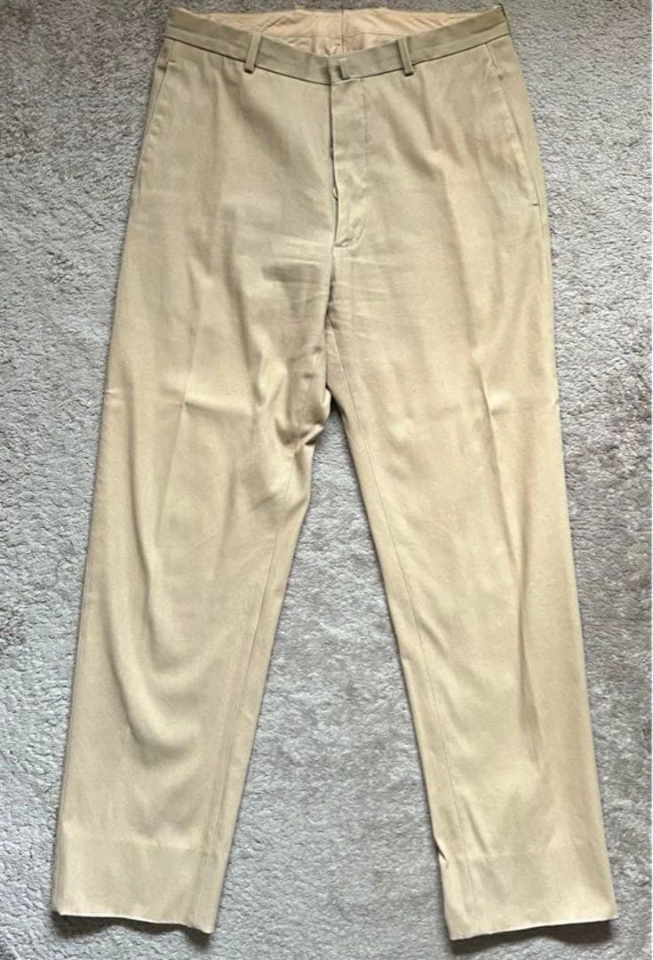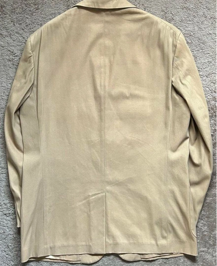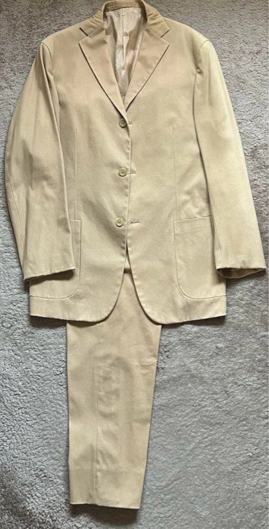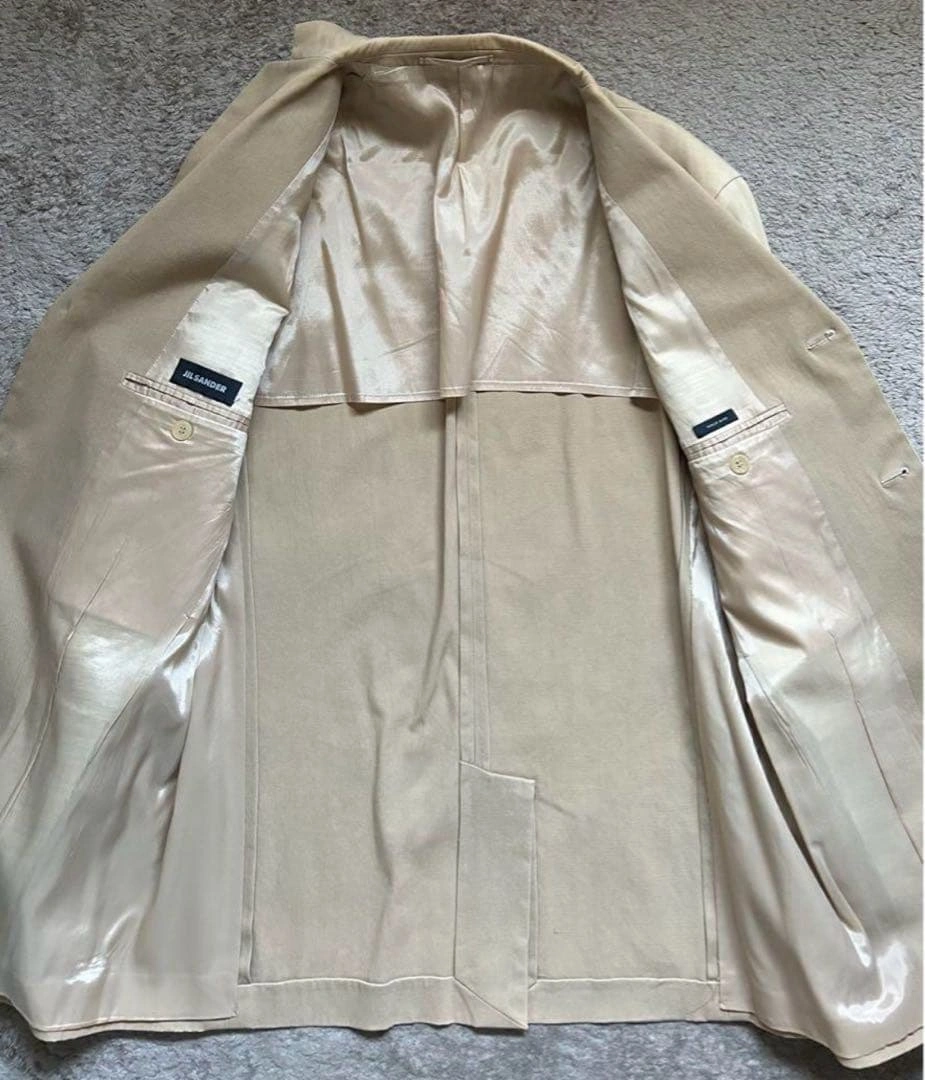 ジルサンダー本人時代の春夏用スーツです。 ドロップ0(ウエストシェイプなし) ジルサンダー独特のややボックス気味のシルエット。 着心地は最高で流石のカッティングです。 2枚目の写真は色違いですが、イメージのご参考に。 ぱっと見は特に目立ちませんが、若干の小さなシミ、左袖にやや色褪せた感じがあります。 また年代物ですので古着独特のにおいが少しありますが、そこまで神経質な方でなければ、かなりお買い得かと思います。 ◼︎素材 コットン×ナイロン×ポリウレタン ※厚手のコットンで、ややストレッチ感があります 表記サイズ R46(ジャケットは48サイズの方でも着用問題ないと思います) ◼︎ジャケット 肩幅···47cm 身幅···50cm 袖丈···60cm 着丈···77cm ◼︎パンツ ウエスト 39㎝ 股上 27㎝ 股下 73.5㎝ 裾幅 19㎝ カラー···ベージュ ご希望の方はお気軽にご連絡ください。