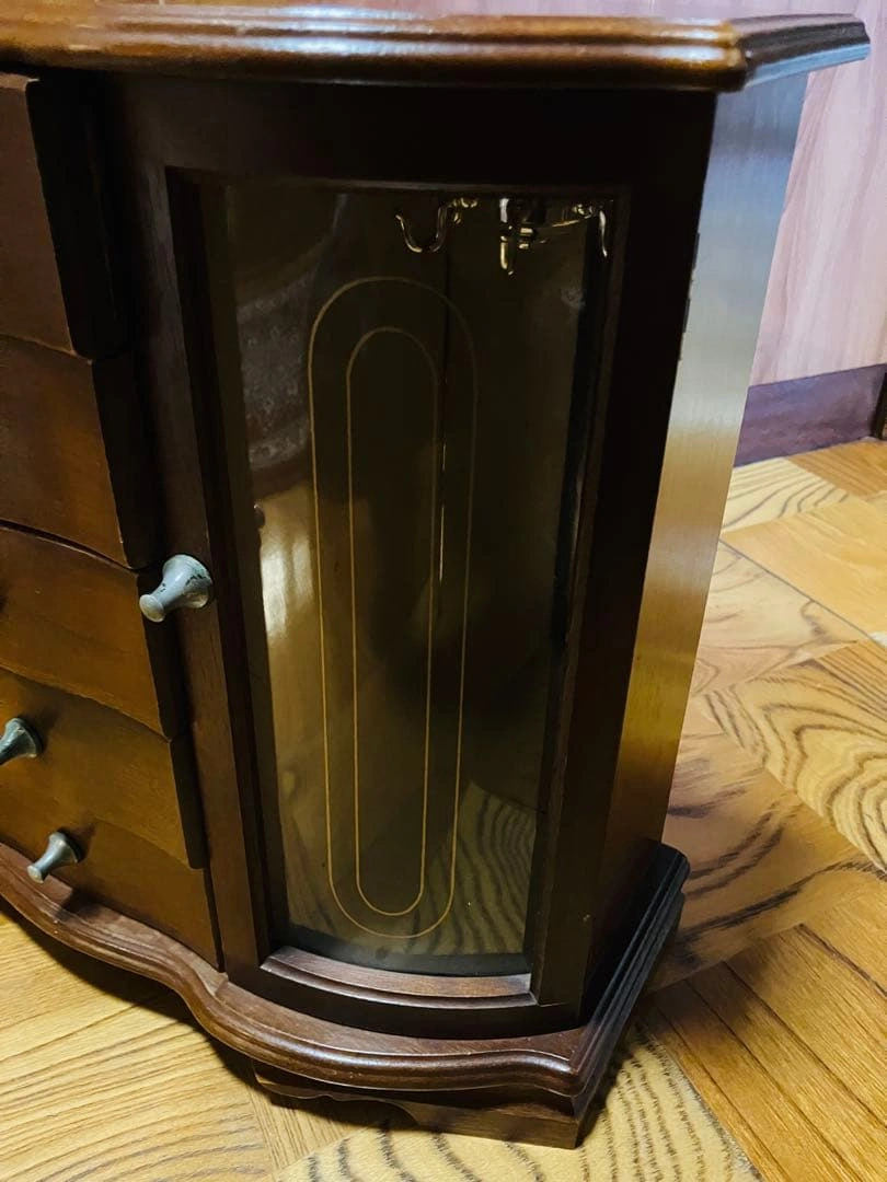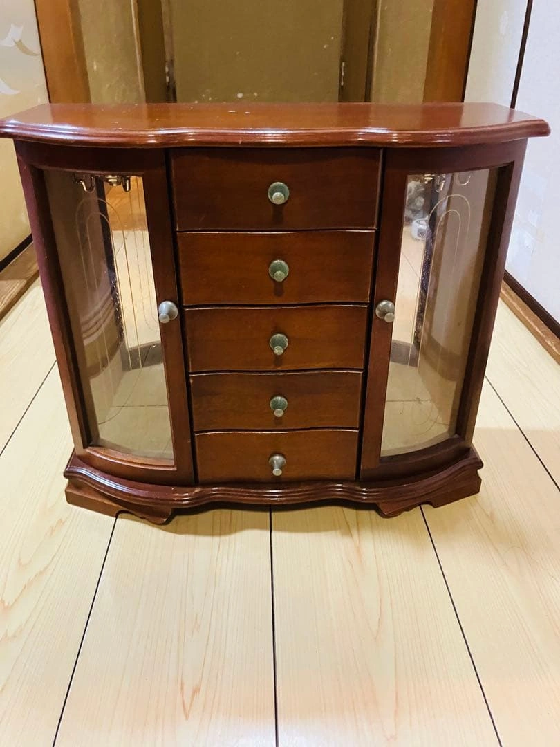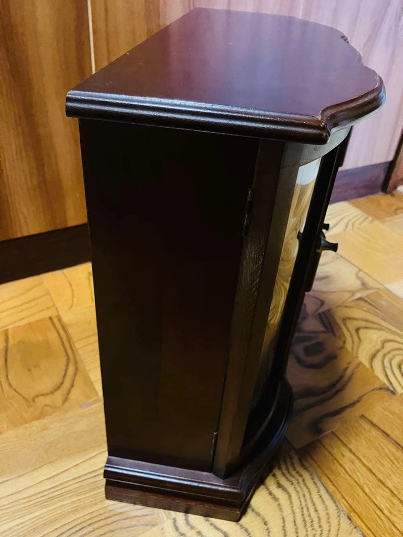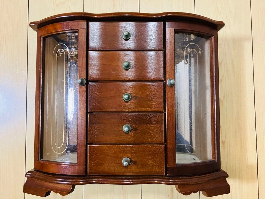 昭和レトロ、木製の5段アクセサリーケースです。ジュエリーケースや宝石箱としても。オルゴール付き。 - タイプ: アクセサリーケース、ジュエリーケース - 素材: 木製 - 寸法: 概寸 約 縦35cm 横41cm 奥行き16cm - 引き出し数: 5 - カラー: ブラウン 昭和時代の古い物です。両開きで中央に5段の引き出し、左右にネックレスハンガー、鏡付き。引き出し一番下はリング用(写真18枚め)。 ⭐️引き出し1番下を開けるとオルゴールが鳴ります(写真11枚め)。オルゴール動作確認済み。裏側にオルゴール巻き(写真17枚め)があります。 ※以下、難点です。 目立つ大きな凹みや汚れ傷はありませんが全般的な経年劣化(小傷、傷み、汚れ等)が見られます。左右扉を開けた下の部分に汚れがあります(写真19.20枚め)。写真13枚めの黒いシミのように見える箇所は清掃の際の液体によるもので実際にはありません。風合いを損なわないためリペイントなどはしていません。アンティーク、ヴィンテージのディスプレイにいかがでしょう。 以上ご理解ご了承のうえ、お求めをお願いいたします。