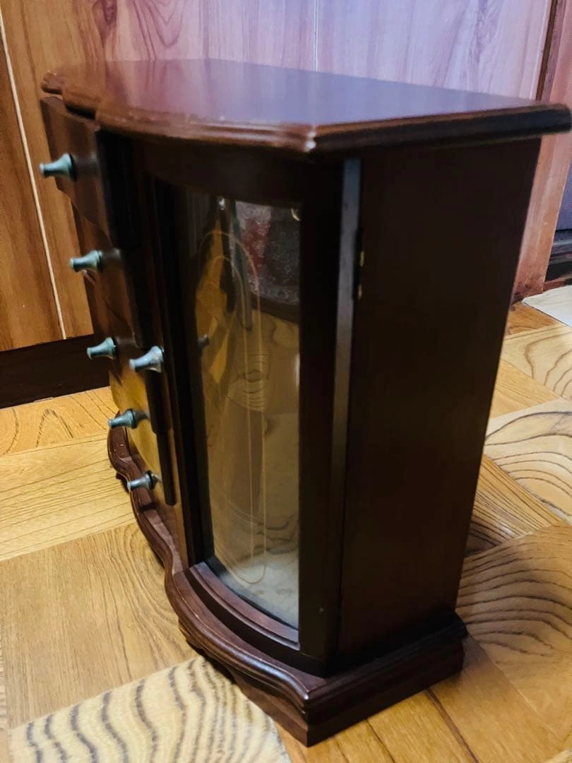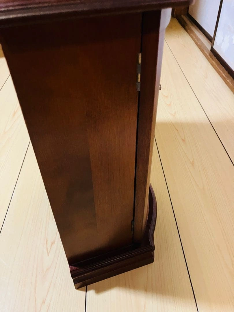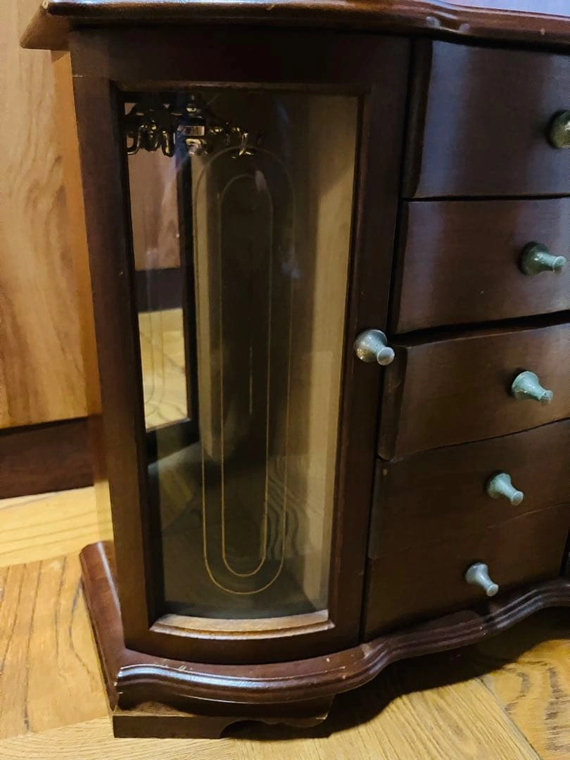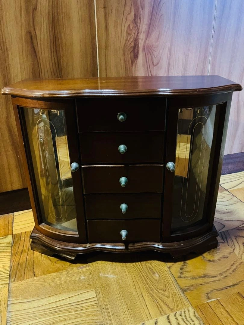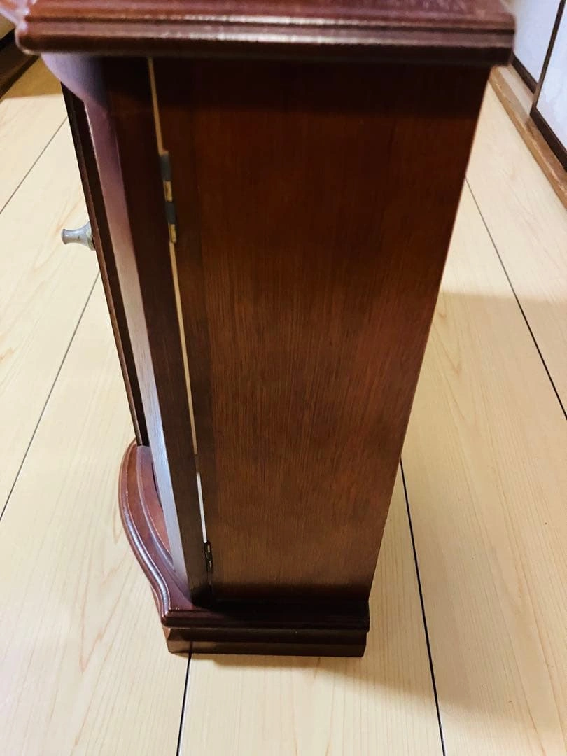 昭和レトロ、木製の5段アクセサリーケースです。ジュエリーケースや宝石箱としても。オルゴール付き。 - タイプ: アクセサリーケース、ジュエリーケース - 素材: 木製 - 寸法: 概寸 約 縦35cm 横41cm 奥行き16cm - 引き出し数: 5 - カラー: ブラウン 昭和時代の古い物です。両開きで中央に5段の引き出し、左右にネックレスハンガー、鏡付き。引き出し一番下はリング用(写真18枚め)。 ⭐️引き出し1番下を開けるとオルゴールが鳴ります(写真11枚め)。オルゴール動作確認済み。裏側にオルゴール巻き(写真17枚め)があります。 ※以下、難点です。 目立つ大きな凹みや汚れ傷はありませんが全般的な経年劣化(小傷、傷み、汚れ等)が見られます。左右扉を開けた下の部分に汚れがあります(写真19.20枚め)。写真13枚めの黒いシミのように見える箇所は清掃の際の液体によるもので実際にはありません。風合いを損なわないためリペイントなどはしていません。アンティーク、ヴィンテージのディスプレイにいかがでしょう。 以上ご理解ご了承のうえ、お求めをお願いいたします。